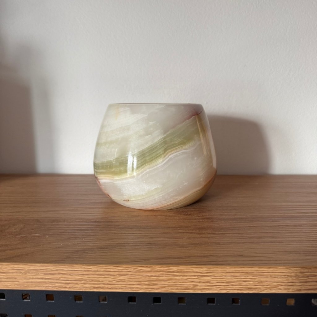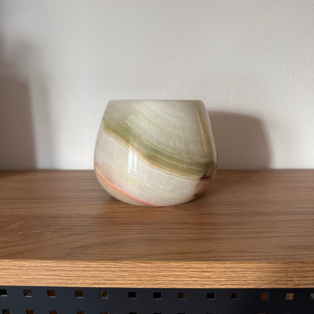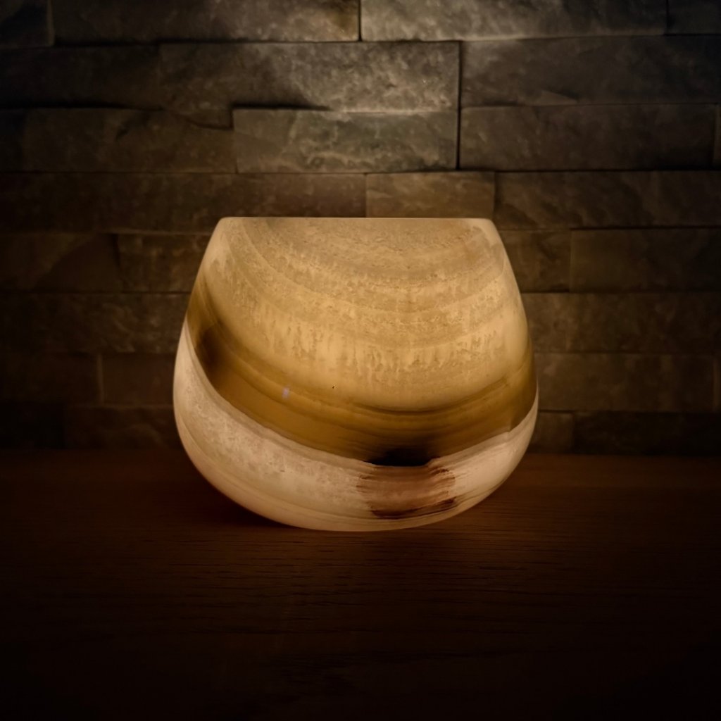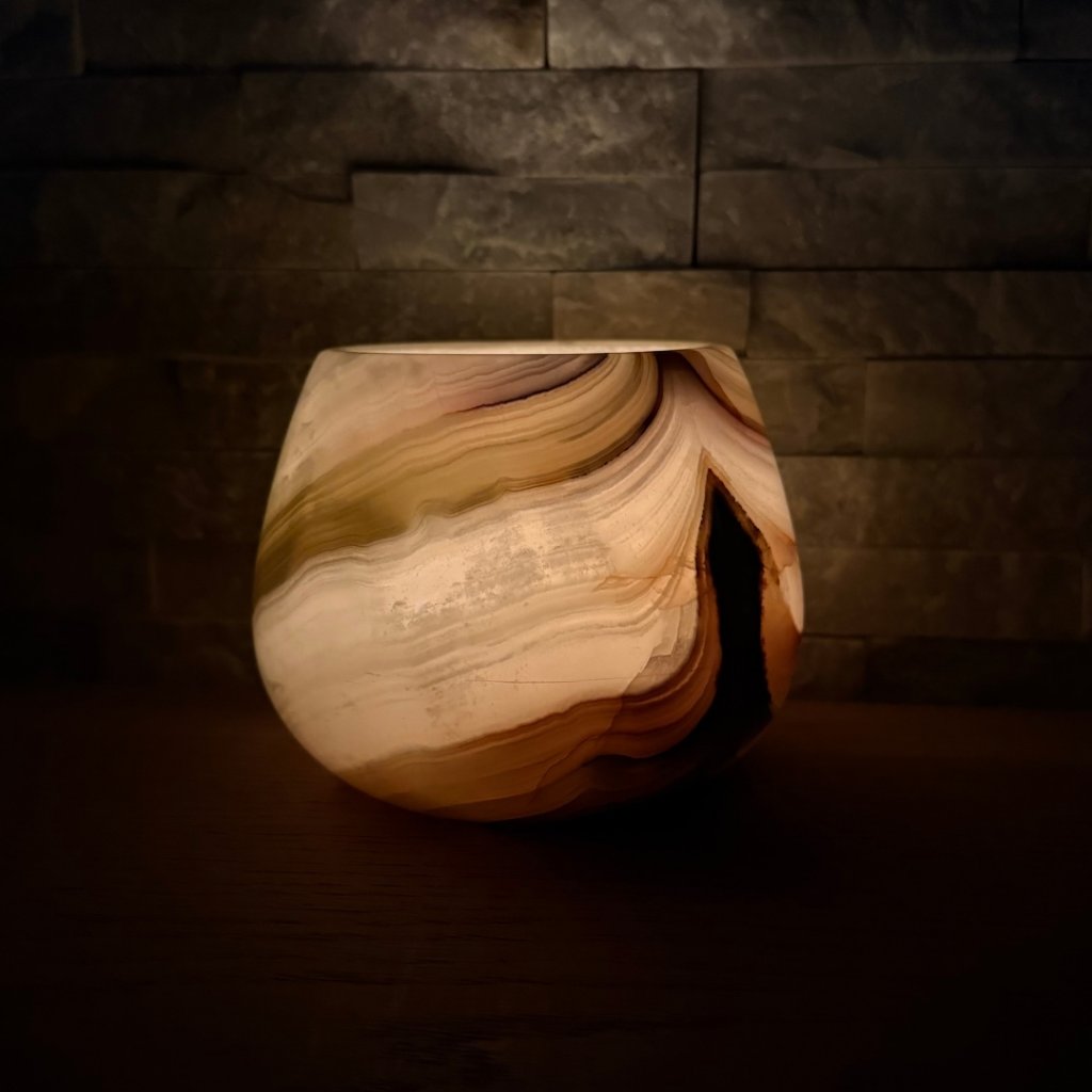 Svícen je vyroben z přírodního aragonitu, známého také jako pákistánský onyx. Tento kámen vyniká pevností, jemným leskem a přirozenou kresbou, která vznikala po tisíce let. Kupujete přesně ten svícen, který vidíte na fotografiích, žádný náhodný výběr, ale konkrétní originální kus.