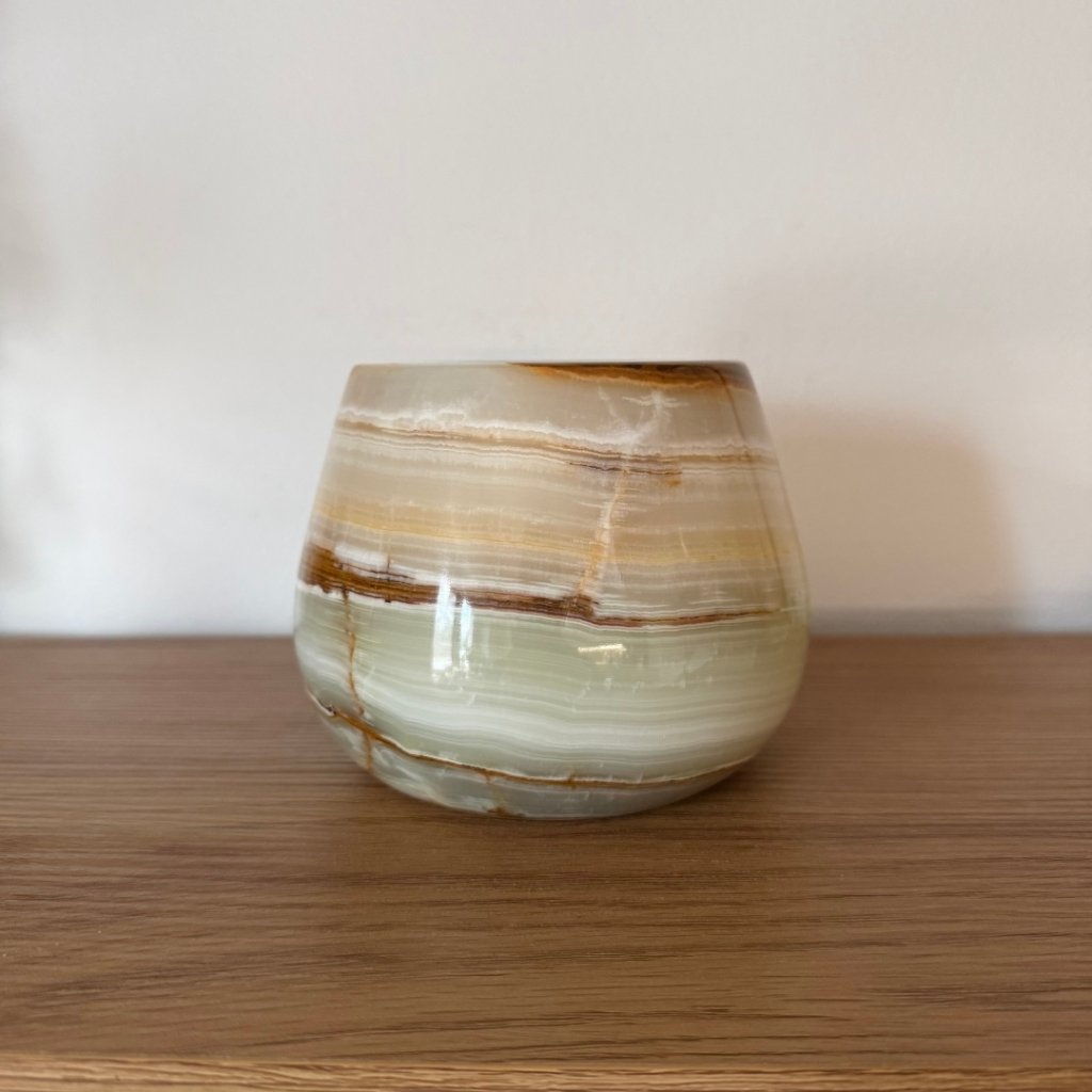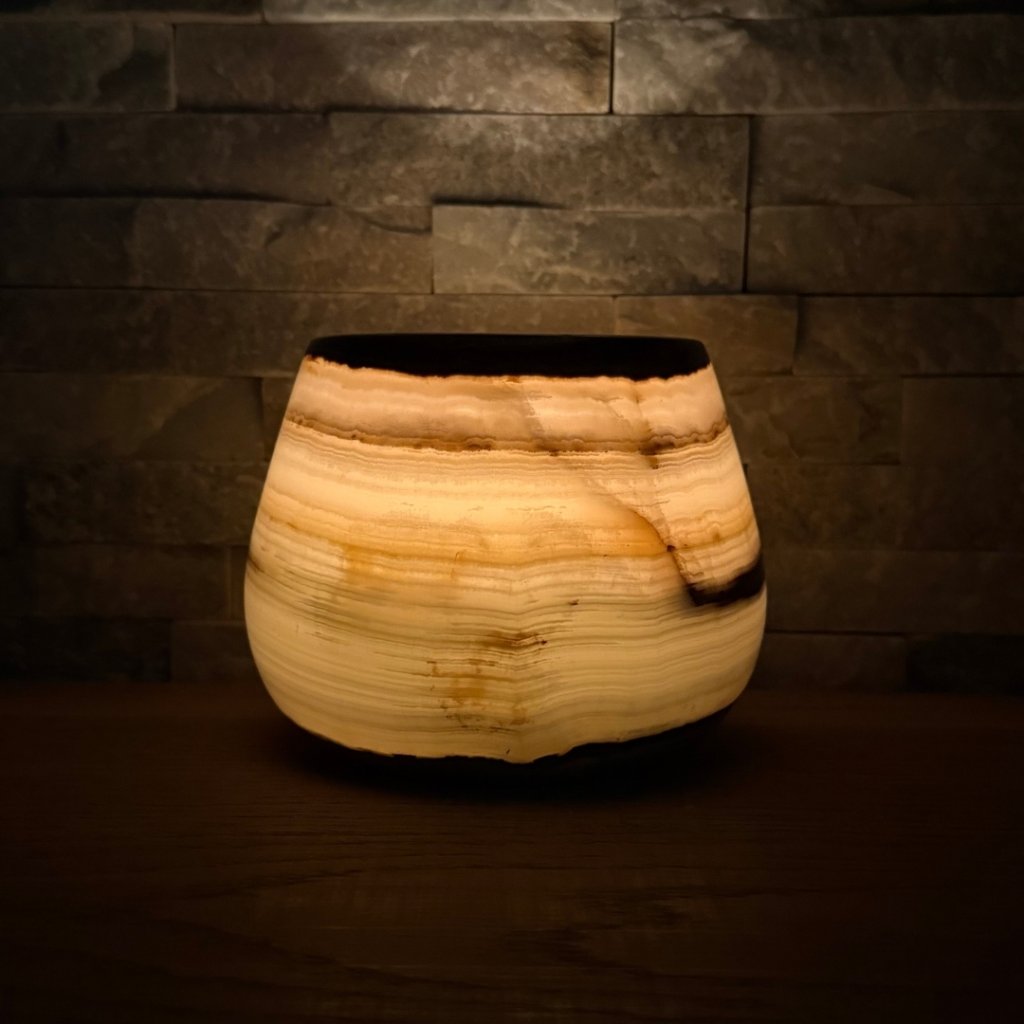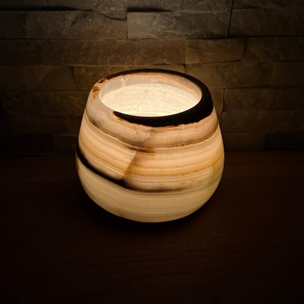 Svícen je vyroben z přírodního aragonitu, známého také jako pákistánský onyx. Tento kámen vyniká pevností, jemným leskem a přirozenou kresbou, která vznikala po tisíce let. Kupujete přesně ten svícen, který vidíte na fotografiích, žádný náhodný výběr, ale konkrétní originální kus.