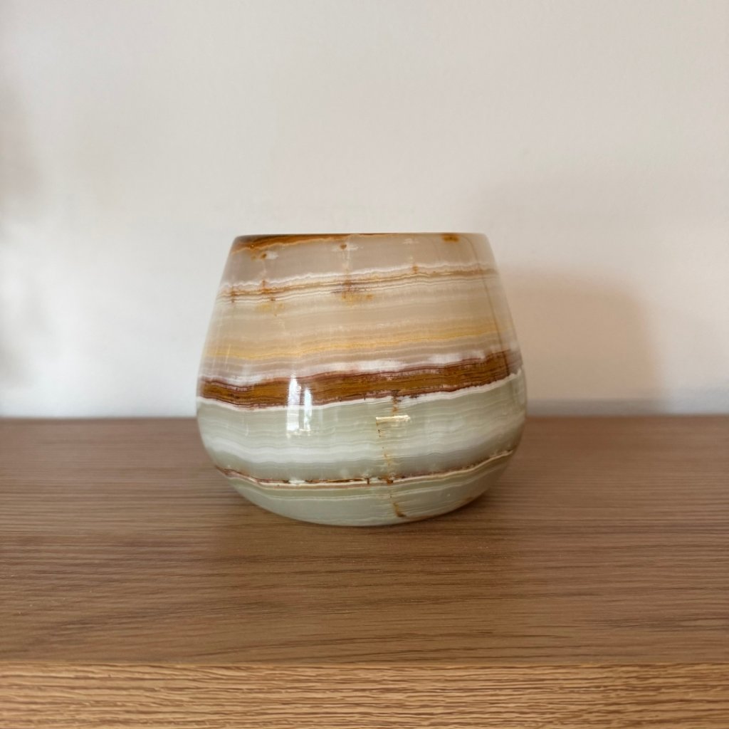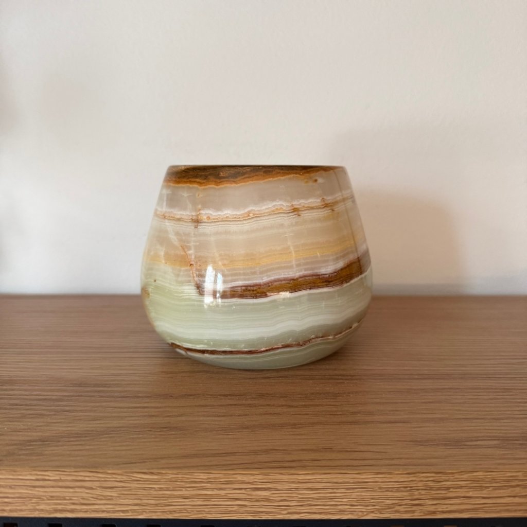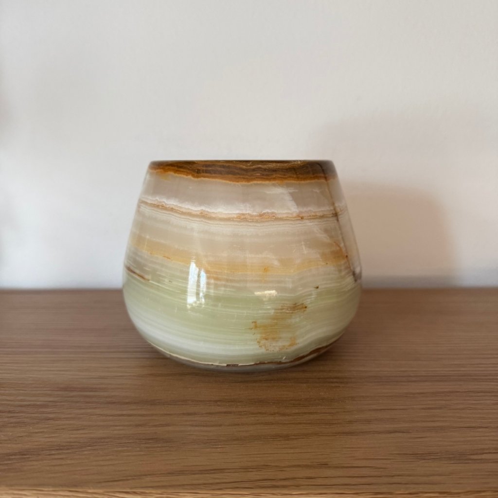 Svícen je vyroben z přírodního aragonitu, známého také jako pákistánský onyx. Tento kámen vyniká pevností, jemným leskem a přirozenou kresbou, která vznikala po tisíce let. Kupujete přesně ten svícen, který vidíte na fotografiích, žádný náhodný výběr, ale konkrétní originální kus.