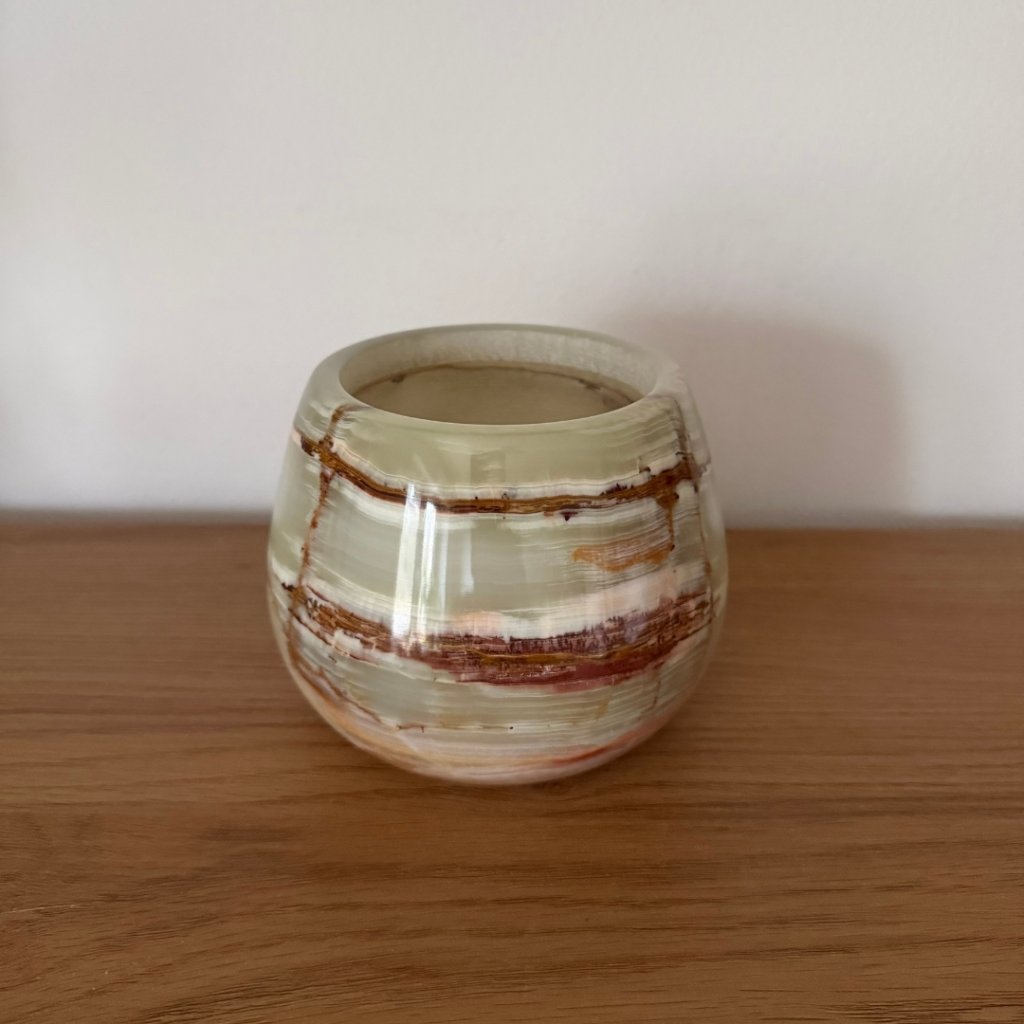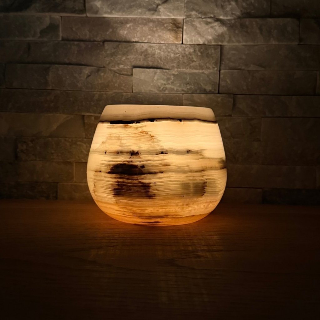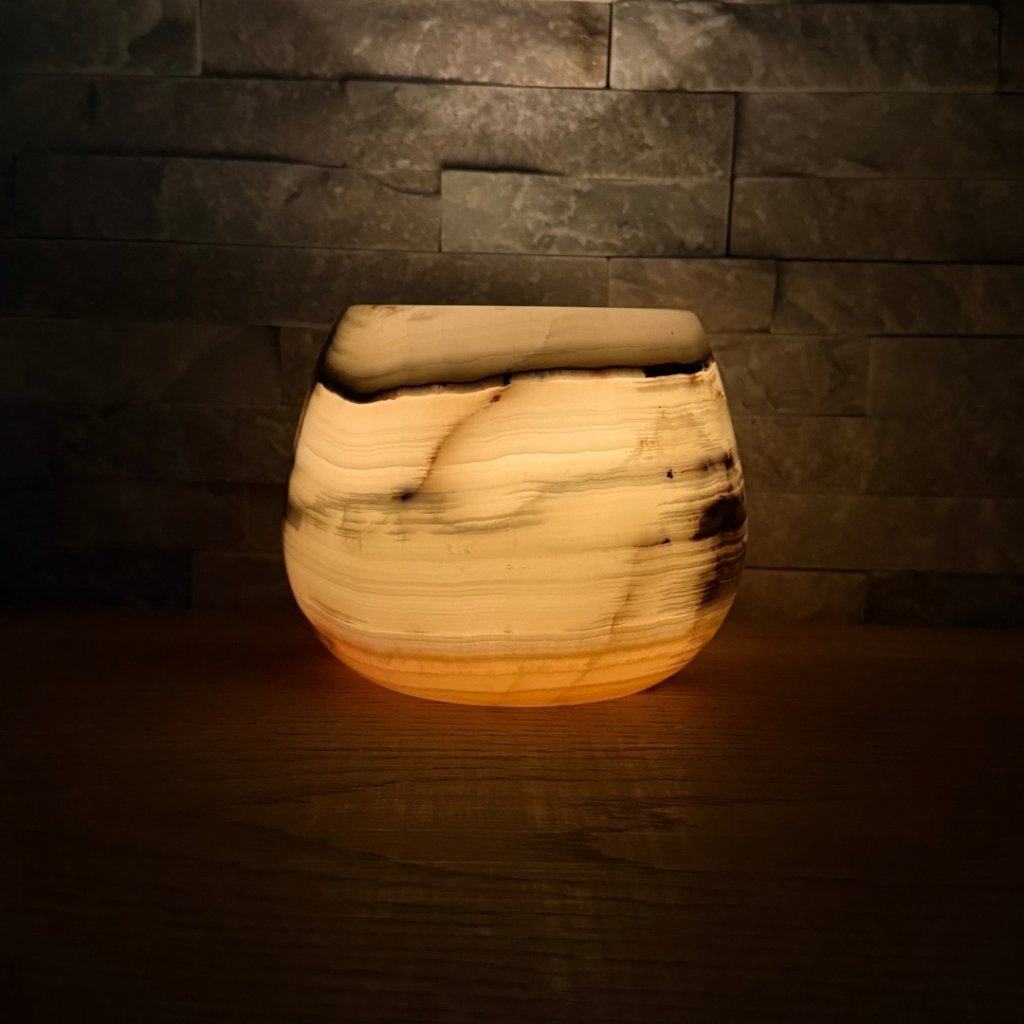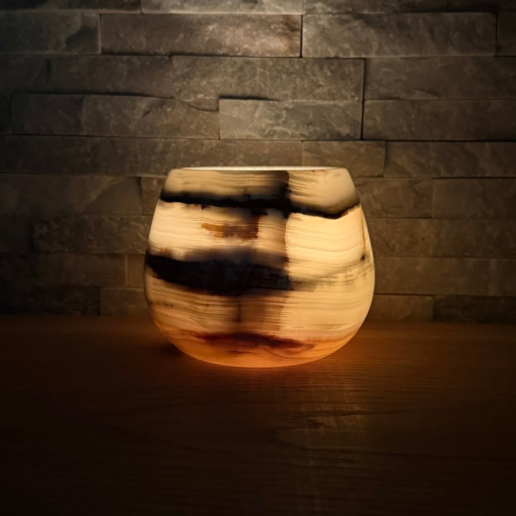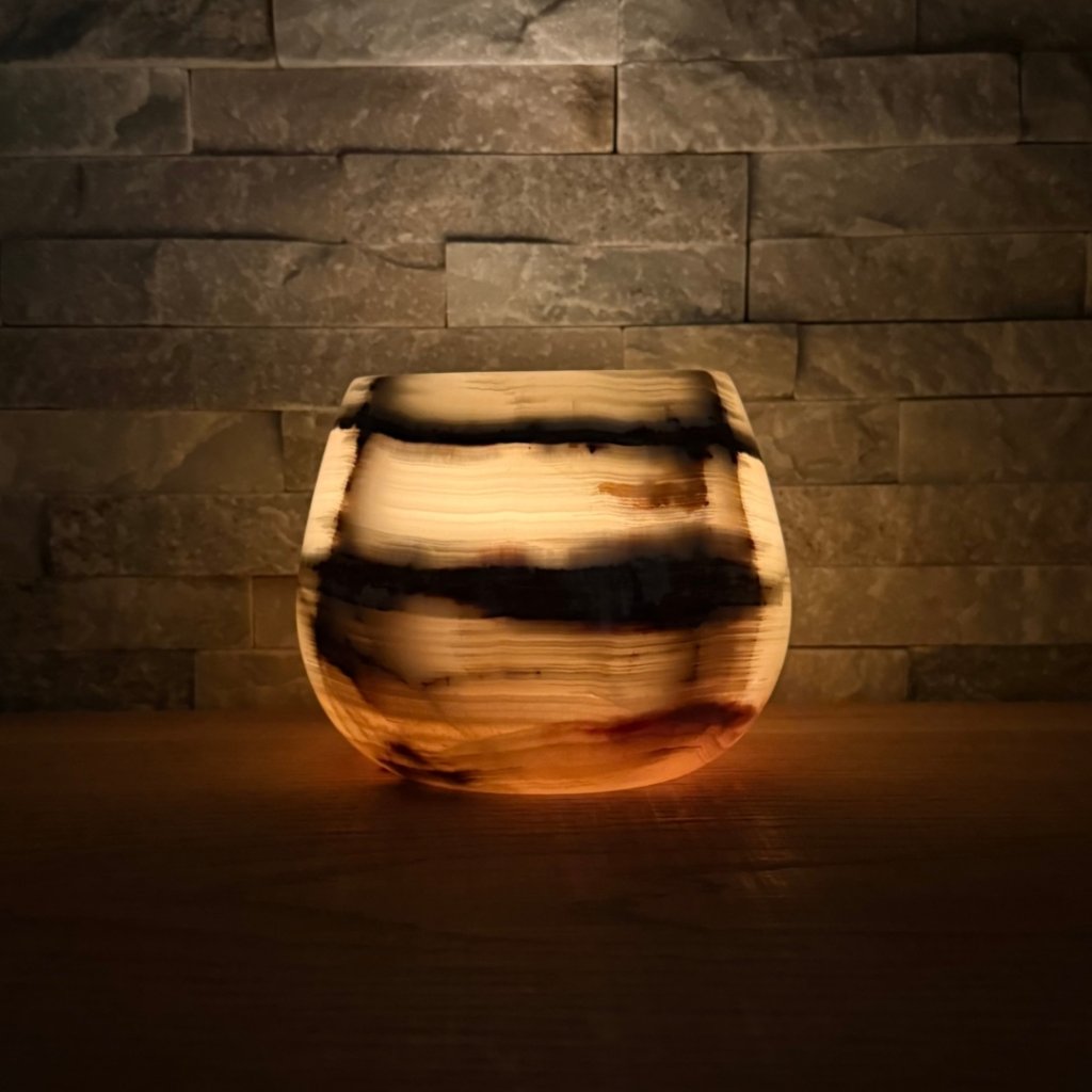 Svícen je vyroben z přírodního aragonitu, známého také jako pákistánský onyx. Tento kámen vyniká pevností, jemným leskem a přirozenou kresbou, která vznikala po tisíce let. Kupujete přesně ten svícen, který vidíte na fotografiích, žádný náhodný výběr, ale konkrétní originální kus.