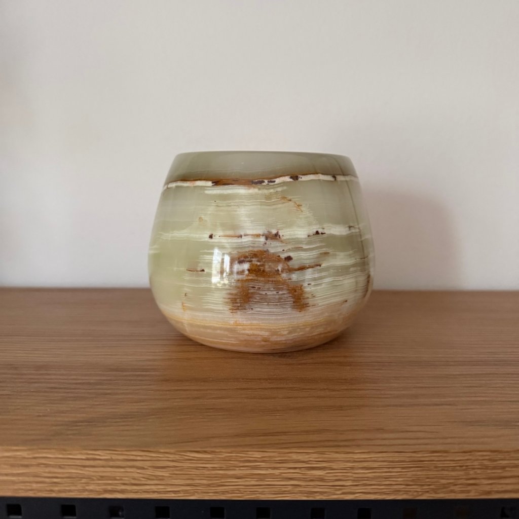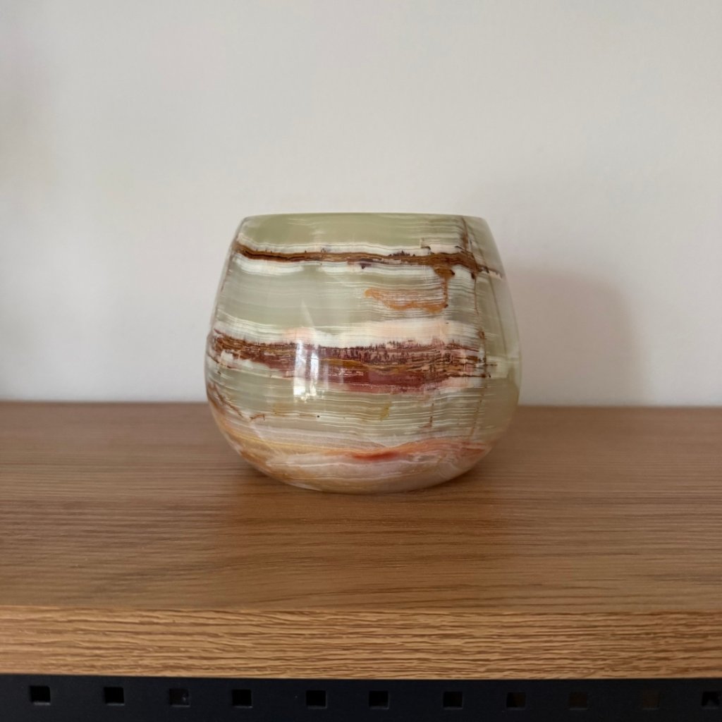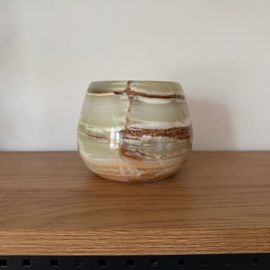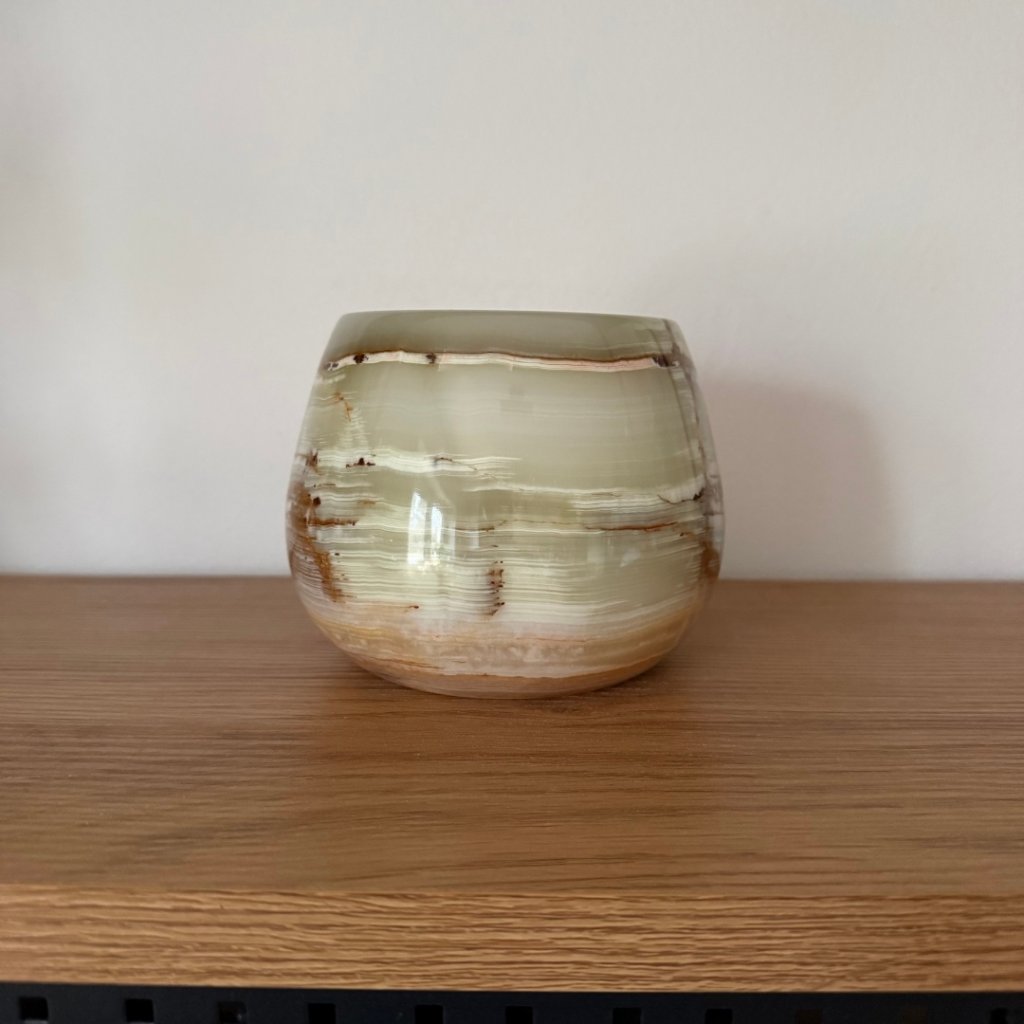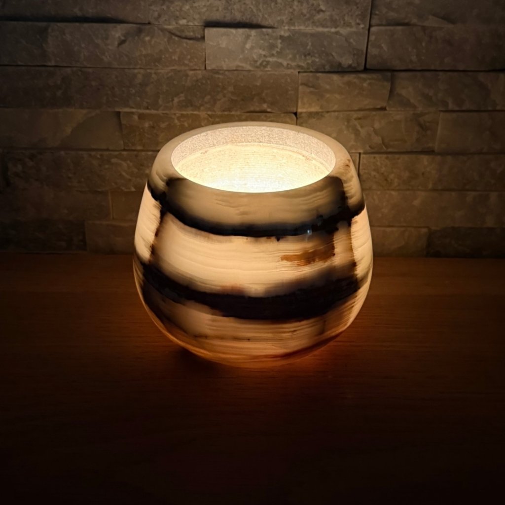 Svícen je vyroben z přírodního aragonitu, známého také jako pákistánský onyx. Tento kámen vyniká pevností, jemným leskem a přirozenou kresbou, která vznikala po tisíce let. Kupujete přesně ten svícen, který vidíte na fotografiích, žádný náhodný výběr, ale konkrétní originální kus.
