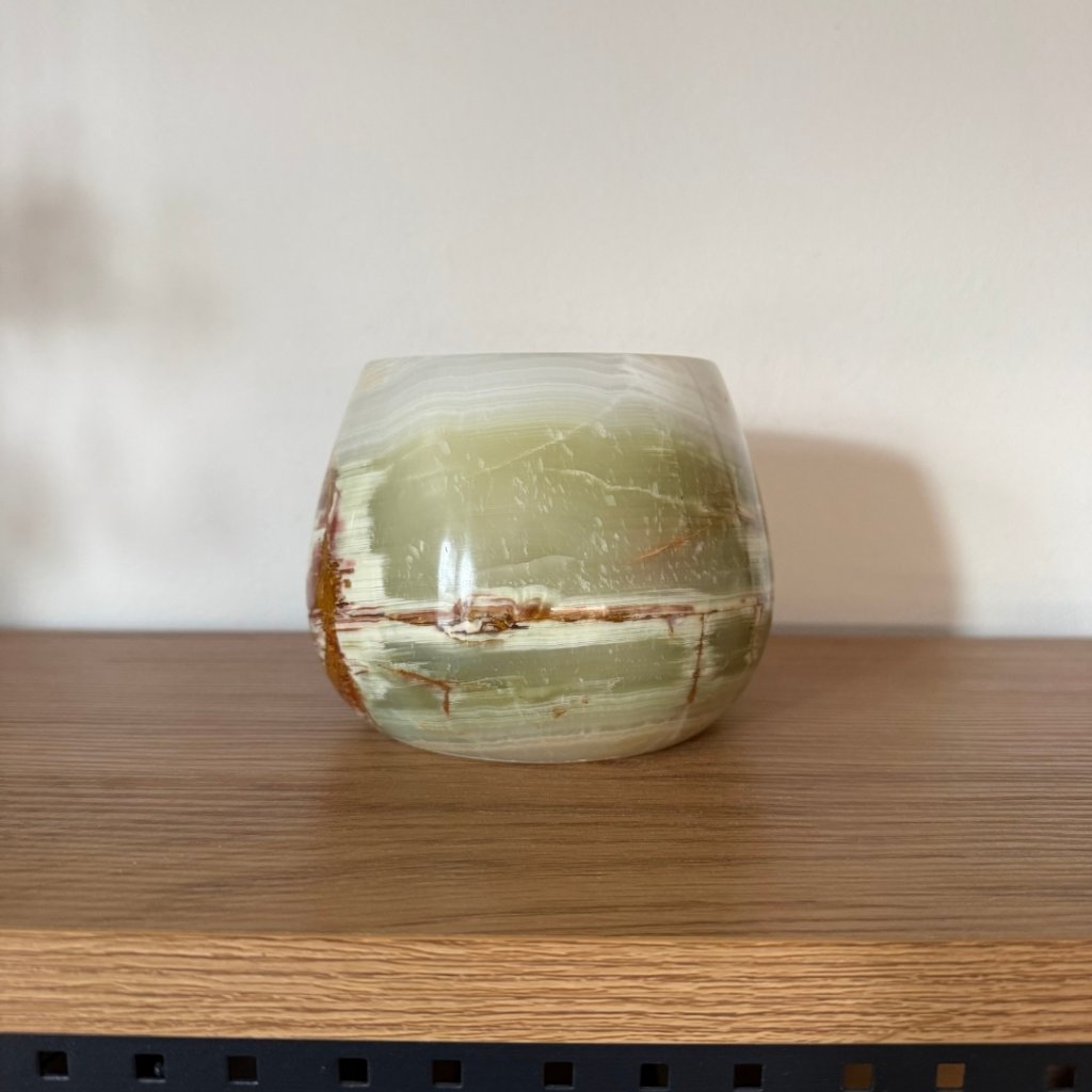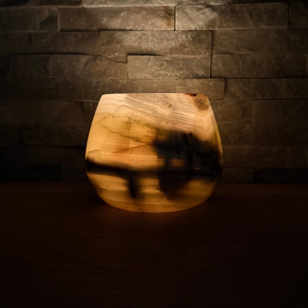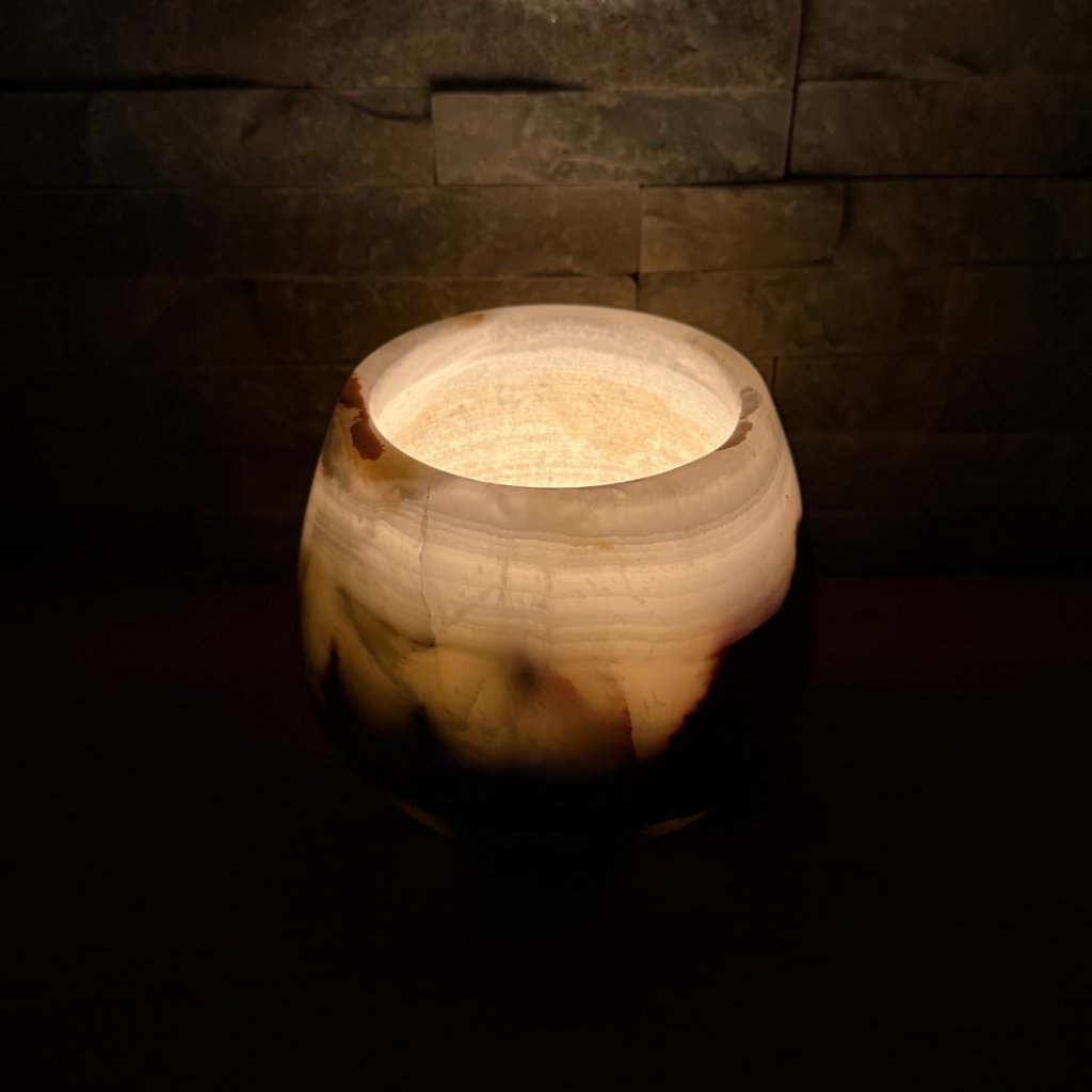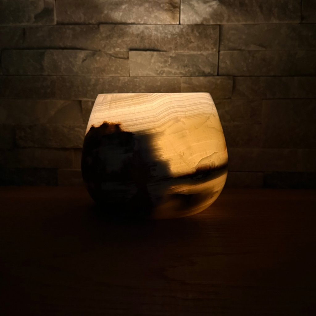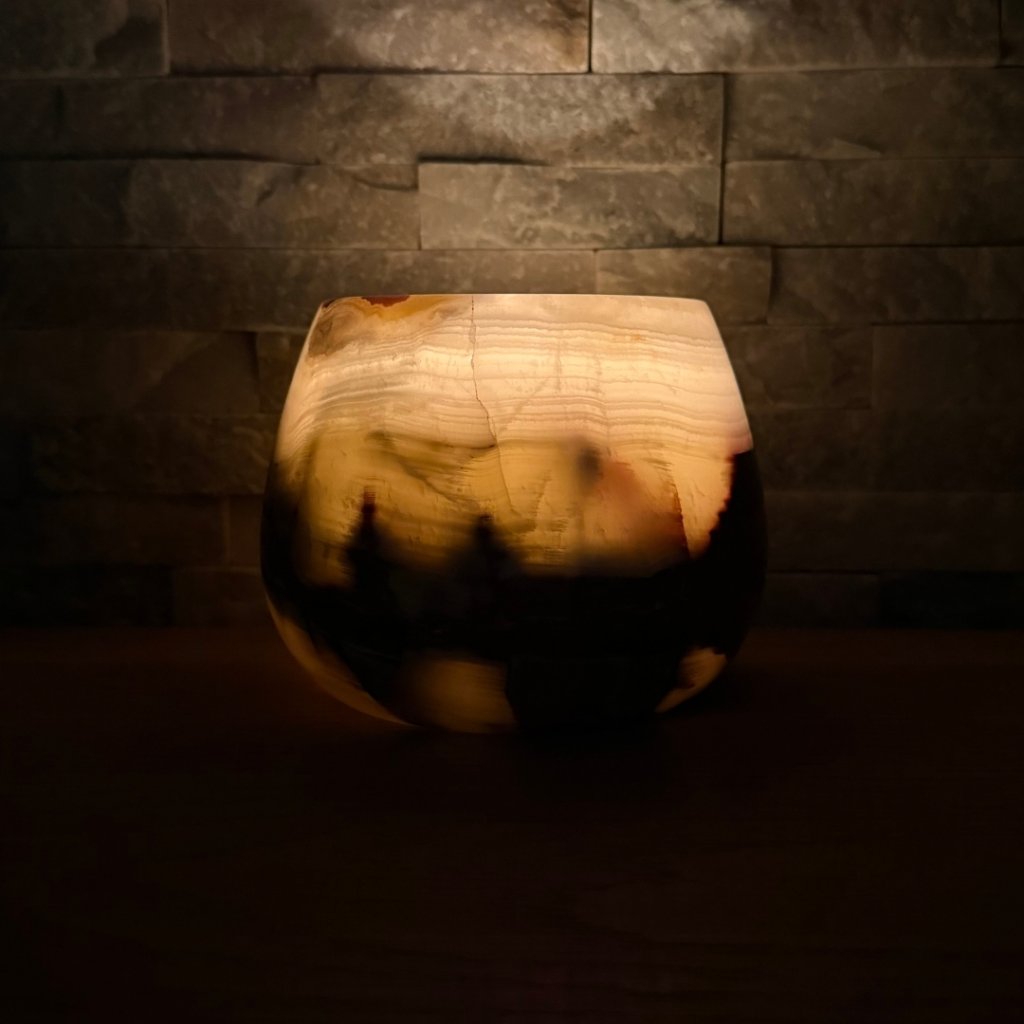 Svícen je vyroben z přírodního aragonitu, známého také jako pákistánský onyx. Tento kámen vyniká pevností, jemným leskem a přirozenou kresbou, která vznikala po tisíce let. Kupujete přesně ten svícen, který vidíte na fotografiích, žádný náhodný výběr, ale konkrétní originální kus.