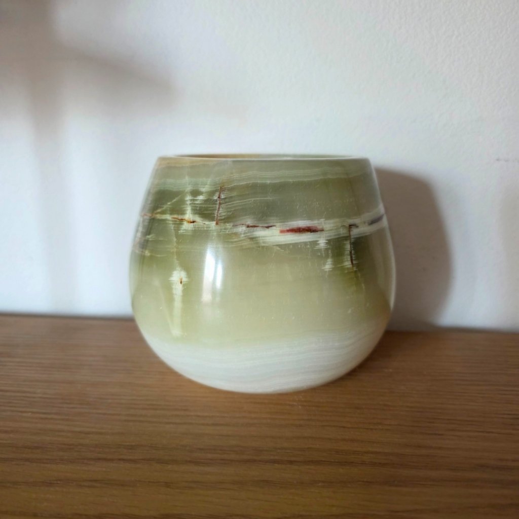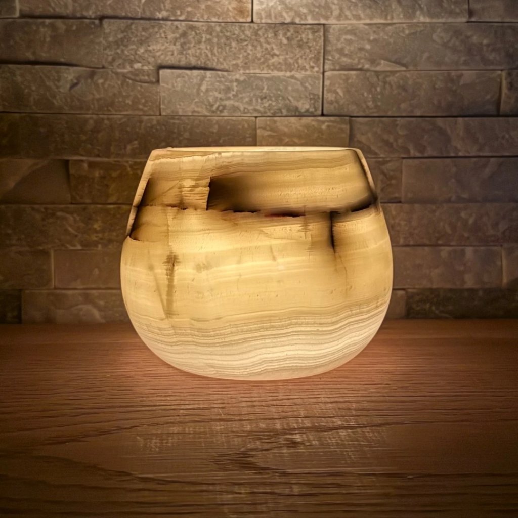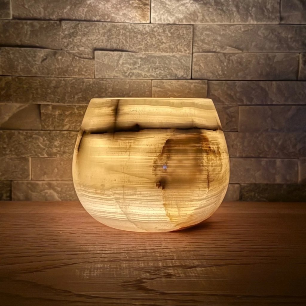 Svícen je vyroben z přírodního aragonitu, známého také jako pákistánský onyx. Tento kámen vyniká pevností, jemným leskem a přirozenou kresbou, která vznikala po tisíce let. Kupujete přesně ten svícen, který vidíte na fotografiích, žádný náhodný výběr, ale konkrétní originální kus.