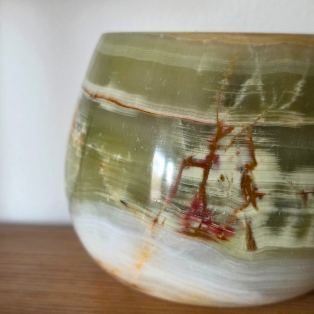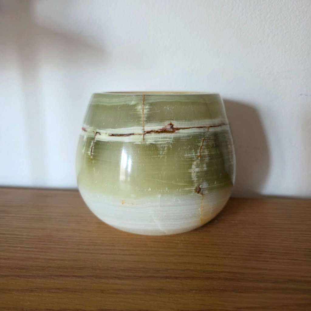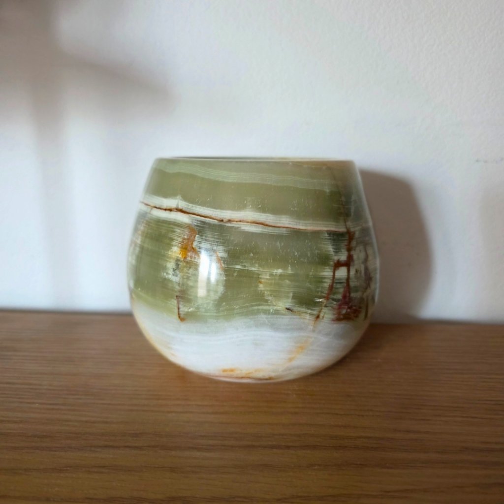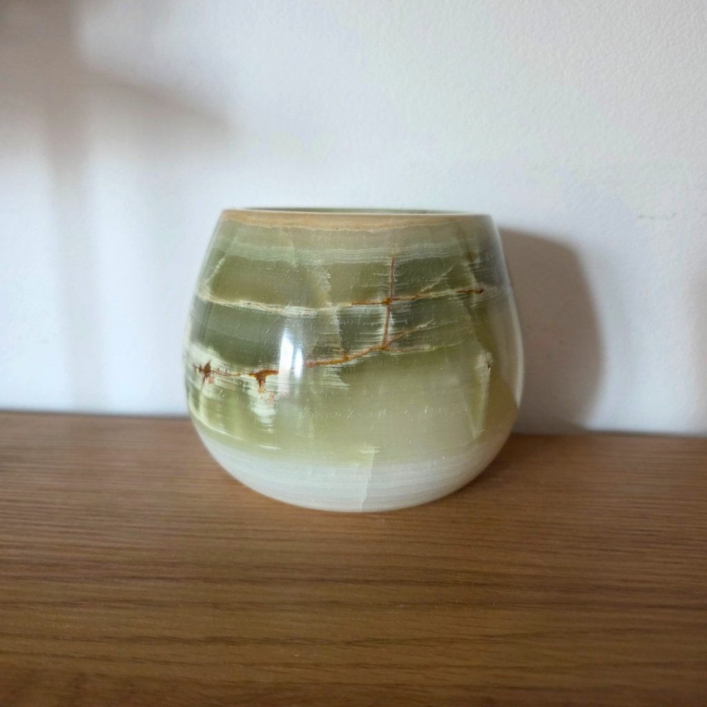 Svícen je vyroben z přírodního aragonitu, známého také jako pákistánský onyx. Tento kámen vyniká pevností, jemným leskem a přirozenou kresbou, která vznikala po tisíce let. Kupujete přesně ten svícen, který vidíte na fotografiích, žádný náhodný výběr, ale konkrétní originální kus.