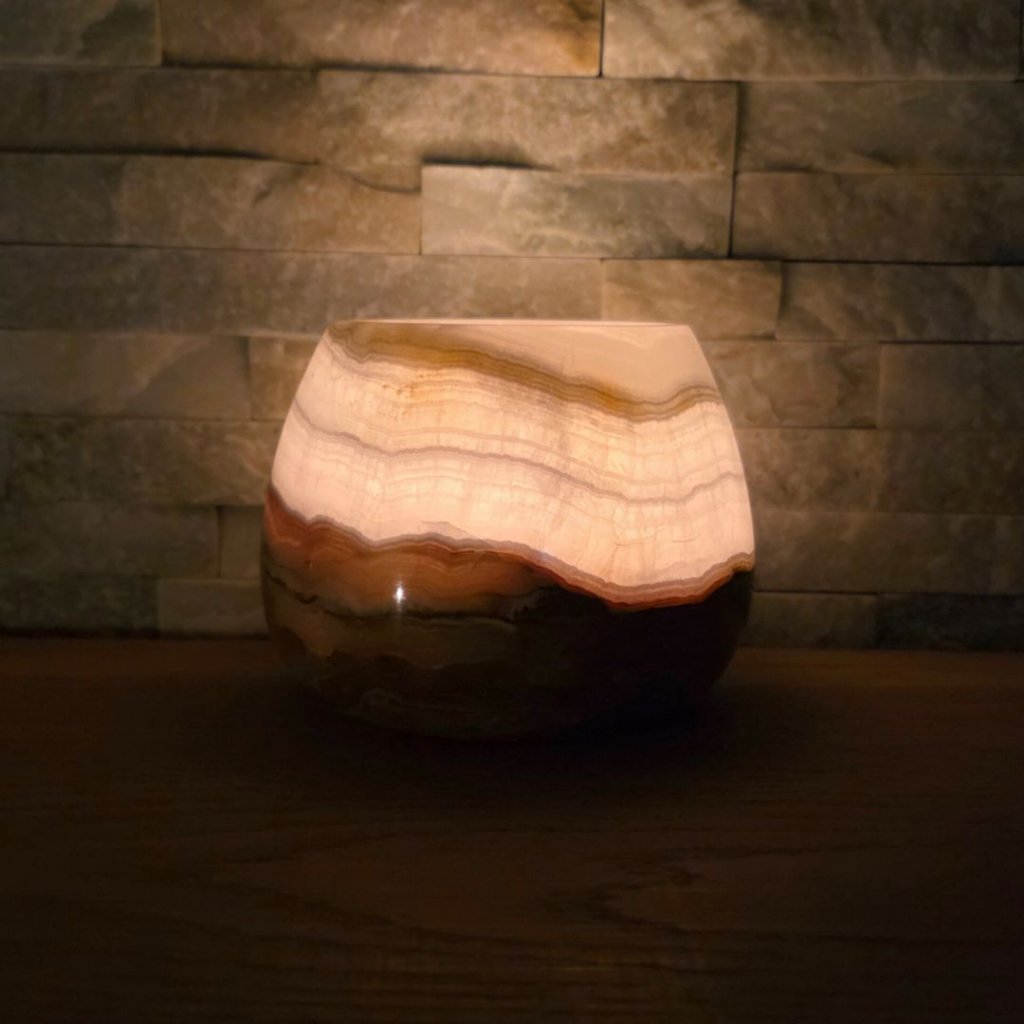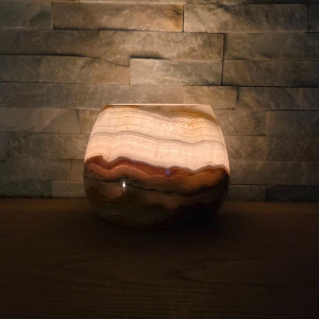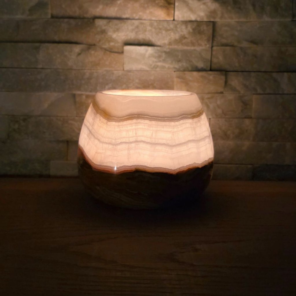Svícen je vyroben z přírodního aragonitu, známého také jako pákistánský onyx. Tento kámen vyniká pevností, jemným leskem a přirozenou kresbou, která vznikala po tisíce let. Kupujete přesně ten svícen, který vidíte na fotografiích, žádný náhodný výběr, ale konkrétní originální kus.