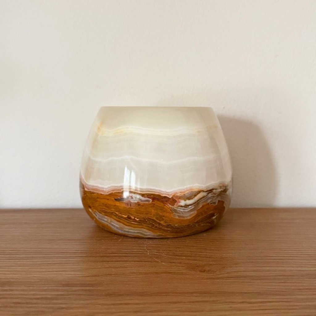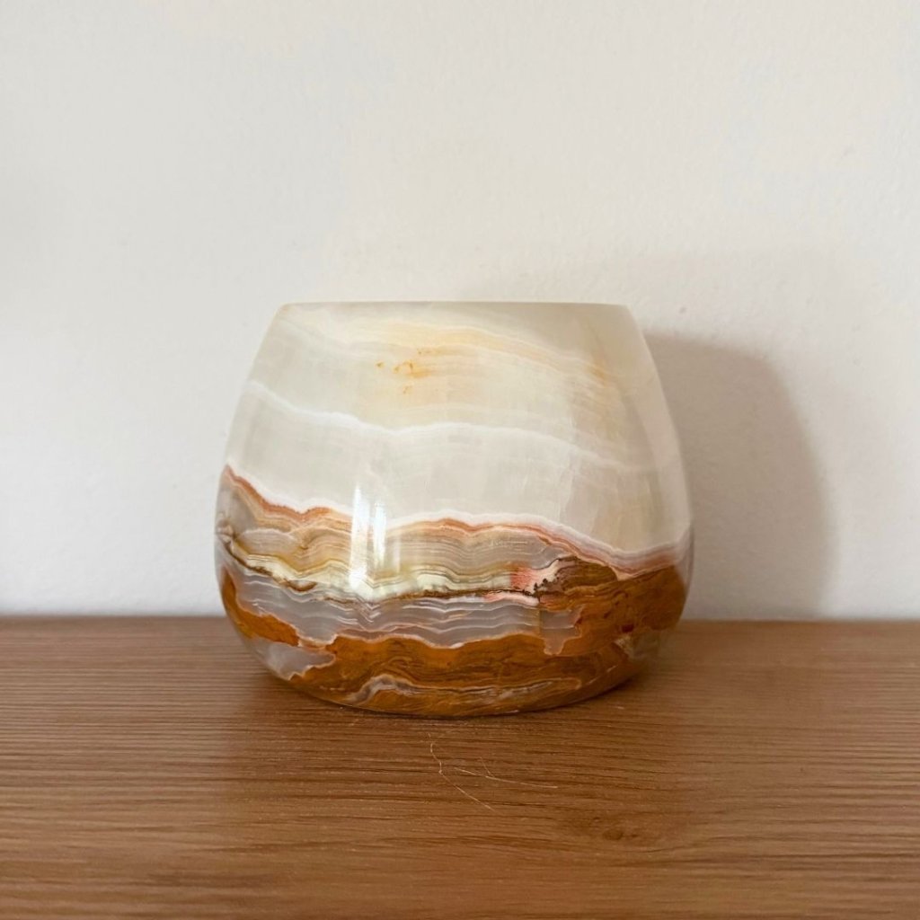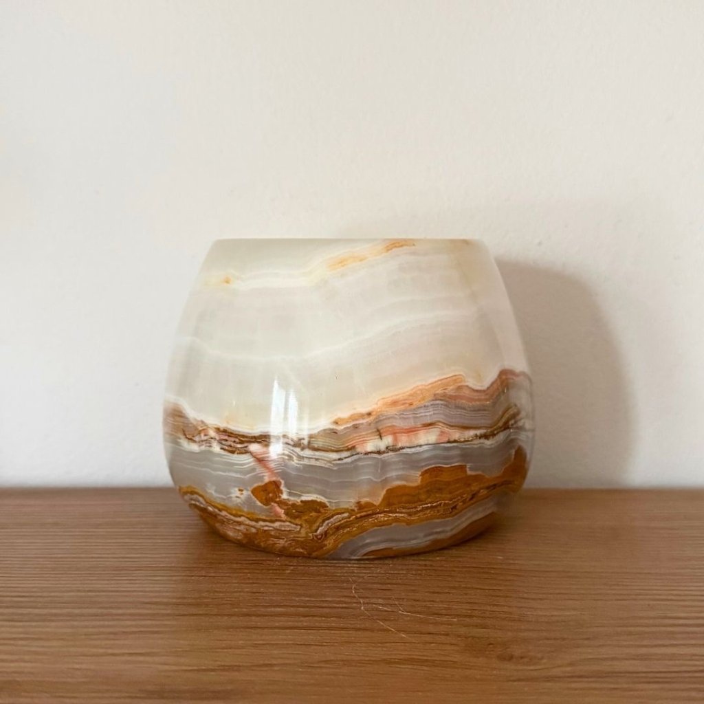 Svícen je vyroben z přírodního aragonitu, známého také jako pákistánský onyx. Tento kámen vyniká pevností, jemným leskem a přirozenou kresbou, která vznikala po tisíce let. Kupujete přesně ten svícen, který vidíte na fotografiích, žádný náhodný výběr, ale konkrétní originální kus.