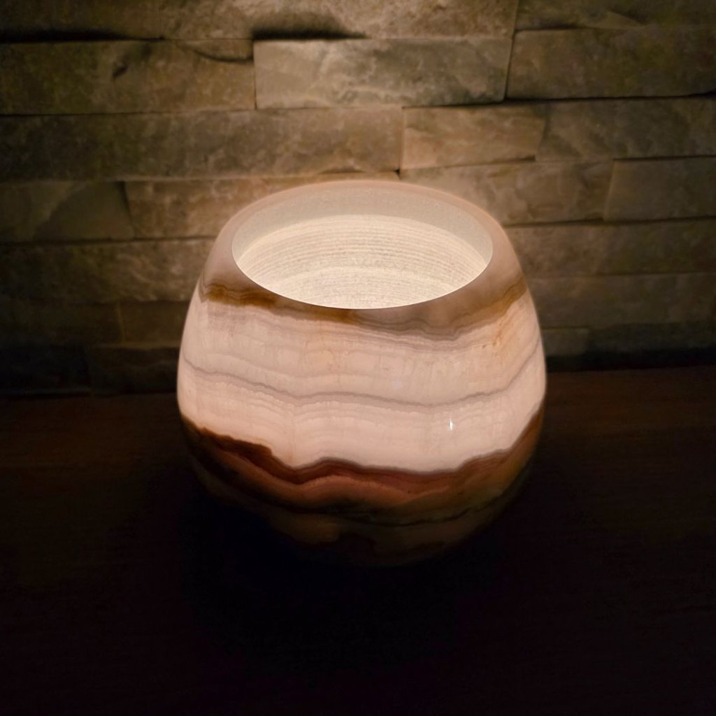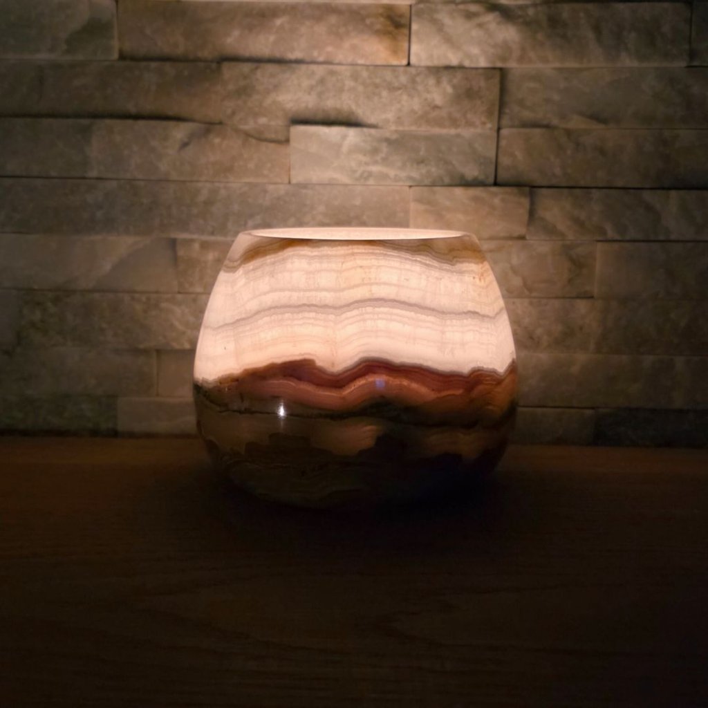 Každý svícen z aragonitu je jedinečný svým vzhledem. Tento konkrétní kus má přesně takovou strukturu, žilkování a barevnost, jakou vidíte na fotkách. Doporučujeme si fotogalerii projít opravdu pečlivě, abyste věděli, jaký svícen si domů vybíráte. Po zapálení čajové svíčky začne světlo jemně prosvítat kamenem a zvýrazní jeho přirozenou kresbu.
