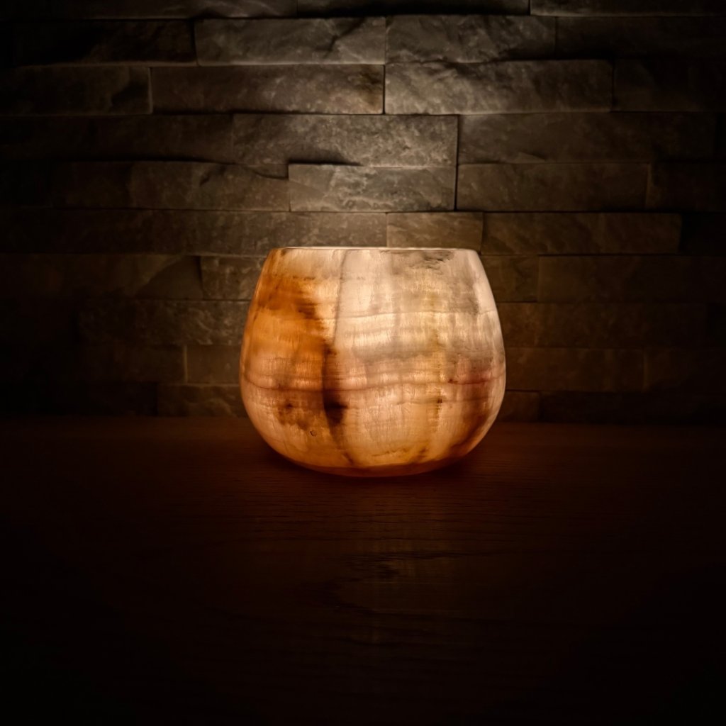 Každý svícen z aragonitu je jedinečný svým vzhledem. Tento konkrétní kus má přesně takovou strukturu, žilkování a barevnost, jakou vidíte na fotkách. Doporučujeme si fotogalerii projít opravdu pečlivě, abyste věděli, jaký svícen si domů vybíráte. Po zapálení čajové svíčky začne světlo jemně prosvítat kamenem a zvýrazní jeho přirozenou kresbu.