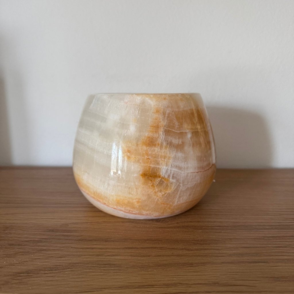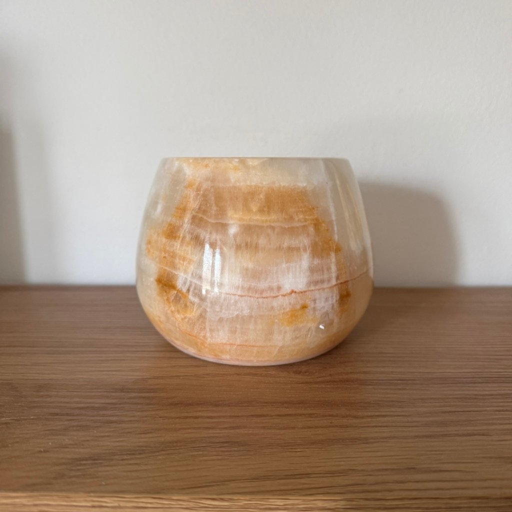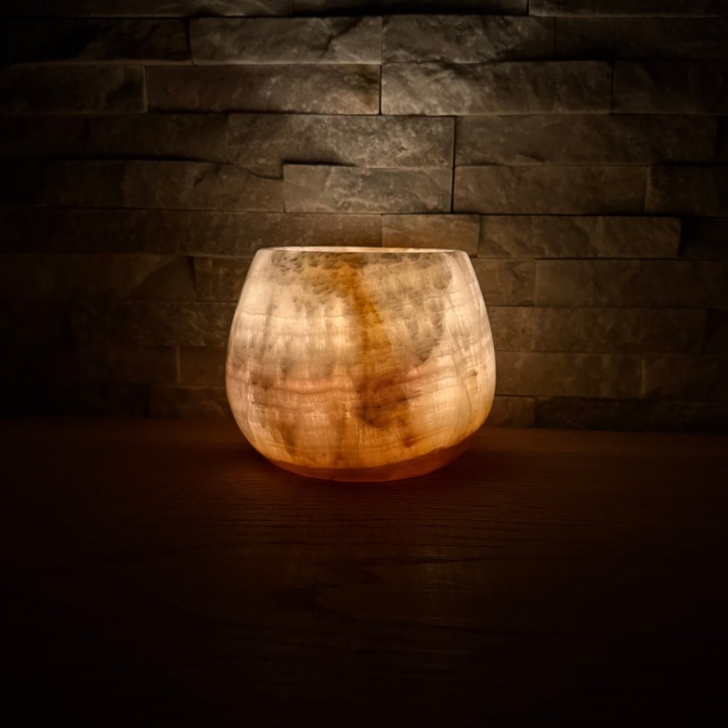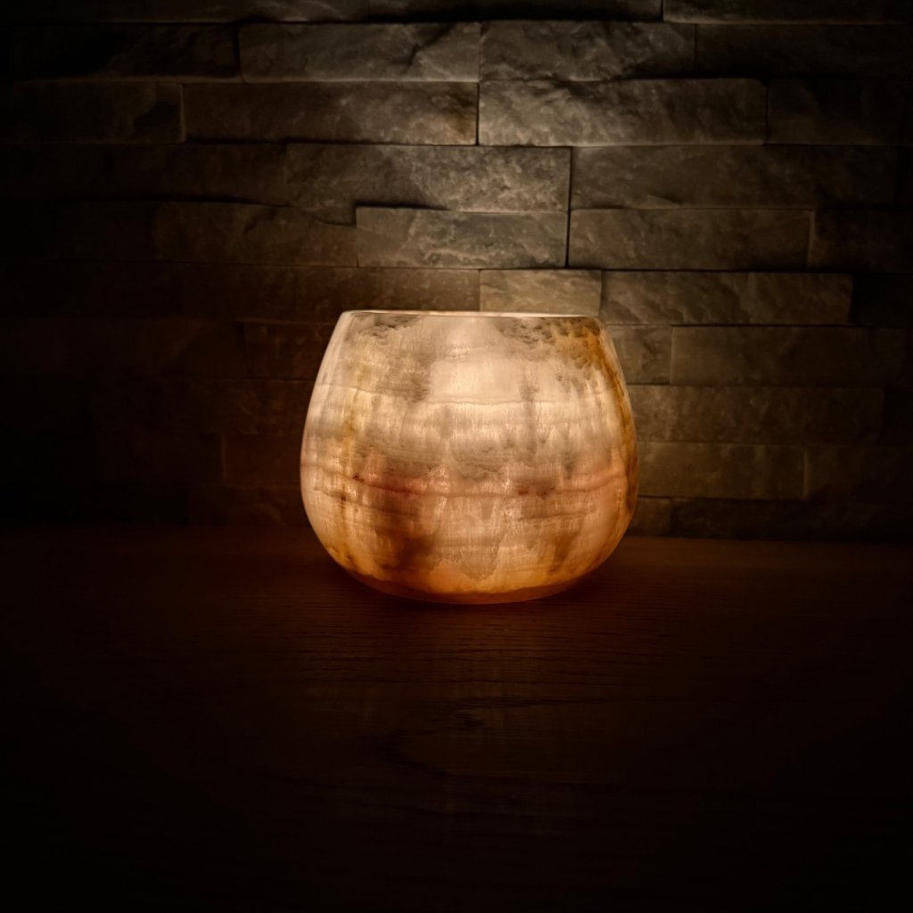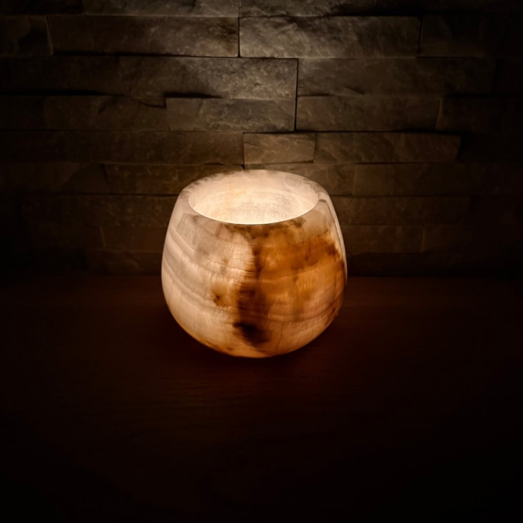 Svícen je vyroben z přírodního aragonitu, známého také jako pákistánský onyx. Tento kámen vyniká pevností, jemným leskem a přirozenou kresbou, která vznikala po tisíce let. Kupujete přesně ten svícen, který vidíte na fotografiích, žádný náhodný výběr, ale konkrétní originální kus.