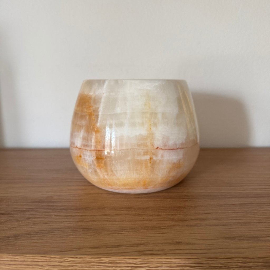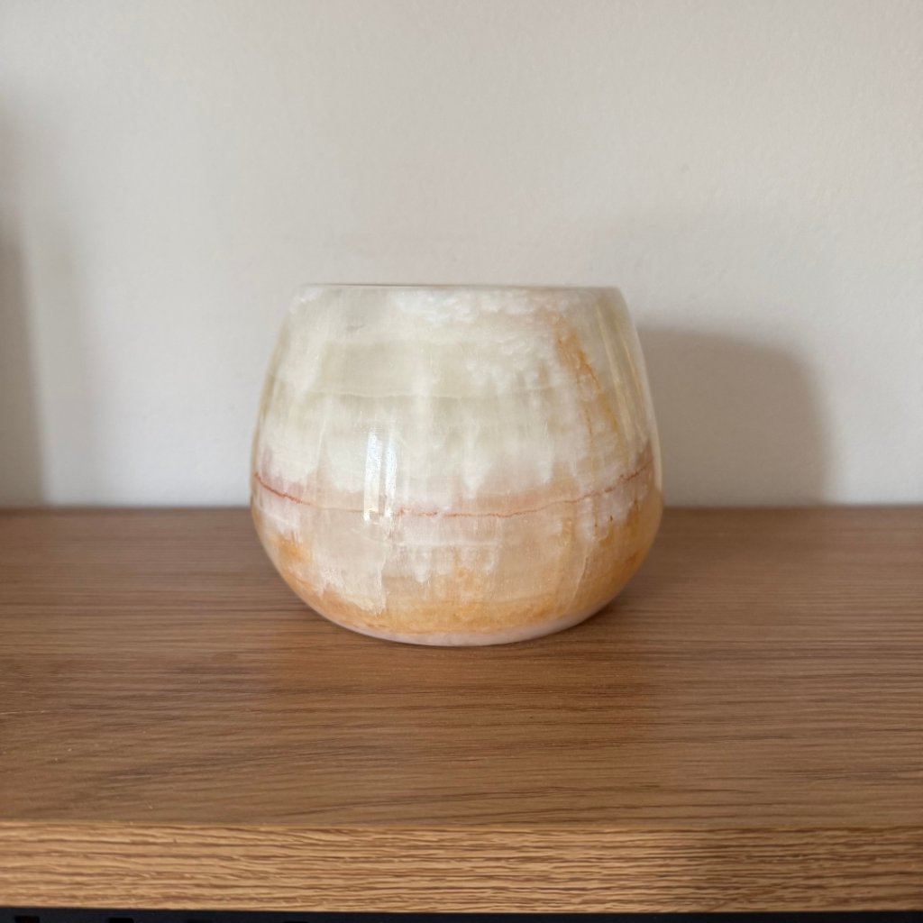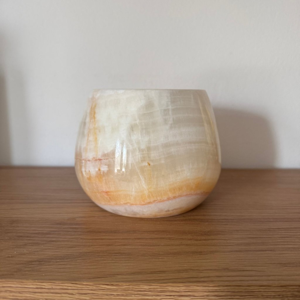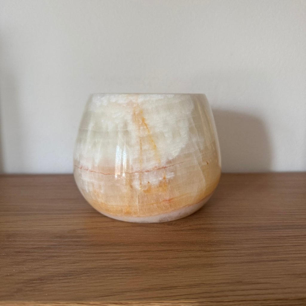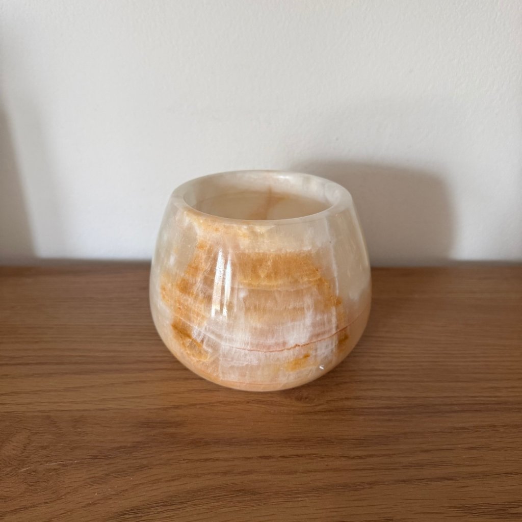 Svícen je vyroben z přírodního aragonitu, známého také jako pákistánský onyx. Tento kámen vyniká pevností, jemným leskem a přirozenou kresbou, která vznikala po tisíce let. Kupujete přesně ten svícen, který vidíte na fotografiích, žádný náhodný výběr, ale konkrétní originální kus.