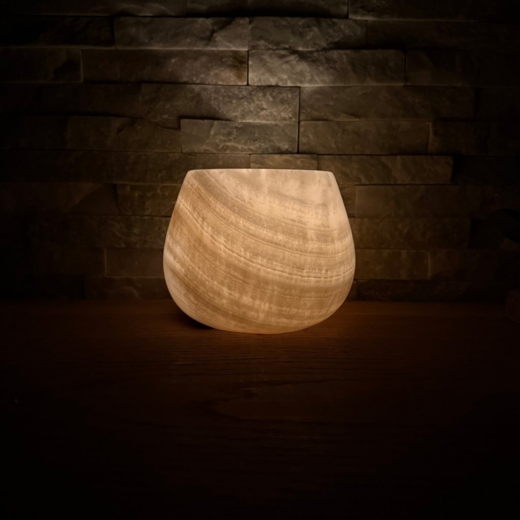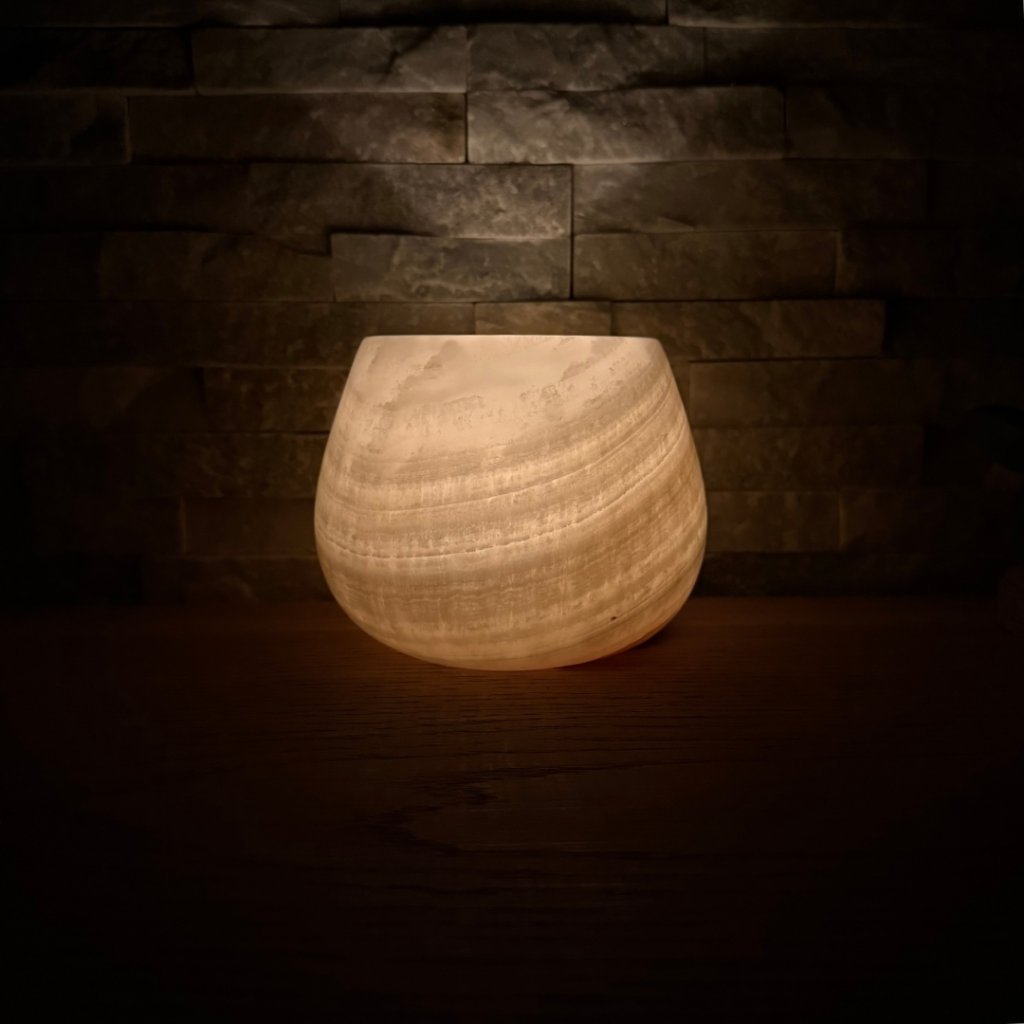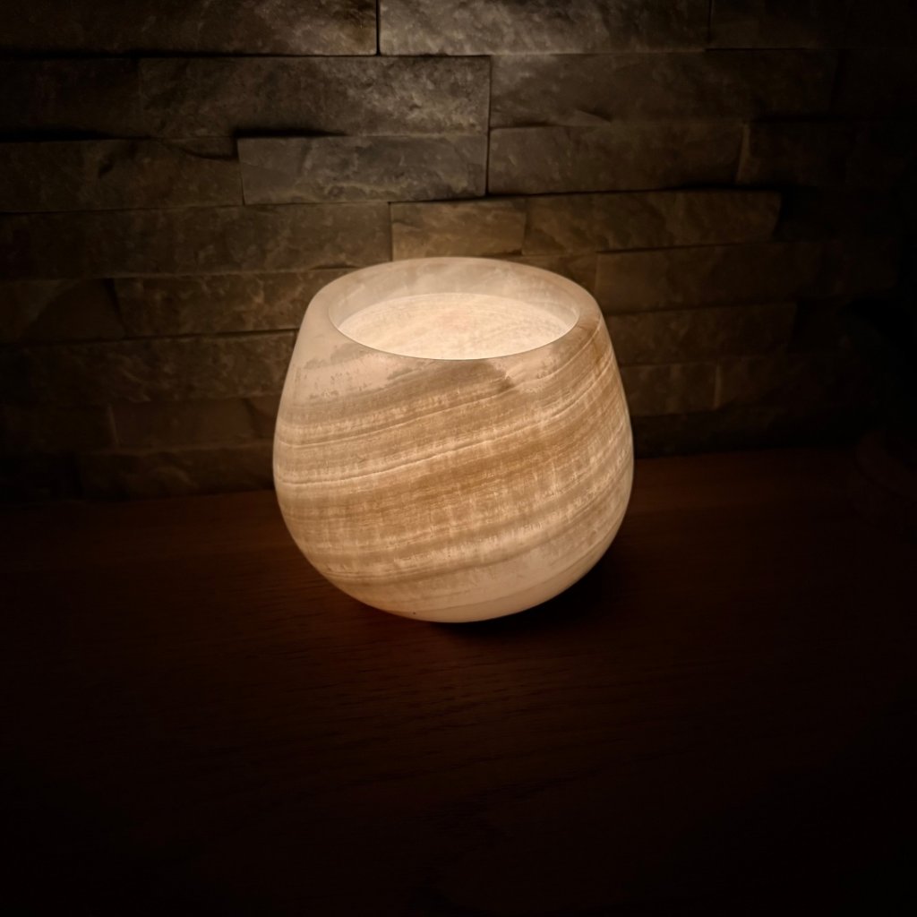 Každý svícen z aragonitu je jedinečný svým vzhledem. Tento konkrétní kus má přesně takovou strukturu, žilkování a barevnost, jakou vidíte na fotkách. Doporučujeme si fotogalerii projít opravdu pečlivě, abyste věděli, jaký svícen si domů vybíráte. Po zapálení čajové svíčky začne světlo jemně prosvítat kamenem a zvýrazní jeho přirozenou kresbu.