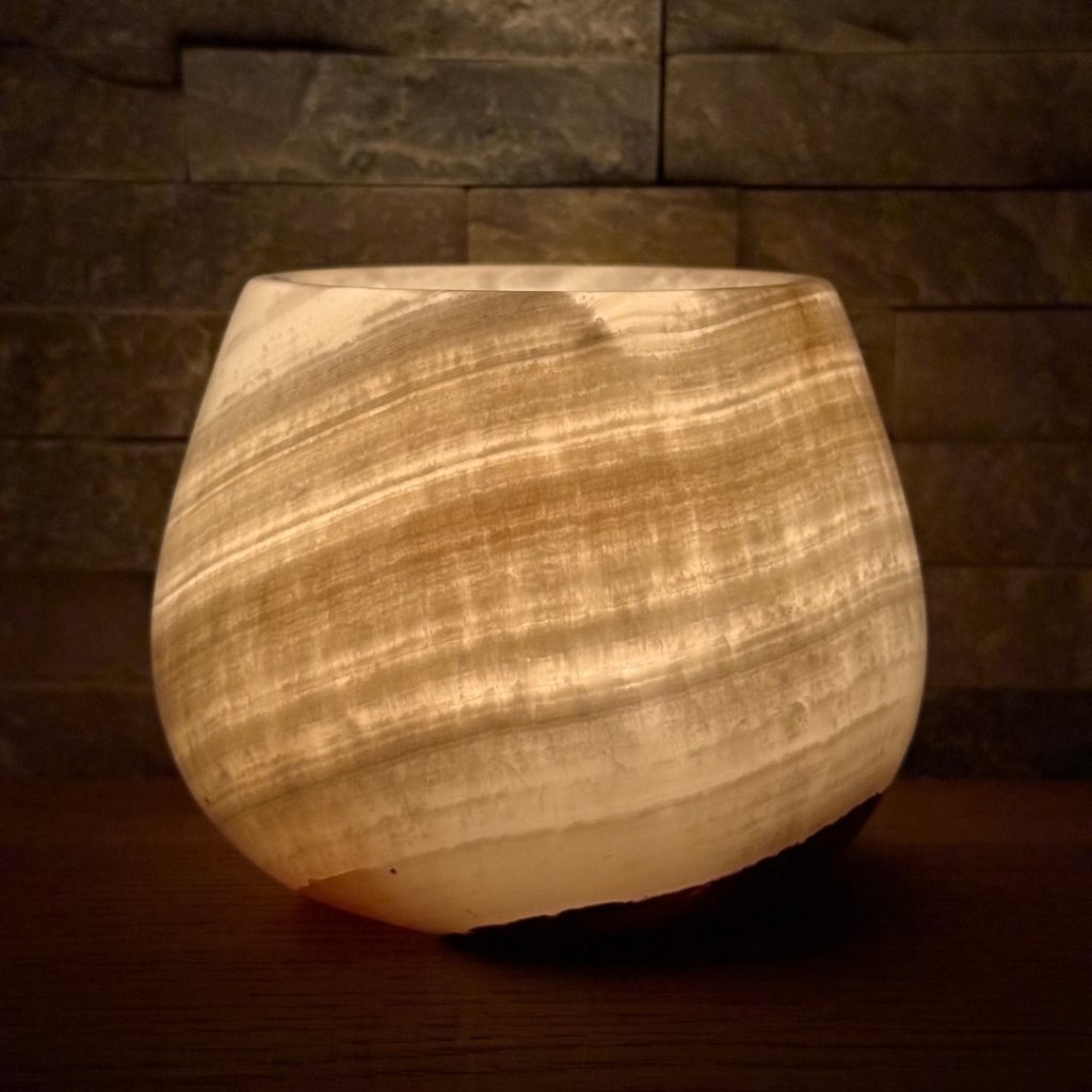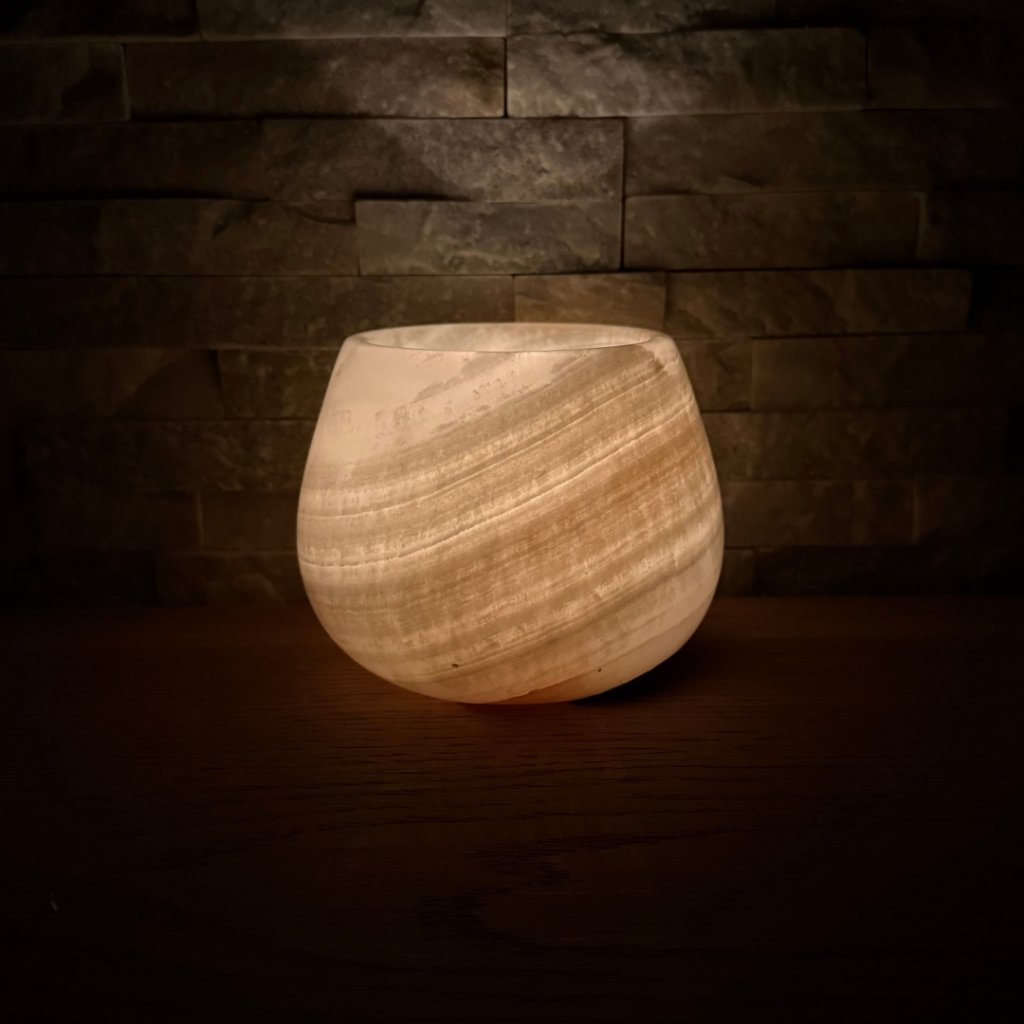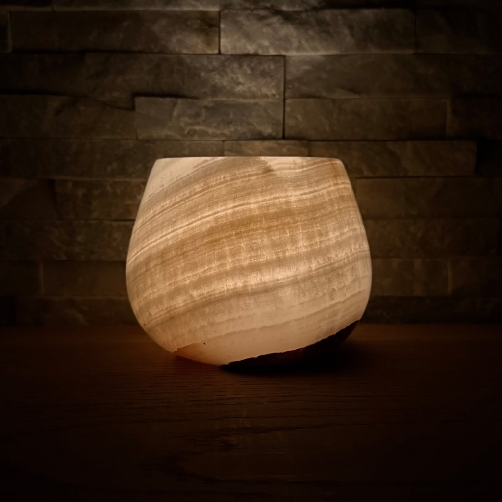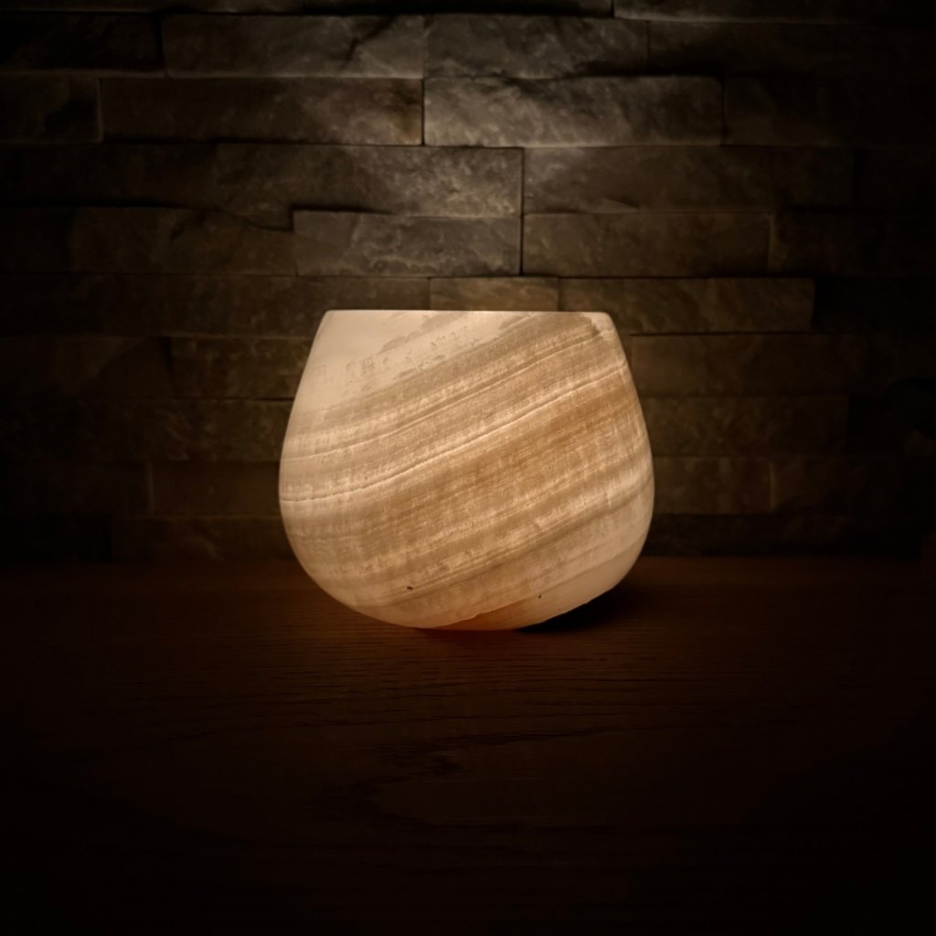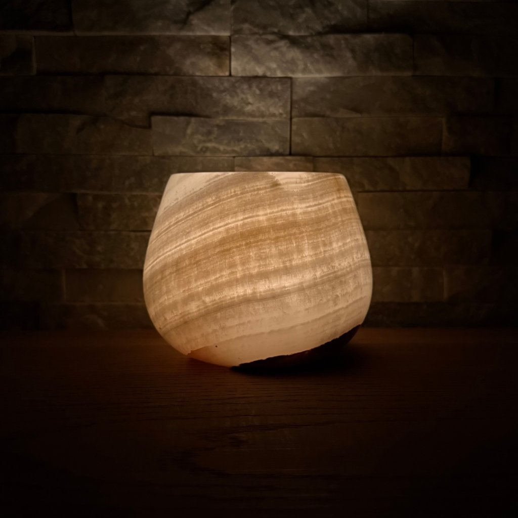 Svícen je vyroben z přírodního aragonitu, známého také jako pákistánský onyx. Tento kámen vyniká pevností, jemným leskem a přirozenou kresbou, která vznikala po tisíce let. Kupujete přesně ten svícen, který vidíte na fotografiích, žádný náhodný výběr, ale konkrétní originální kus.