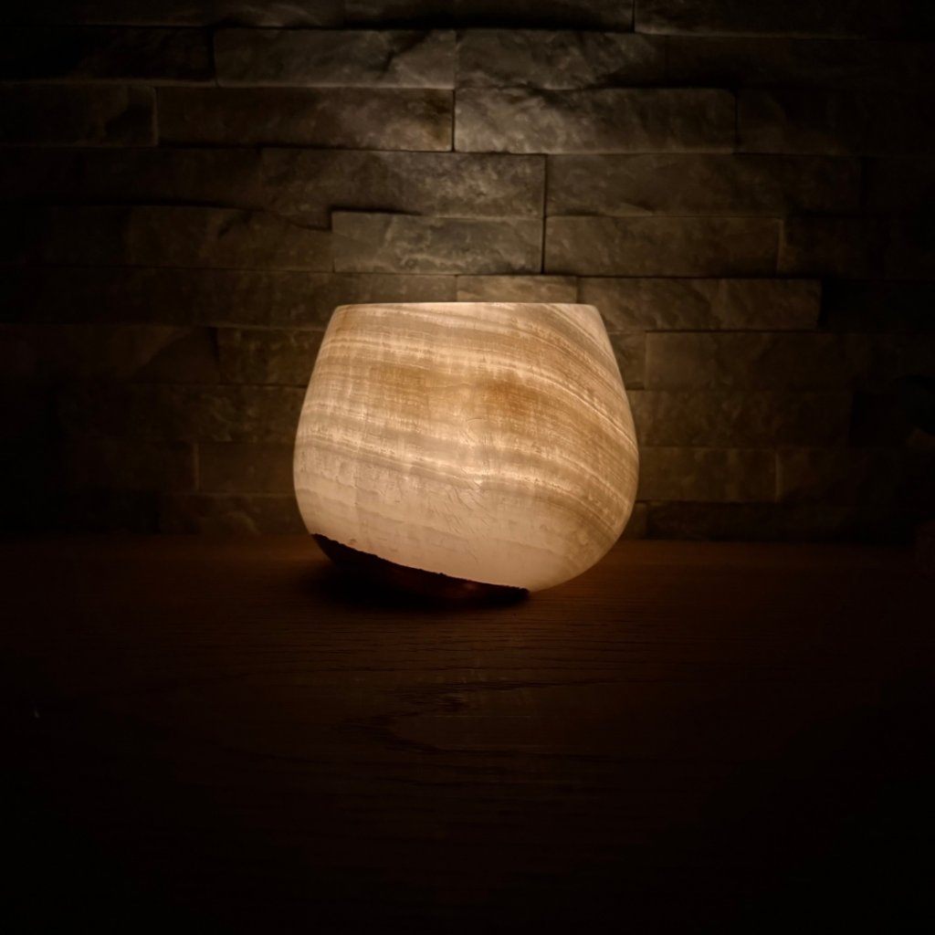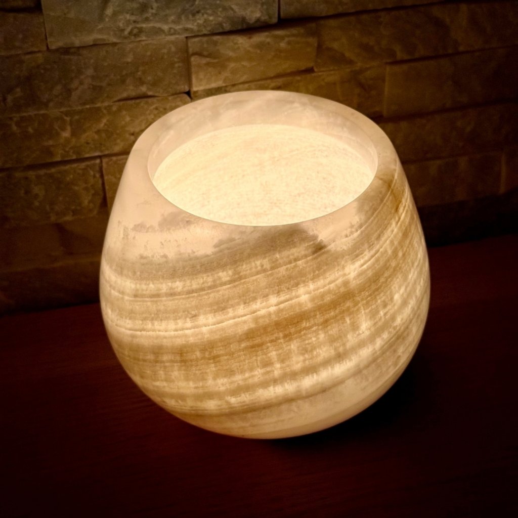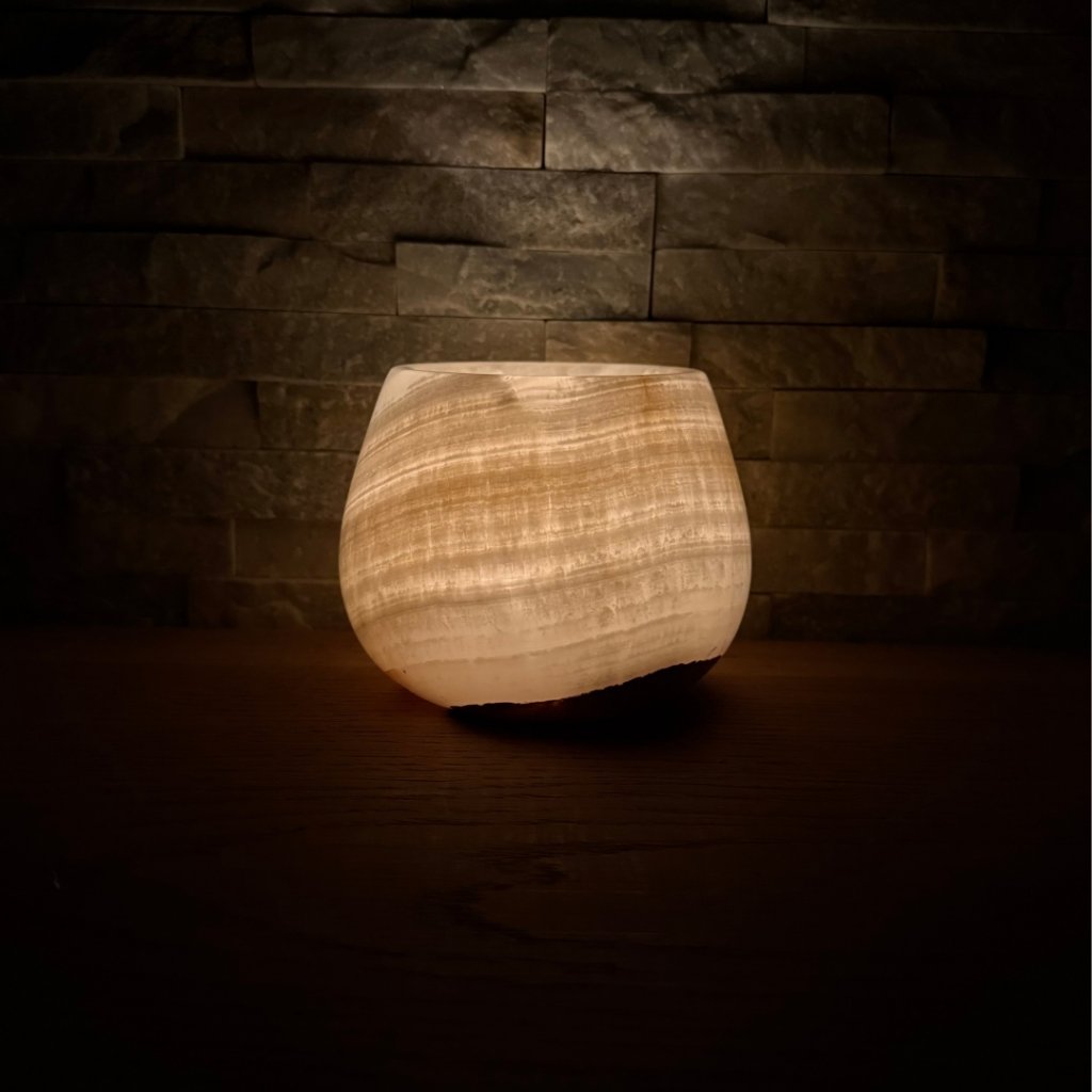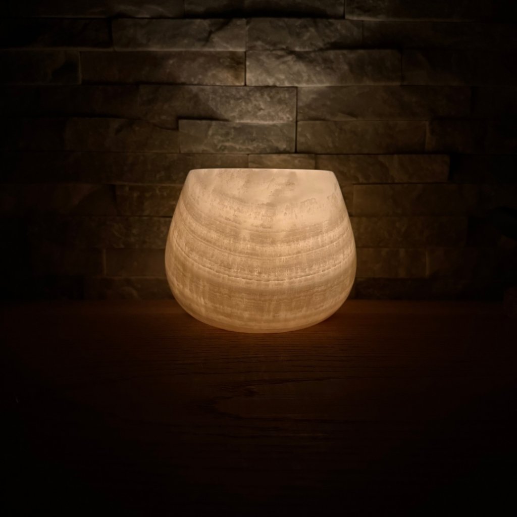 Svícen je vyroben z přírodního aragonitu, známého také jako pákistánský onyx. Tento kámen vyniká pevností, jemným leskem a přirozenou kresbou, která vznikala po tisíce let. Kupujete přesně ten svícen, který vidíte na fotografiích, žádný náhodný výběr, ale konkrétní originální kus.