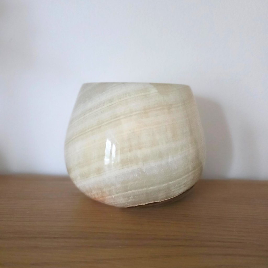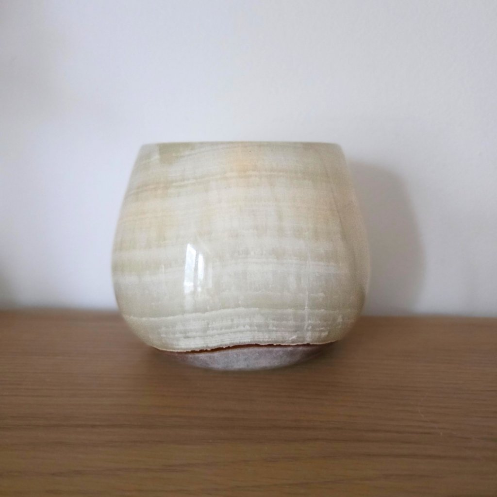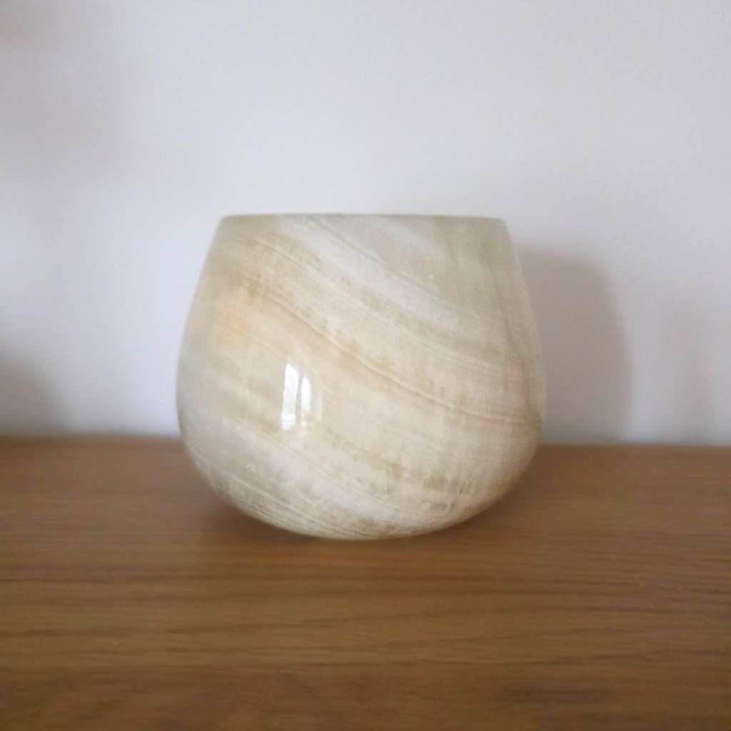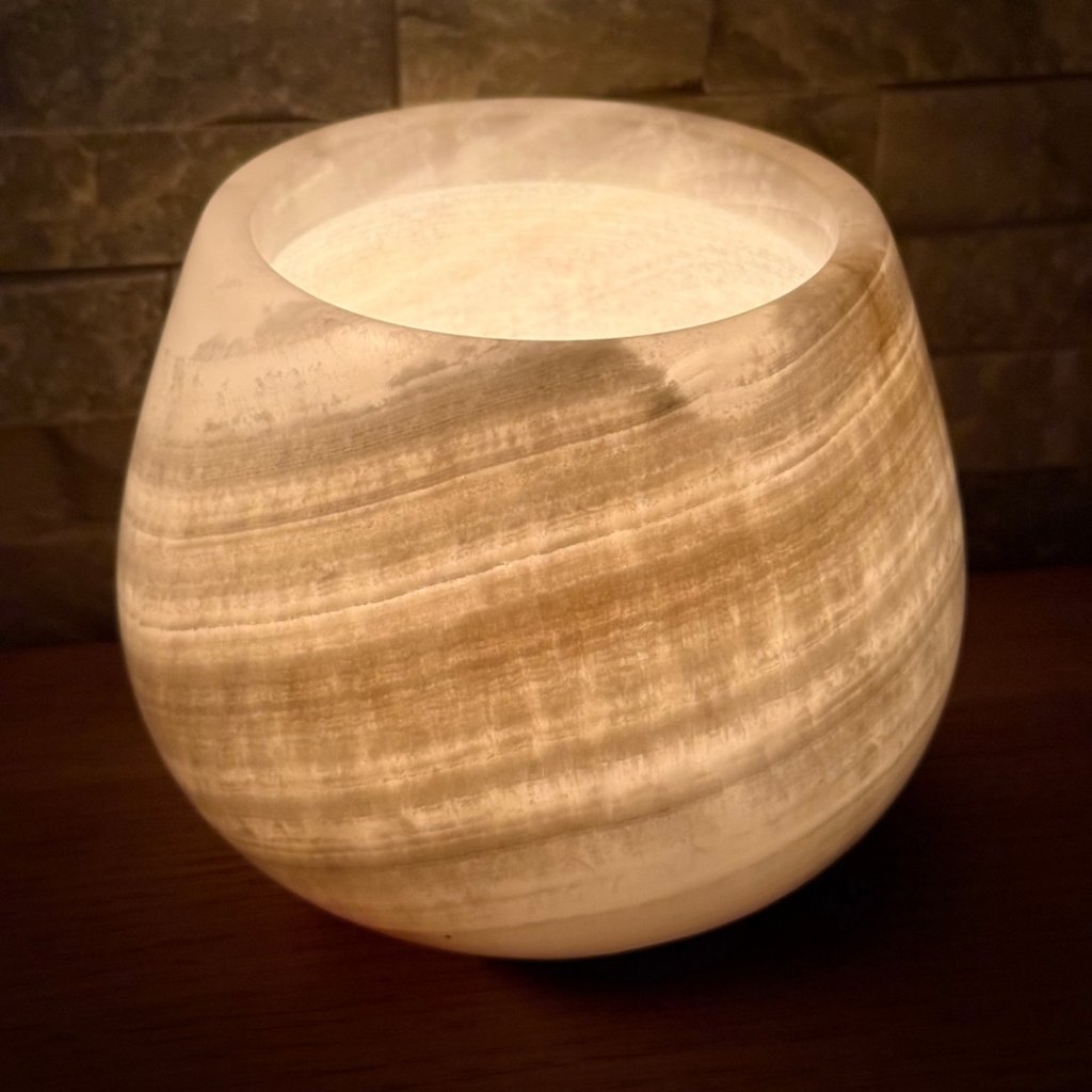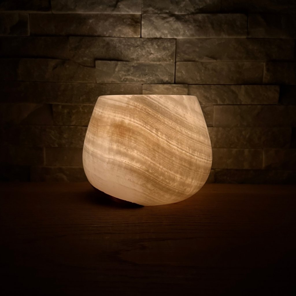 Svícen je vyroben z přírodního aragonitu, známého také jako pákistánský onyx. Tento kámen vyniká pevností, jemným leskem a přirozenou kresbou, která vznikala po tisíce let. Kupujete přesně ten svícen, který vidíte na fotografiích, žádný náhodný výběr, ale konkrétní originální kus.