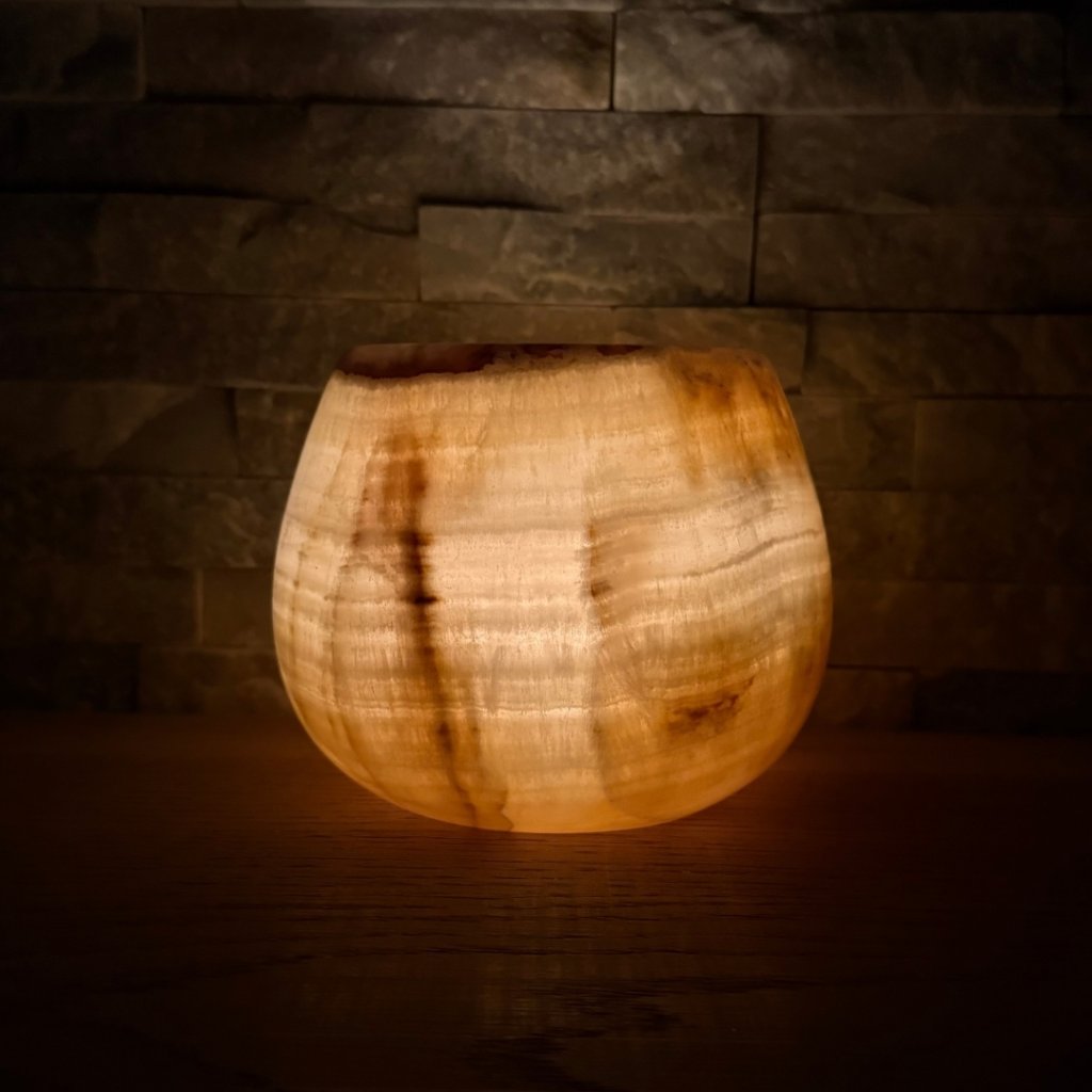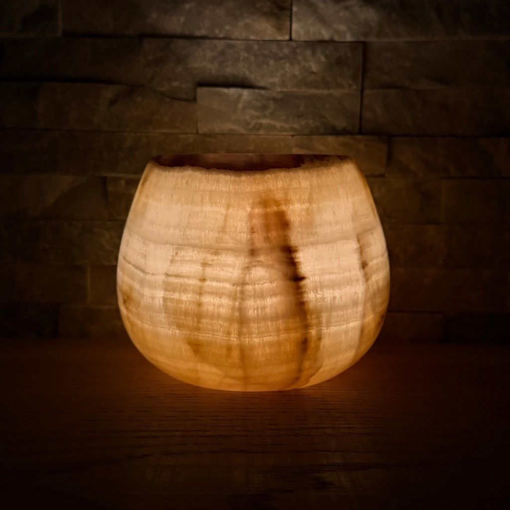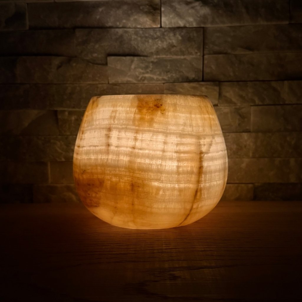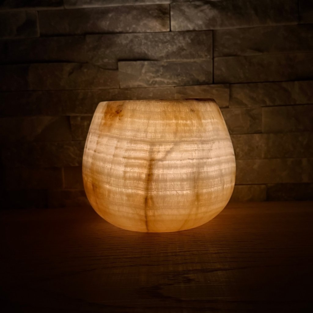 Svícen je vyroben z přírodního aragonitu, známého také jako pákistánský onyx. Tento kámen vyniká pevností, jemným leskem a přirozenou kresbou, která vznikala po tisíce let. Kupujete přesně ten svícen, který vidíte na fotografiích, žádný náhodný výběr, ale konkrétní originální kus.