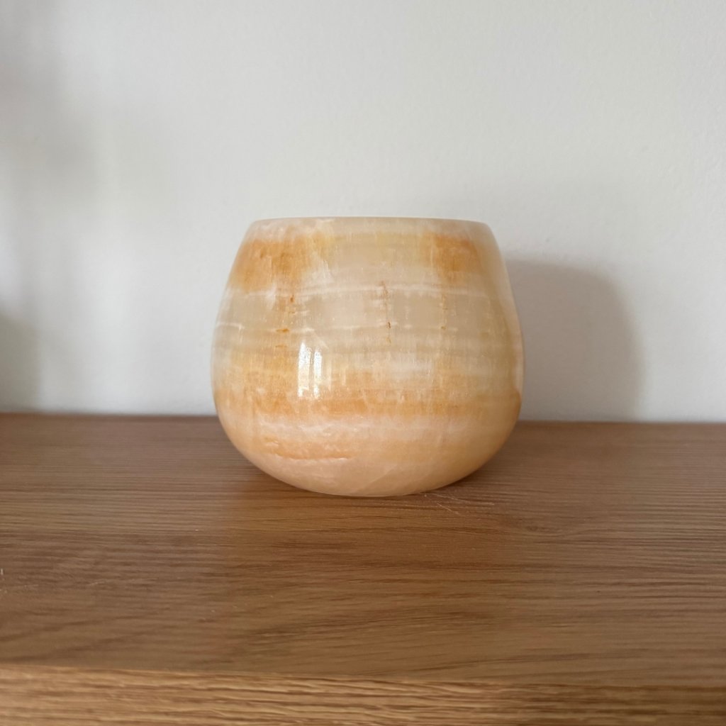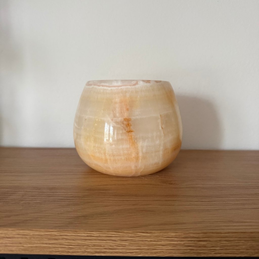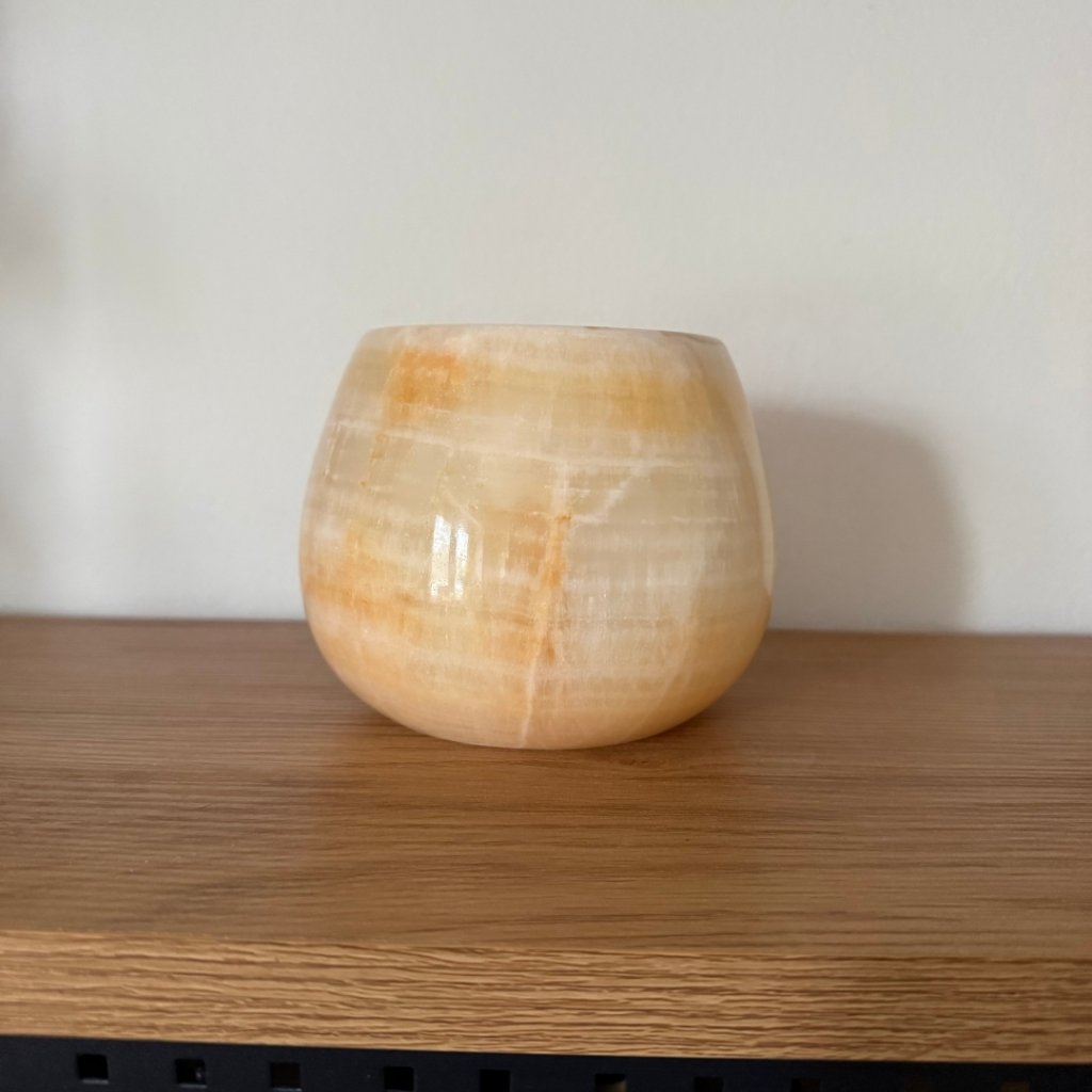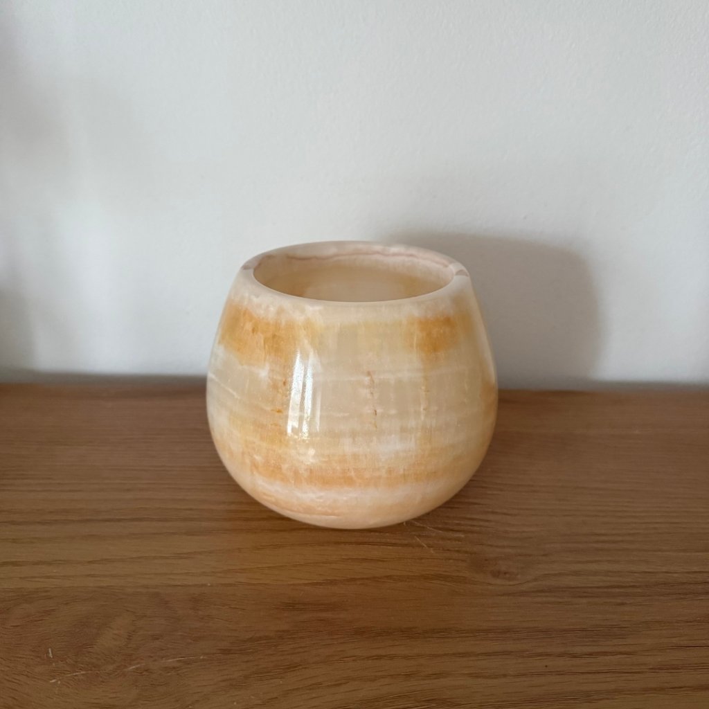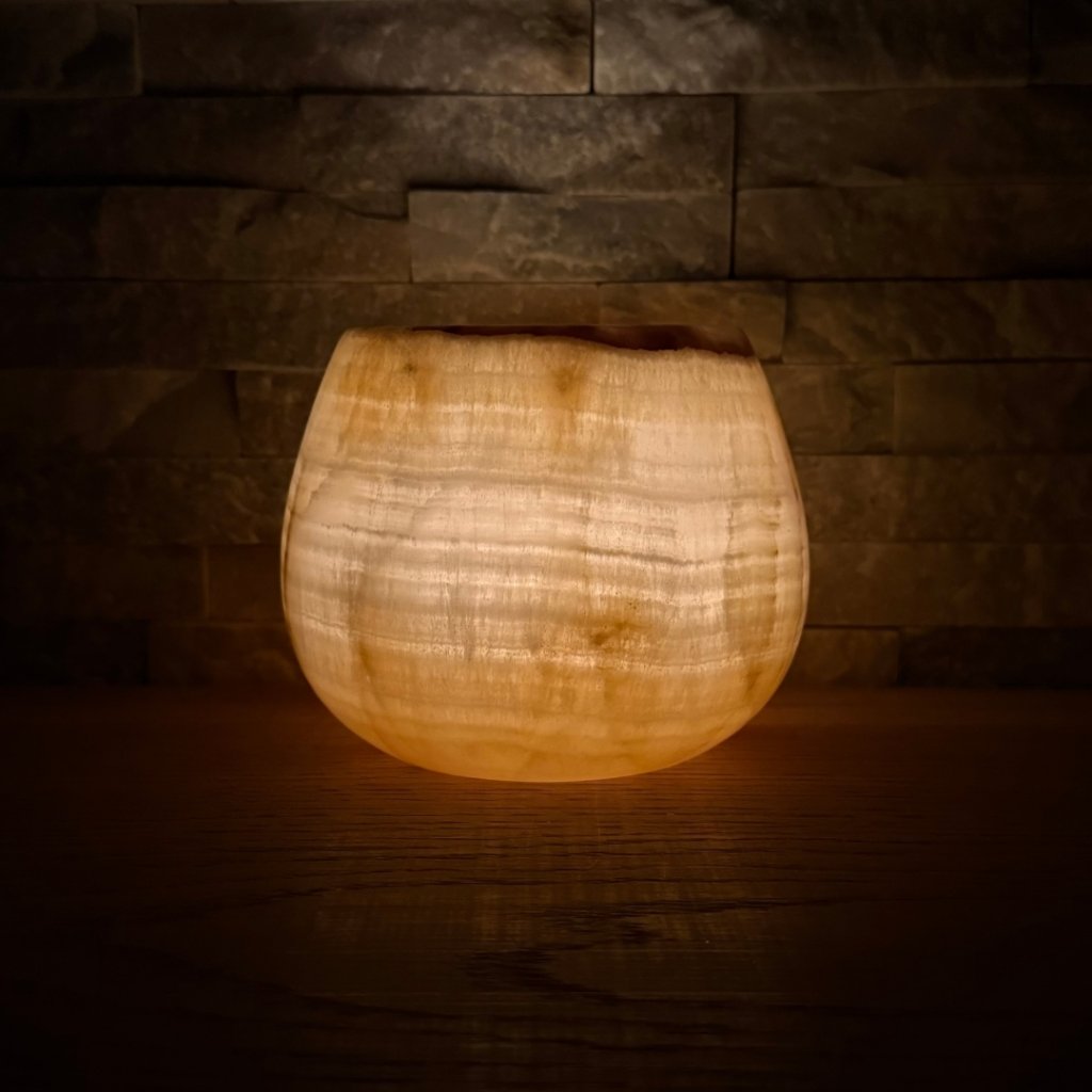 Svícen je vyroben z přírodního aragonitu, známého také jako pákistánský onyx. Tento kámen vyniká pevností, jemným leskem a přirozenou kresbou, která vznikala po tisíce let. Kupujete přesně ten svícen, který vidíte na fotografiích, žádný náhodný výběr, ale konkrétní originální kus.