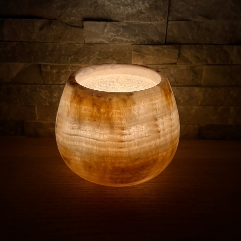 Každý svícen z aragonitu je jedinečný svým vzhledem. Tento konkrétní kus má přesně takovou strukturu, žilkování a barevnost, jakou vidíte na fotkách. Doporučujeme si fotogalerii projít opravdu pečlivě, abyste věděli, jaký svícen si domů vybíráte. Po zapálení čajové svíčky začne světlo jemně prosvítat kamenem a zvýrazní jeho přirozenou kresbu.