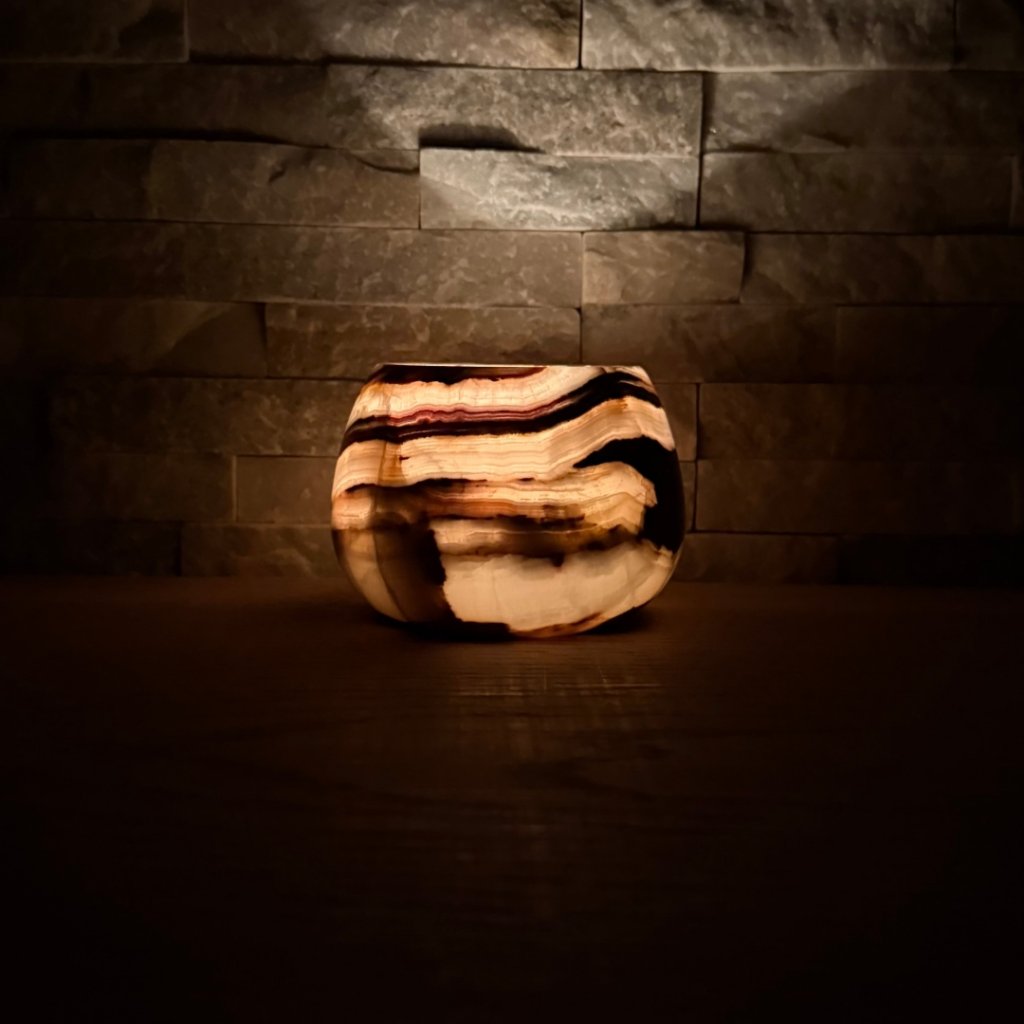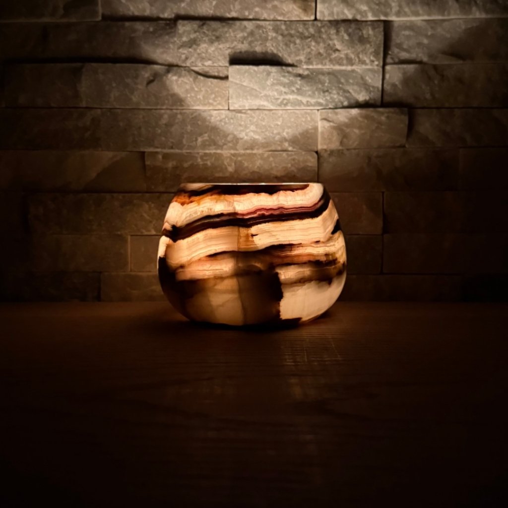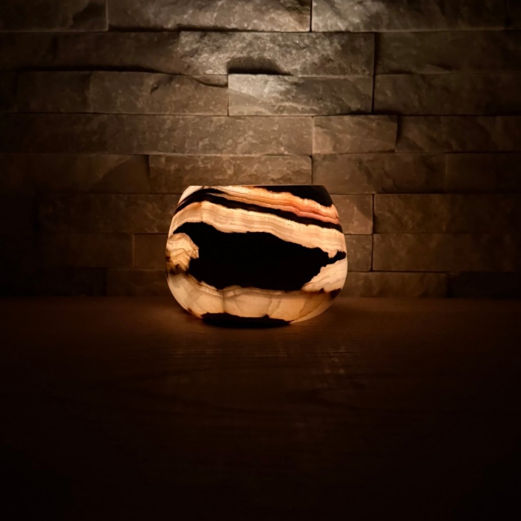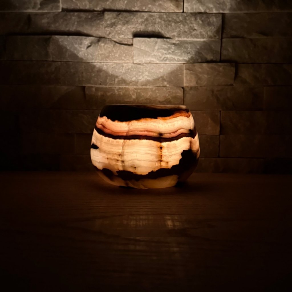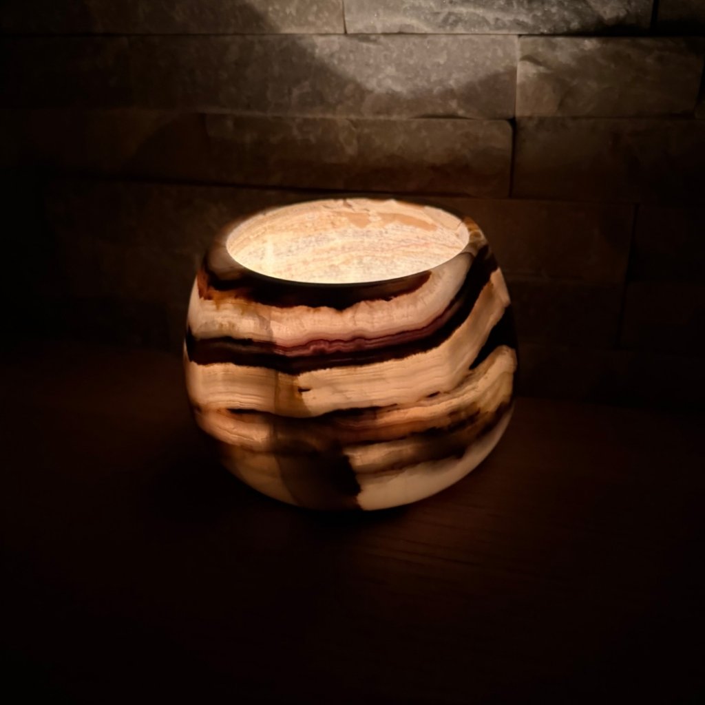Svícen je vyroben z přírodního aragonitu, známého také jako pákistánský onyx. Tento kámen vyniká pevností, jemným leskem a přirozenou kresbou, která vznikala po tisíce let. Kupujete přesně ten svícen, který vidíte na fotografiích, žádný náhodný výběr, ale konkrétní originální kus.