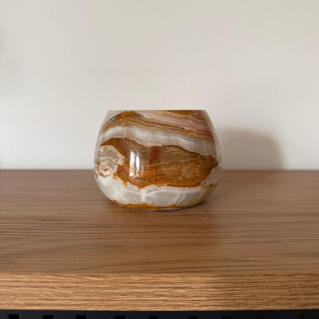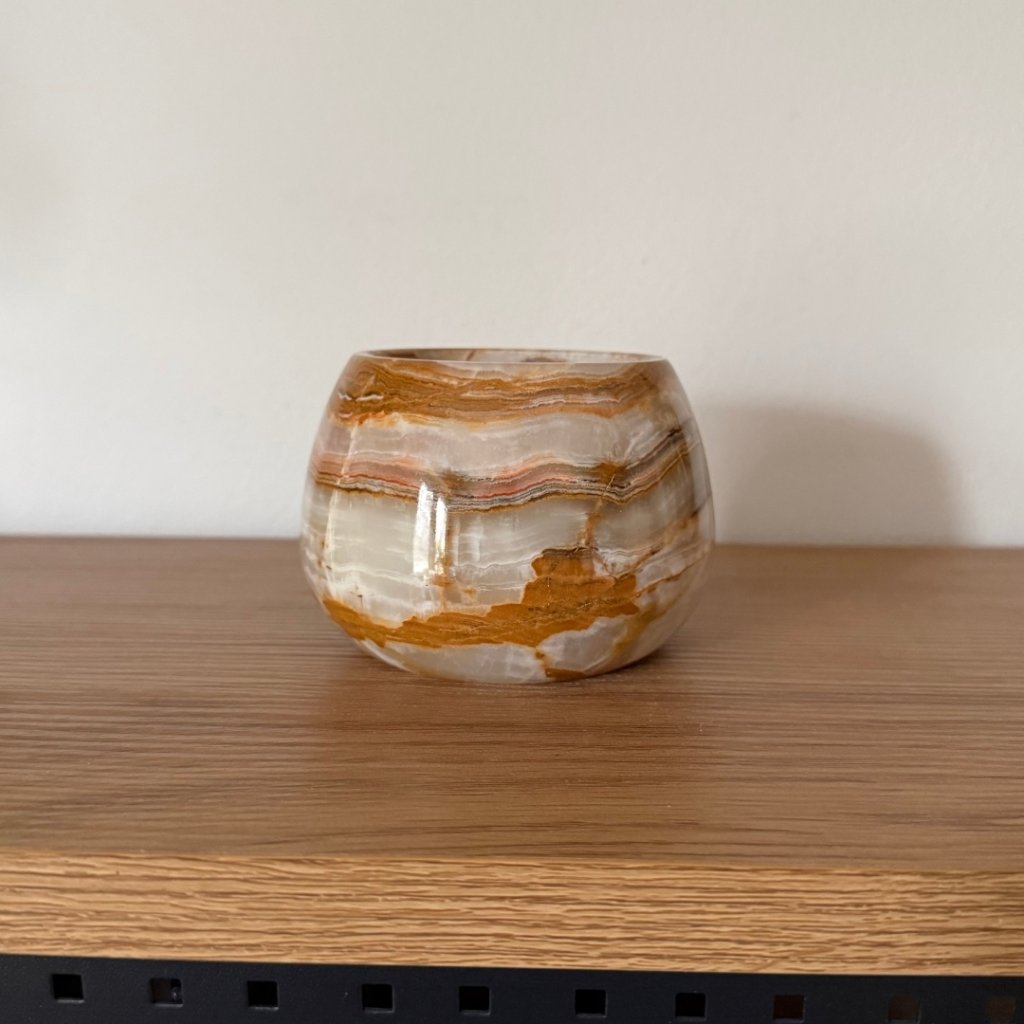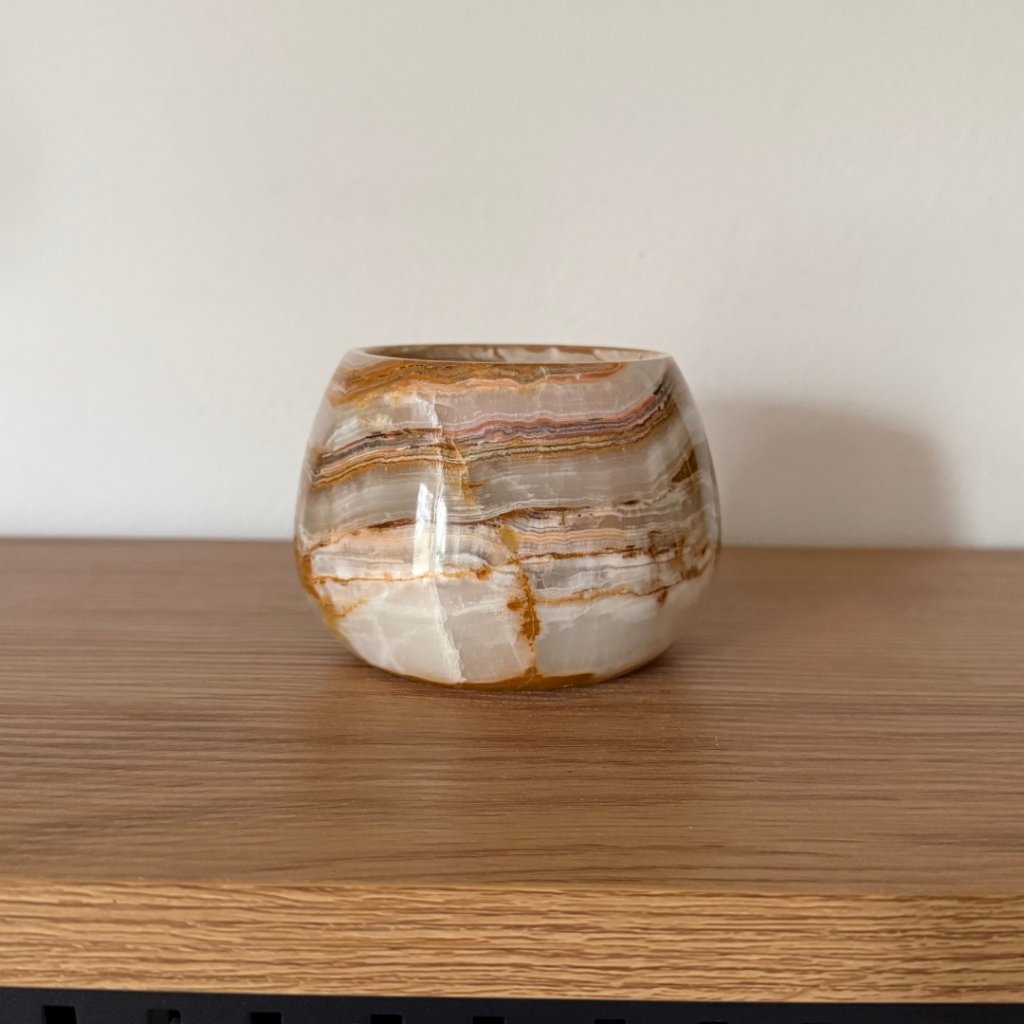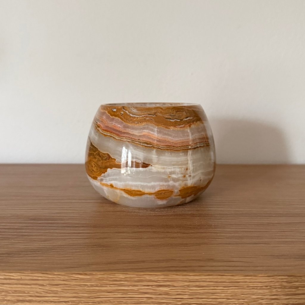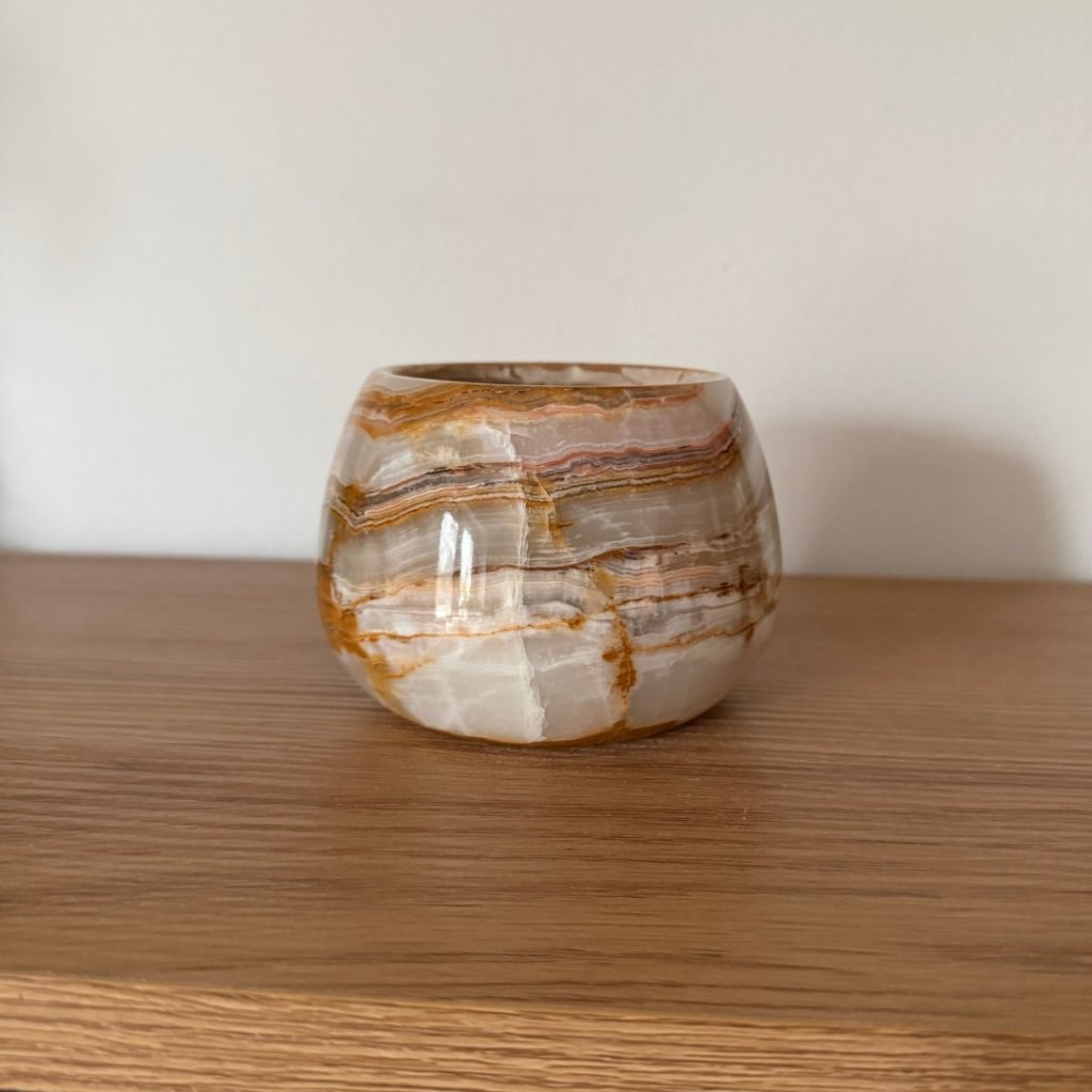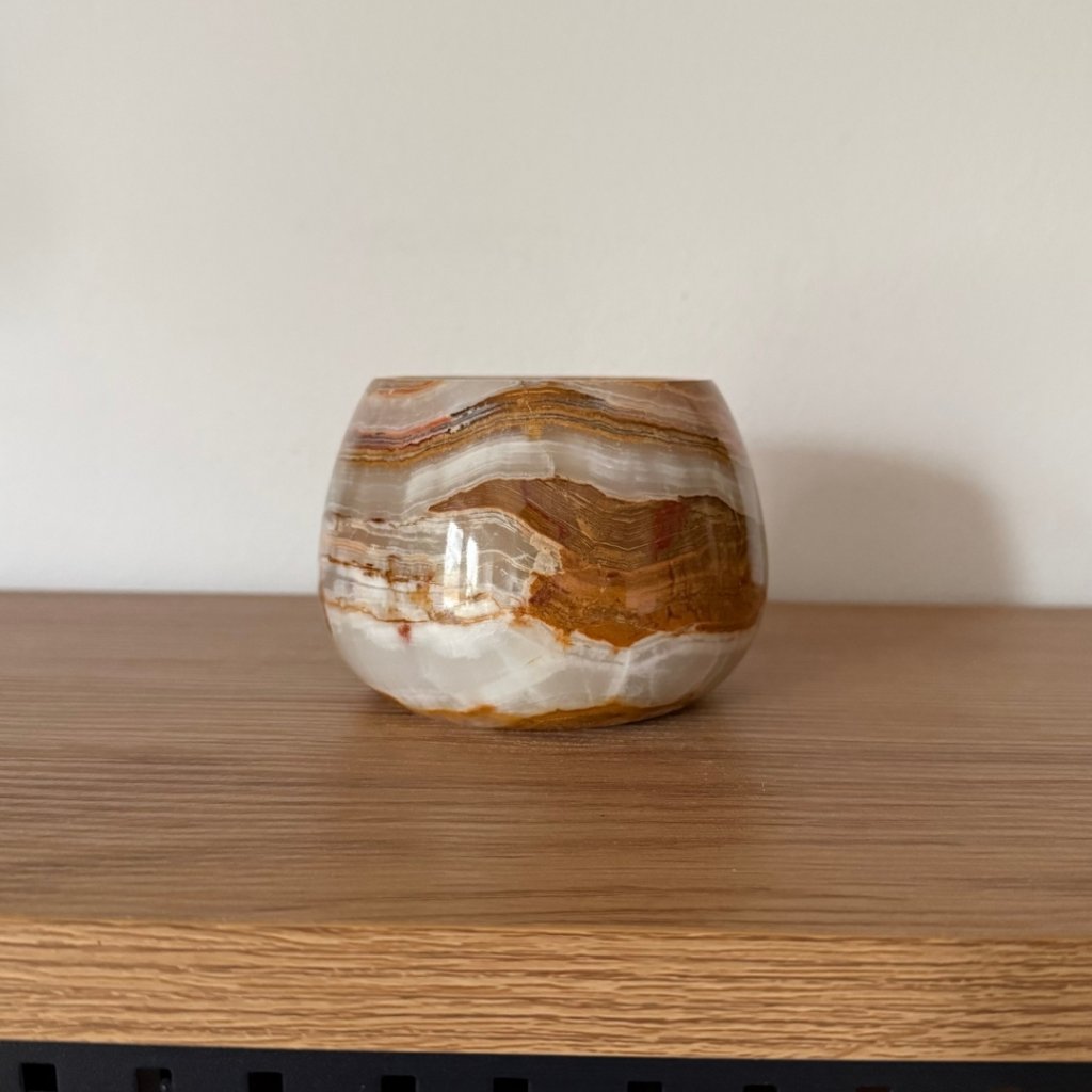 Svícen je vyroben z přírodního aragonitu, známého také jako pákistánský onyx. Tento kámen vyniká pevností, jemným leskem a přirozenou kresbou, která vznikala po tisíce let. Kupujete přesně ten svícen, který vidíte na fotografiích, žádný náhodný výběr, ale konkrétní originální kus.