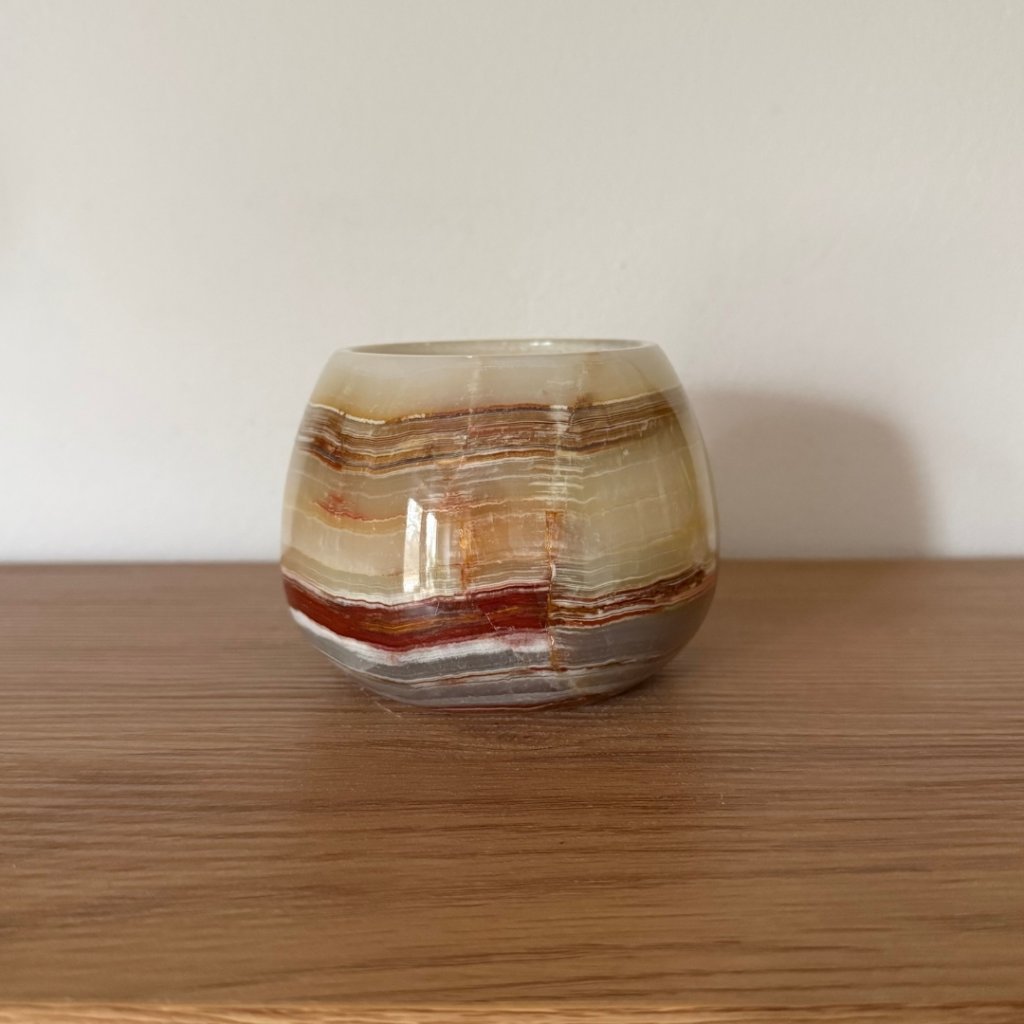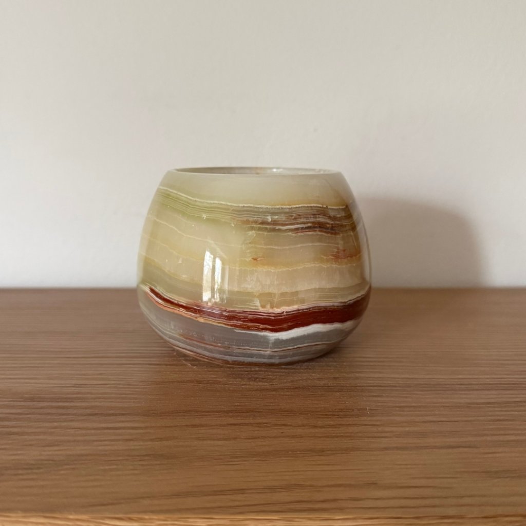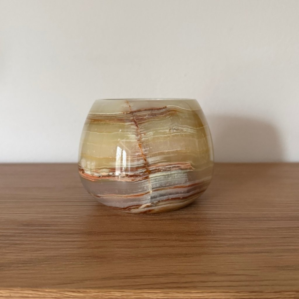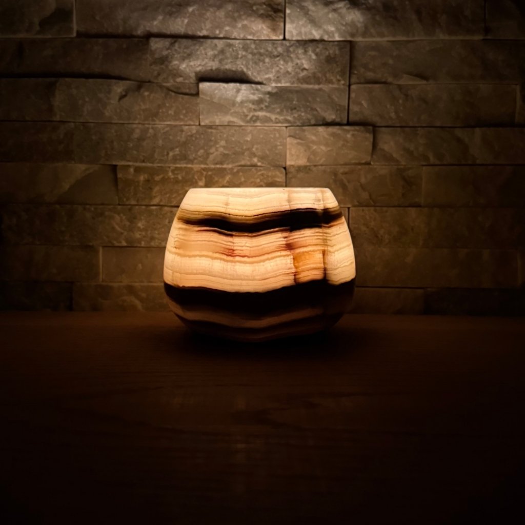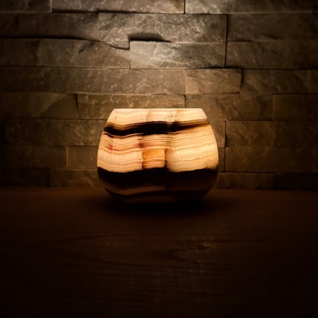 Svícen je vyroben z přírodního aragonitu, známého také jako pákistánský onyx. Tento kámen vyniká pevností, jemným leskem a přirozenou kresbou, která vznikala po tisíce let. Kupujete přesně ten svícen, který vidíte na fotografiích, žádný náhodný výběr, ale konkrétní originální kus.
