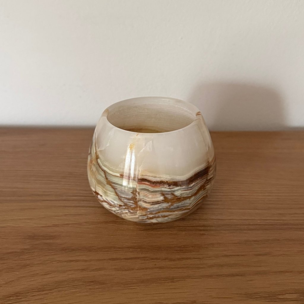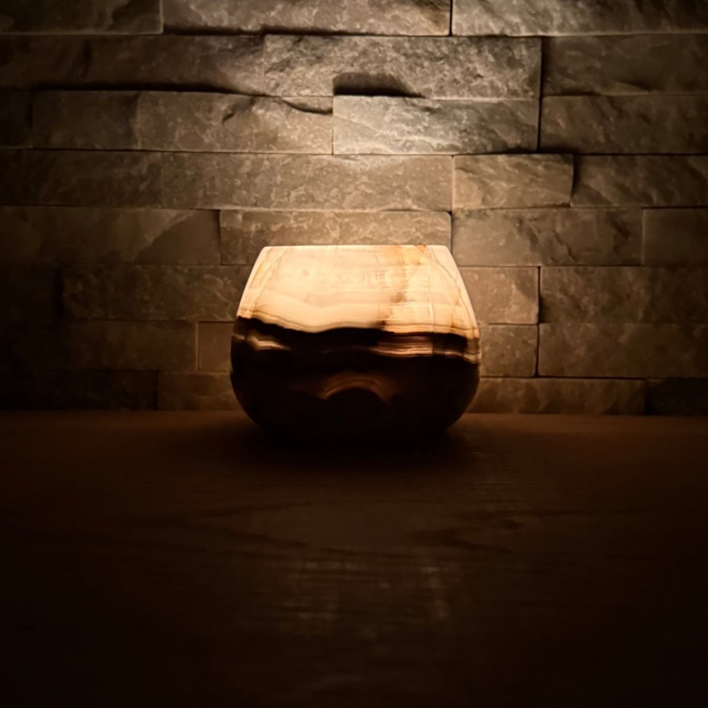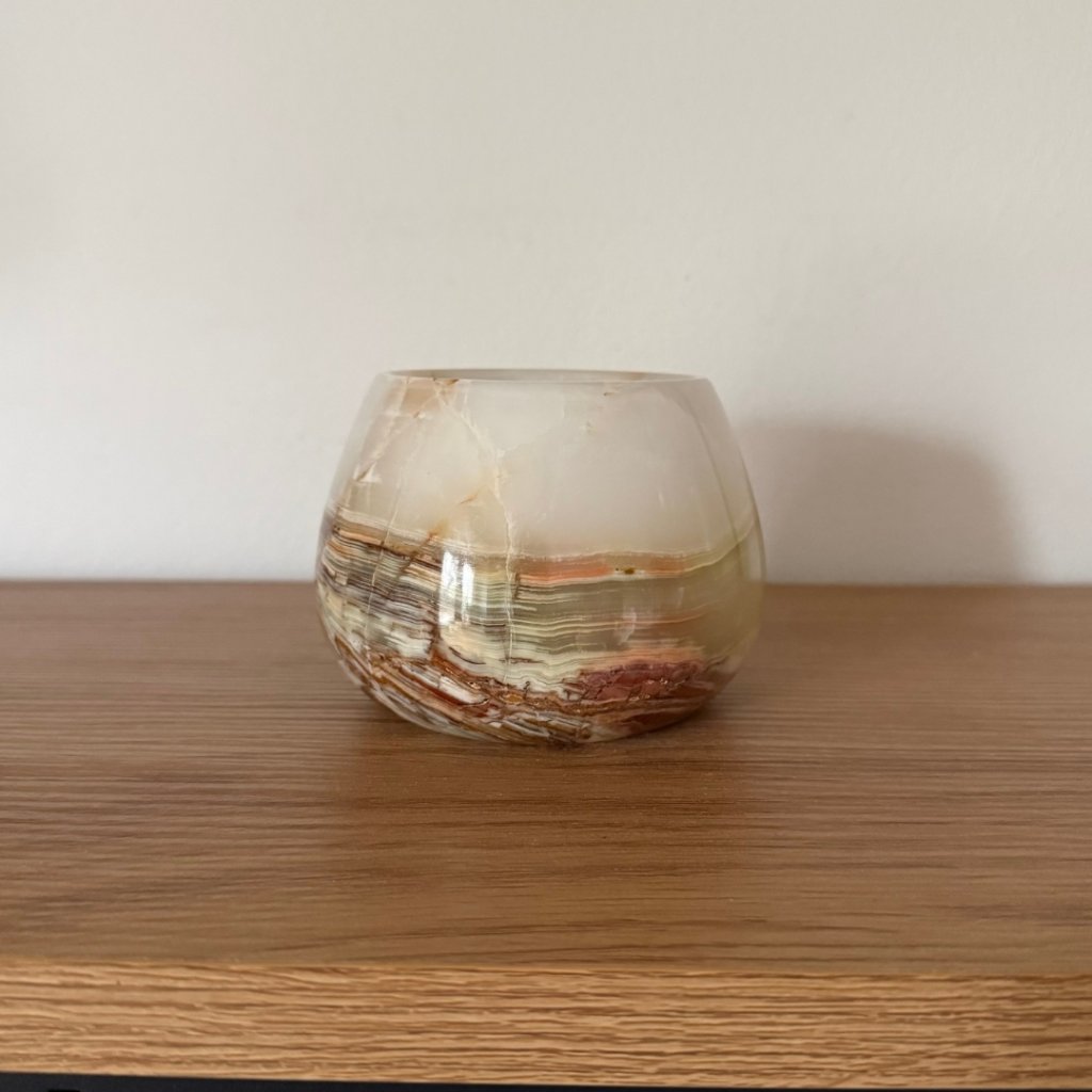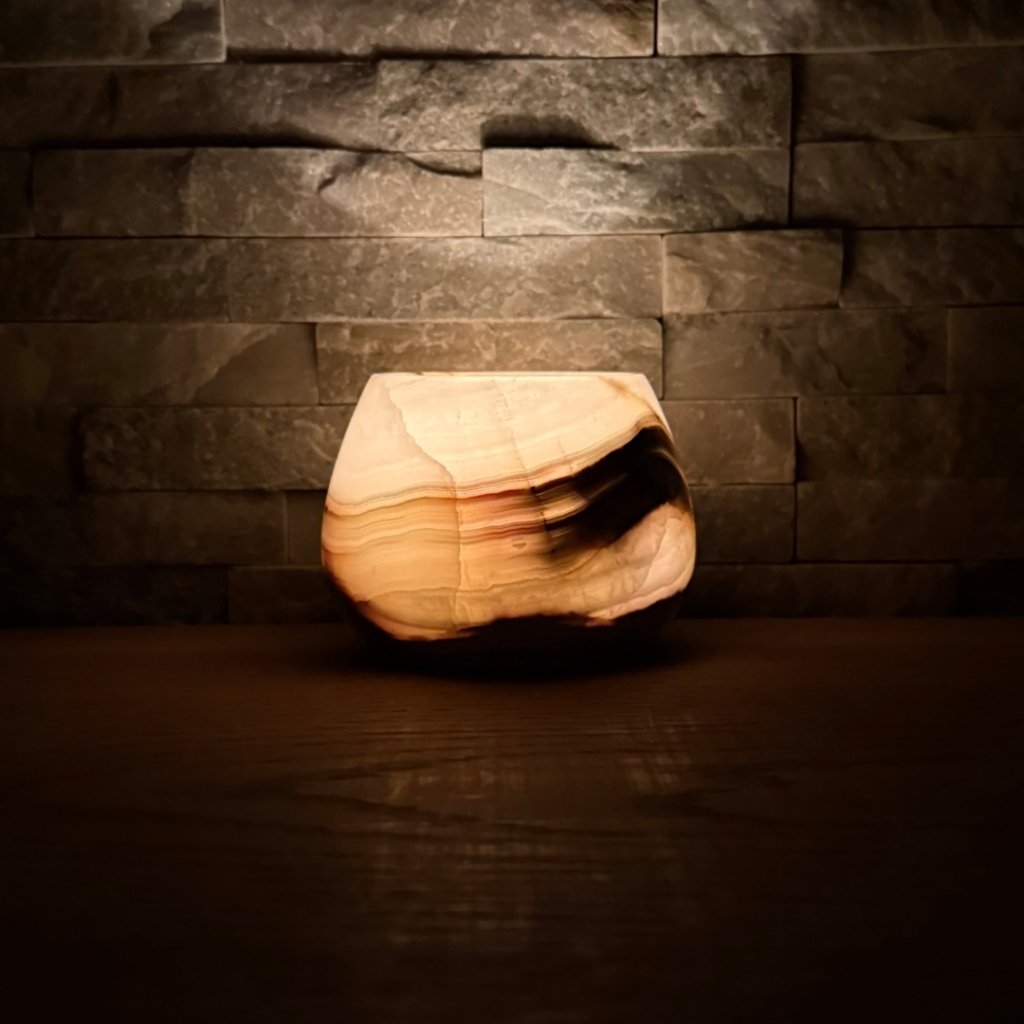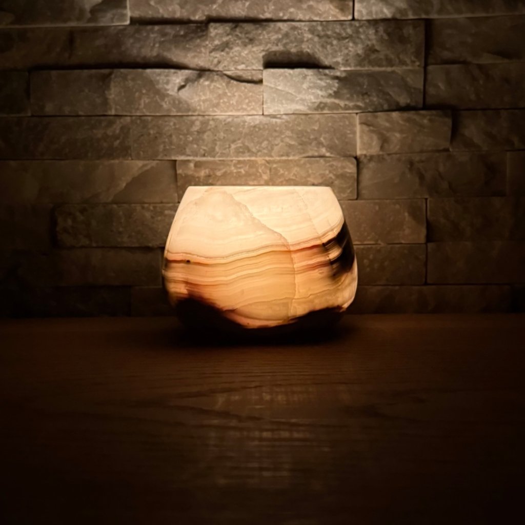 Svícen je vyroben z přírodního aragonitu, známého také jako pákistánský onyx. Tento kámen vyniká pevností, jemným leskem a přirozenou kresbou, která vznikala po tisíce let. Kupujete přesně ten svícen, který vidíte na fotografiích, žádný náhodný výběr, ale konkrétní originální kus.