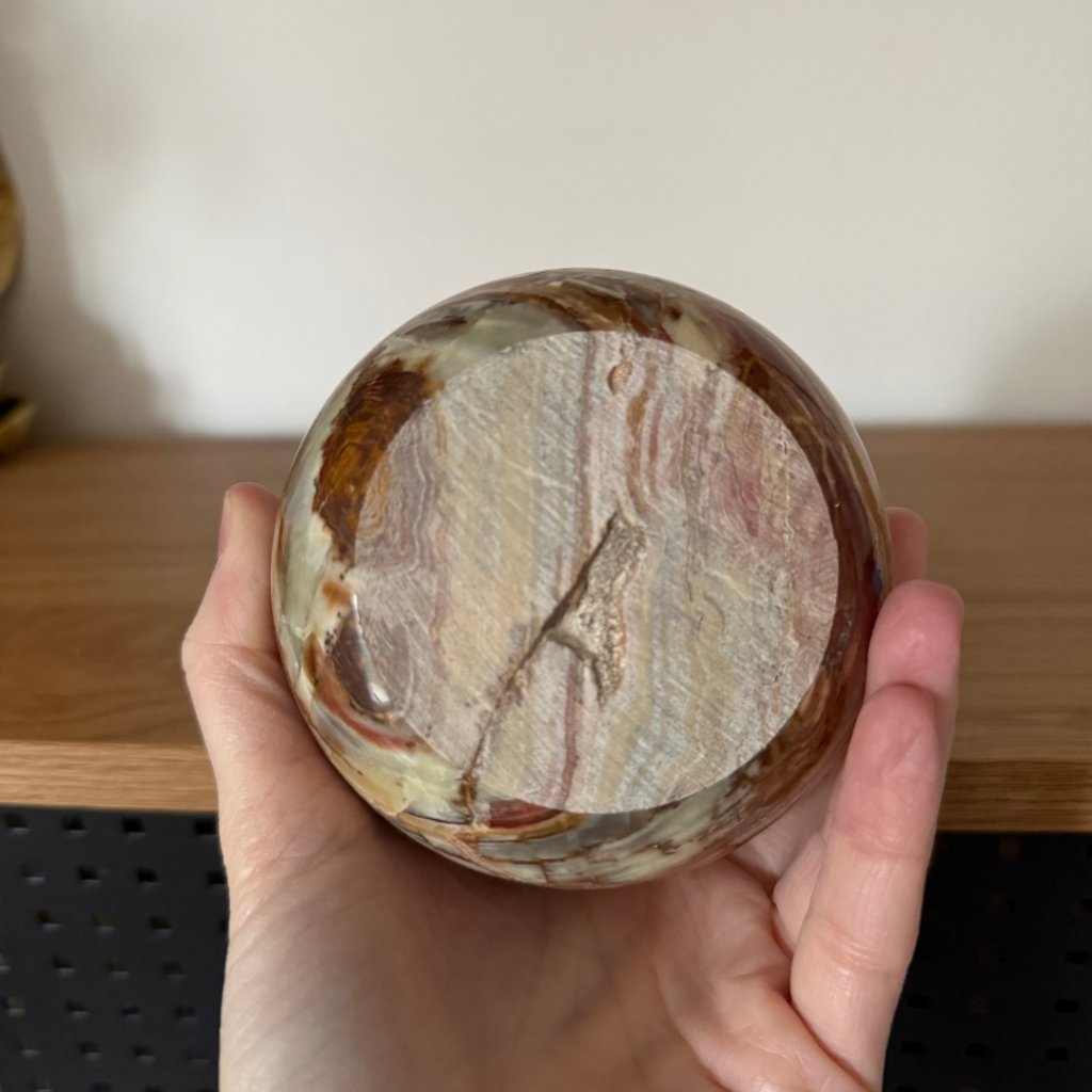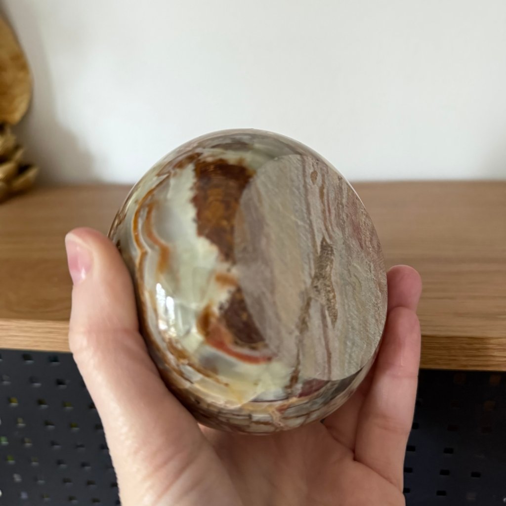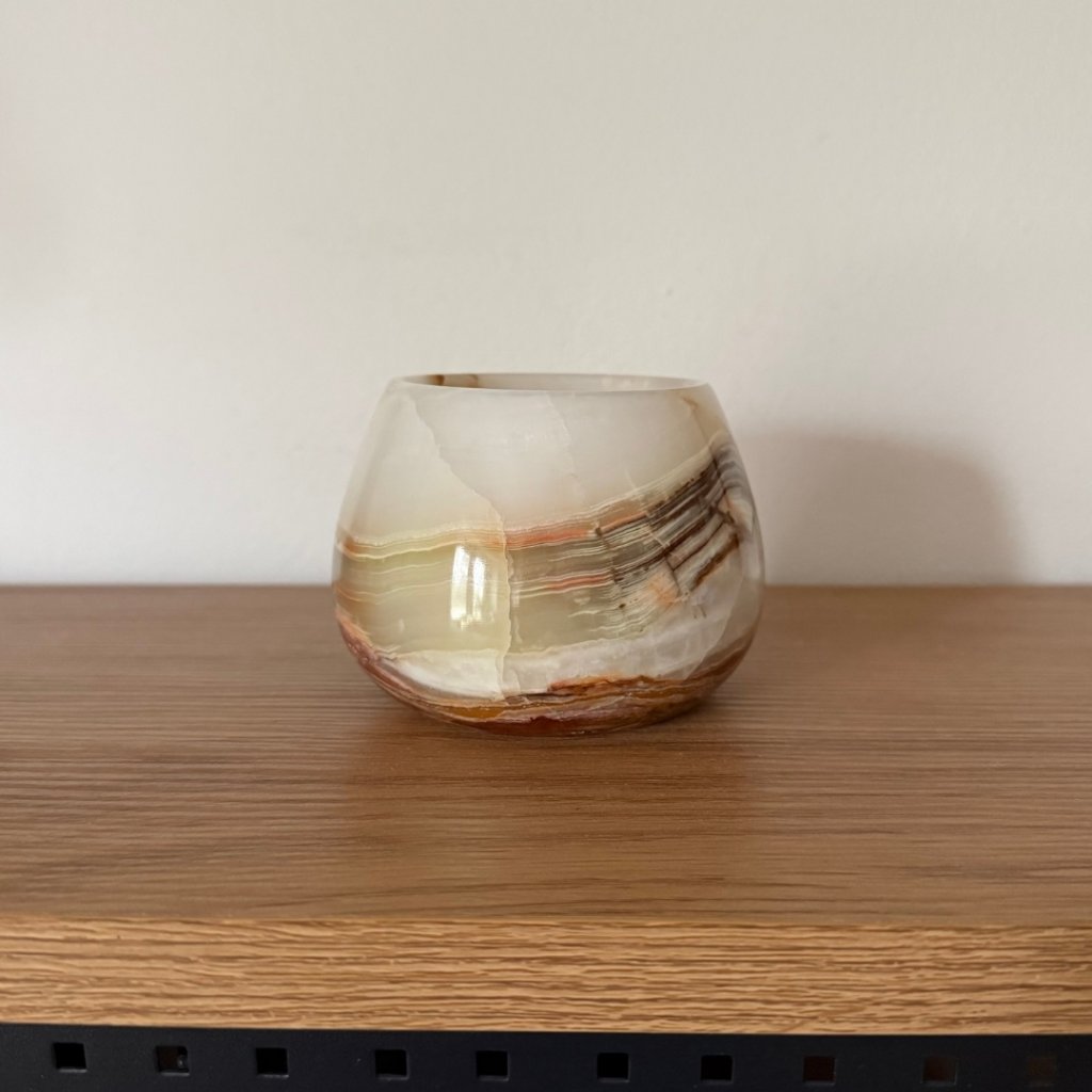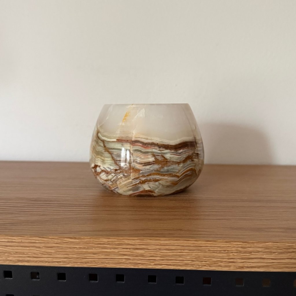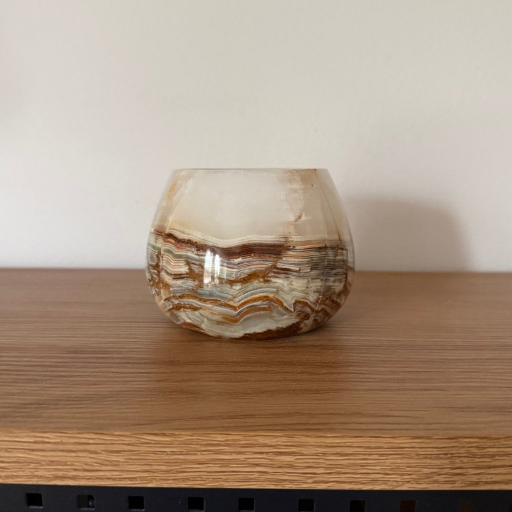 Svícen je vyroben z přírodního aragonitu, známého také jako pákistánský onyx. Tento kámen vyniká pevností, jemným leskem a přirozenou kresbou, která vznikala po tisíce let. Kupujete přesně ten svícen, který vidíte na fotografiích, žádný náhodný výběr, ale konkrétní originální kus.