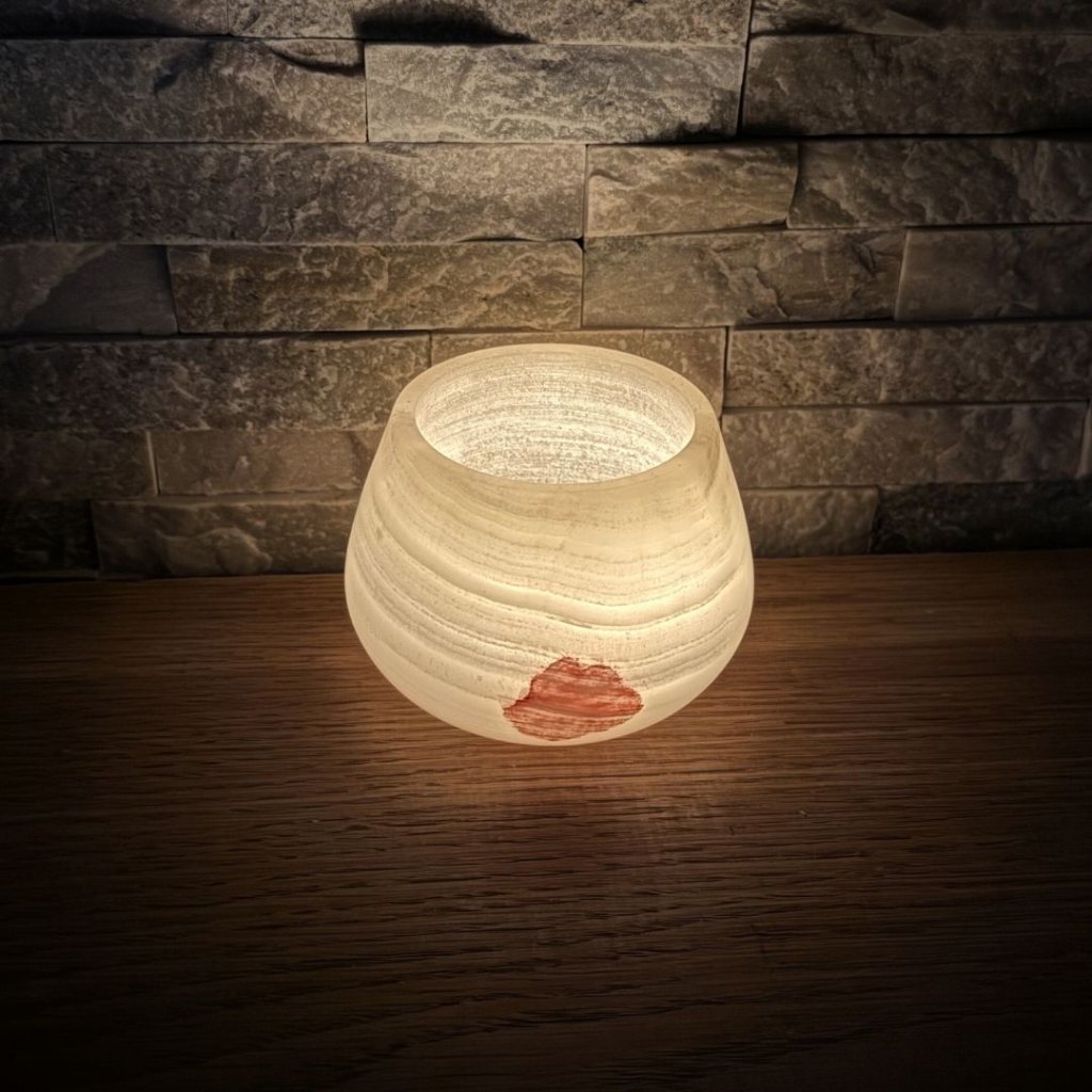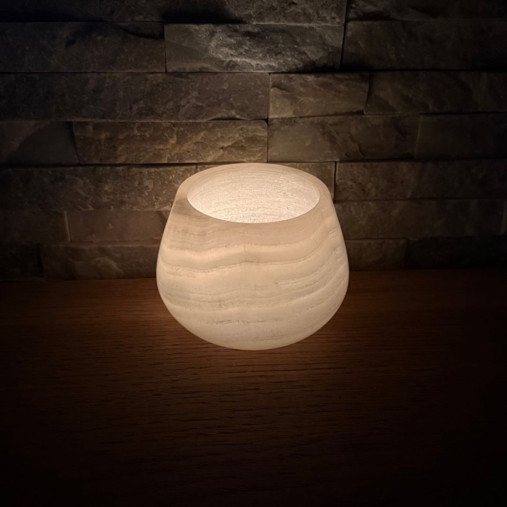 Každý svícen z aragonitu je jedinečný svým vzhledem. Tento konkrétní kus má přesně takovou strukturu, žilkování a barevnost, jakou vidíte na fotkách. Doporučujeme si fotogalerii projít opravdu pečlivě, abyste věděli, jaký svícen si domů vybíráte. Po zapálení čajové svíčky začne světlo jemně prosvítat kamenem a zvýrazní jeho přirozenou kresbu.