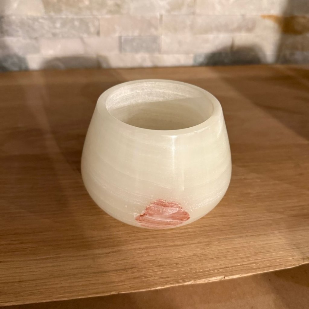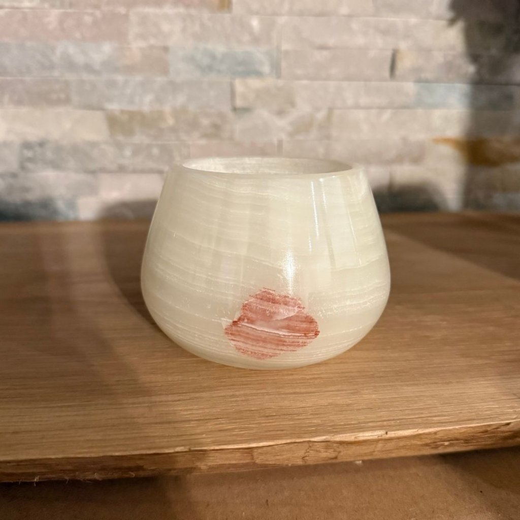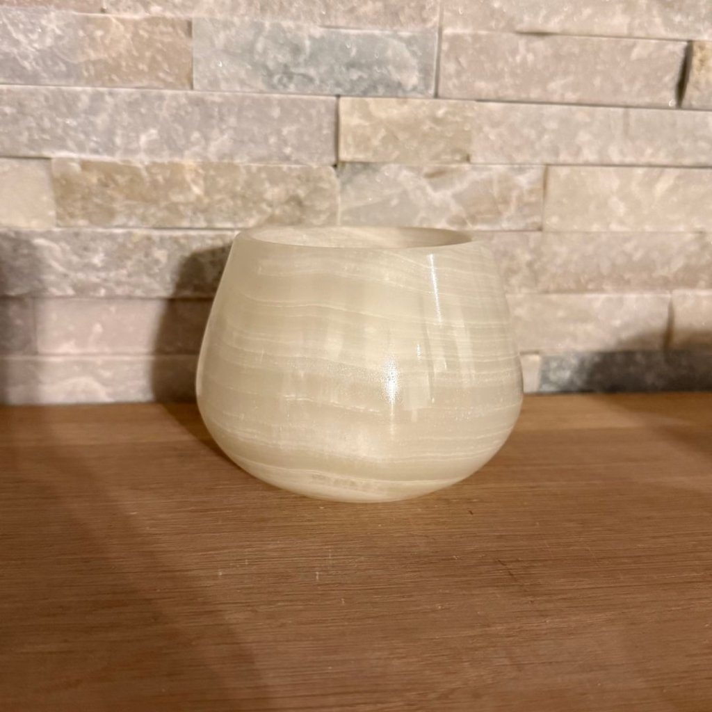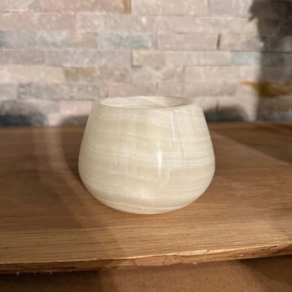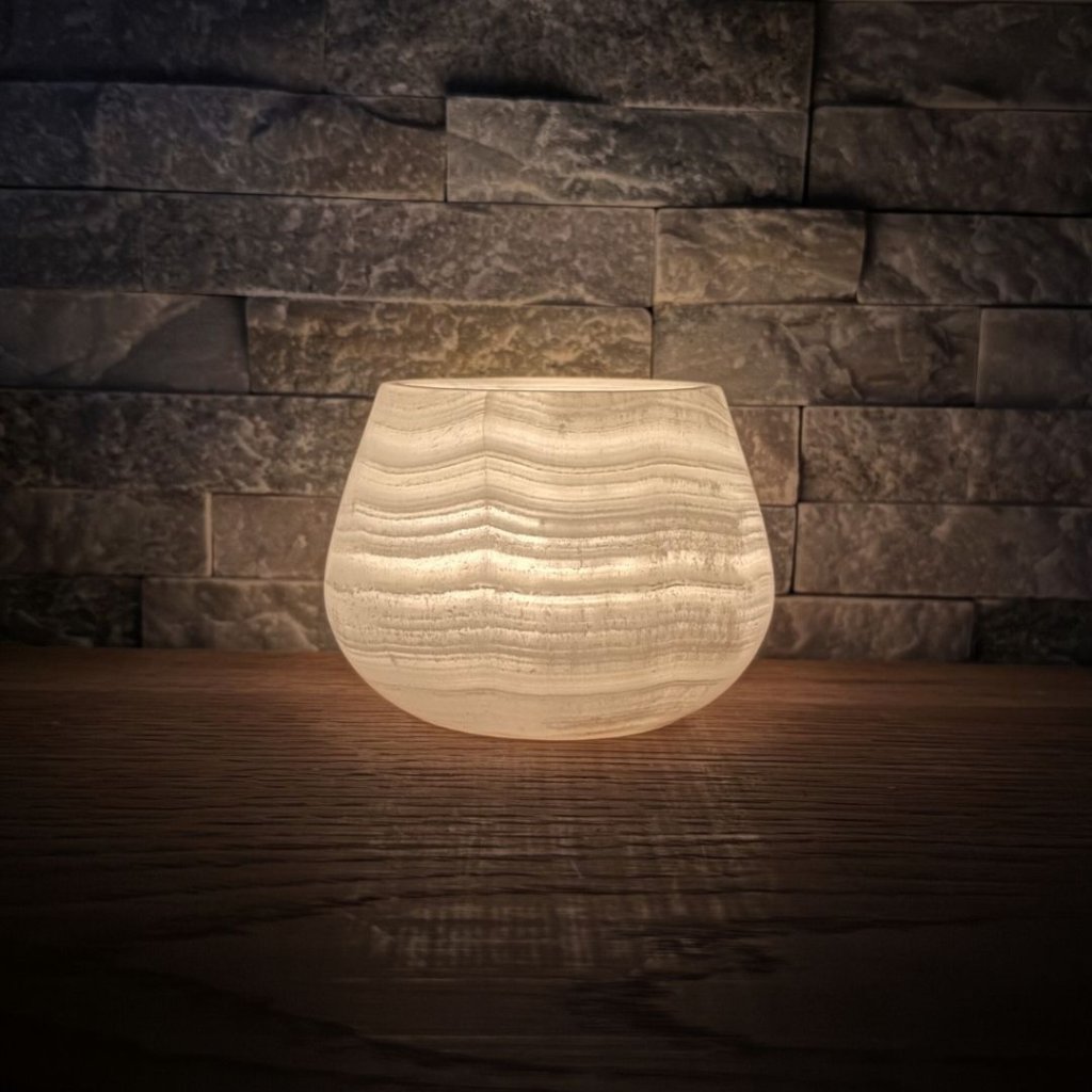Svícen je vyroben z přírodního aragonitu, známého také jako pákistánský onyx. Tento kámen vyniká pevností, jemným leskem a přirozenou kresbou, která vznikala po tisíce let. Kupujete přesně ten svícen, který vidíte na fotografiích, žádný náhodný výběr, ale konkrétní originální kus.