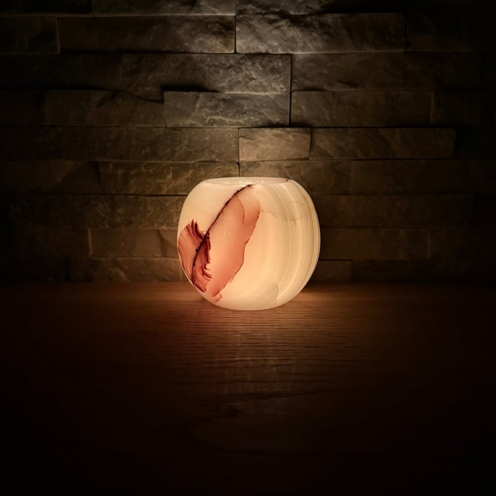 Každý svícen z aragonitu je jedinečný svým vzhledem. Tento konkrétní kus má přesně takovou strukturu, žilkování a barevnost, jakou vidíte na fotkách. Doporučujeme si fotogalerii projít opravdu pečlivě, abyste věděli, jaký svícen si domů vybíráte. Po zapálení čajové svíčky začne světlo jemně prosvítat kamenem a zvýrazní jeho přirozenou kresbu.