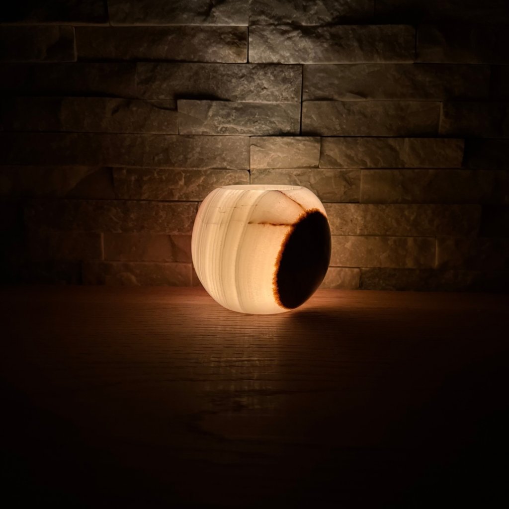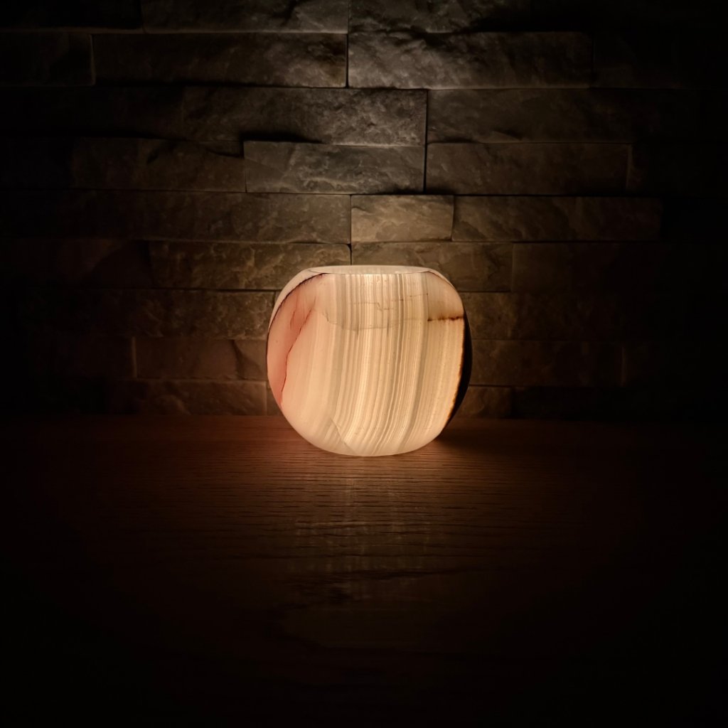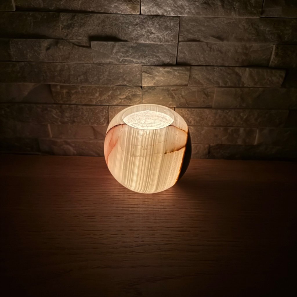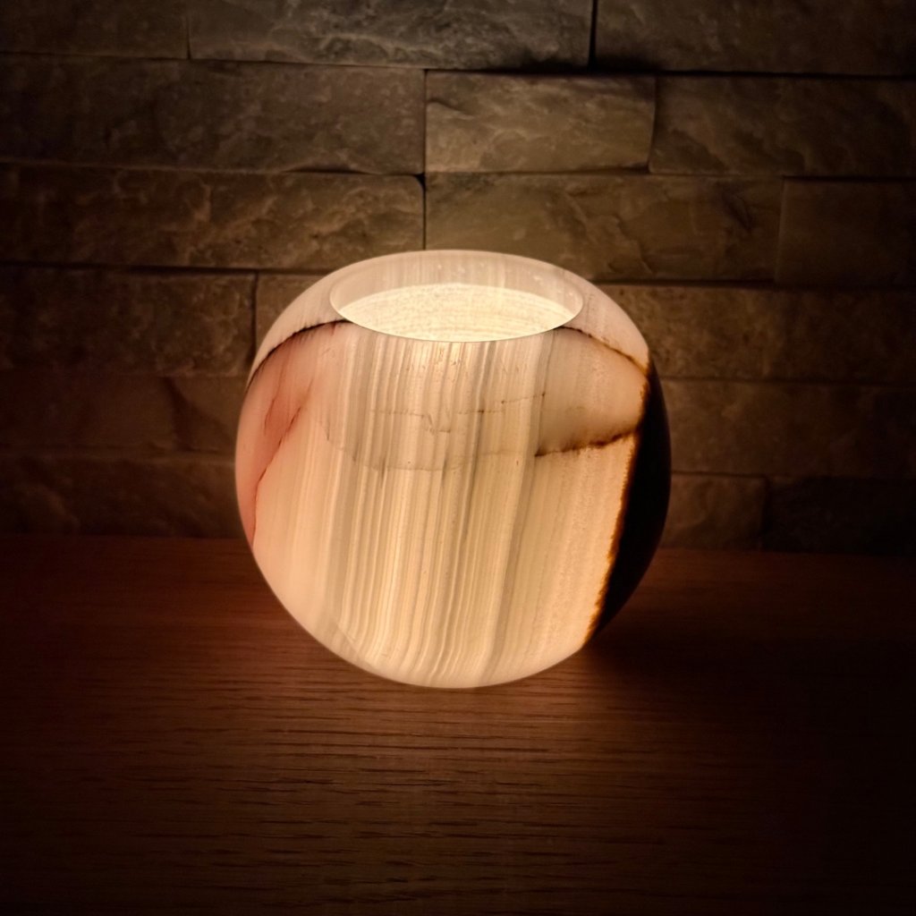 Svícen je vyroben z přírodního aragonitu, známého také jako pákistánský onyx. Tento kámen vyniká pevností, jemným leskem a přirozenou kresbou, která vznikala po tisíce let. Kupujete přesně ten svícen, který vidíte na fotografiích, žádný náhodný výběr, ale konkrétní originální kus.
