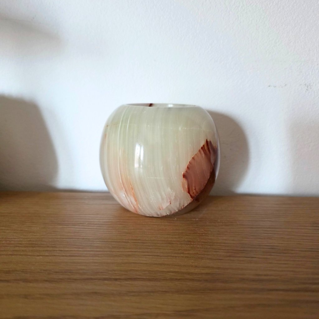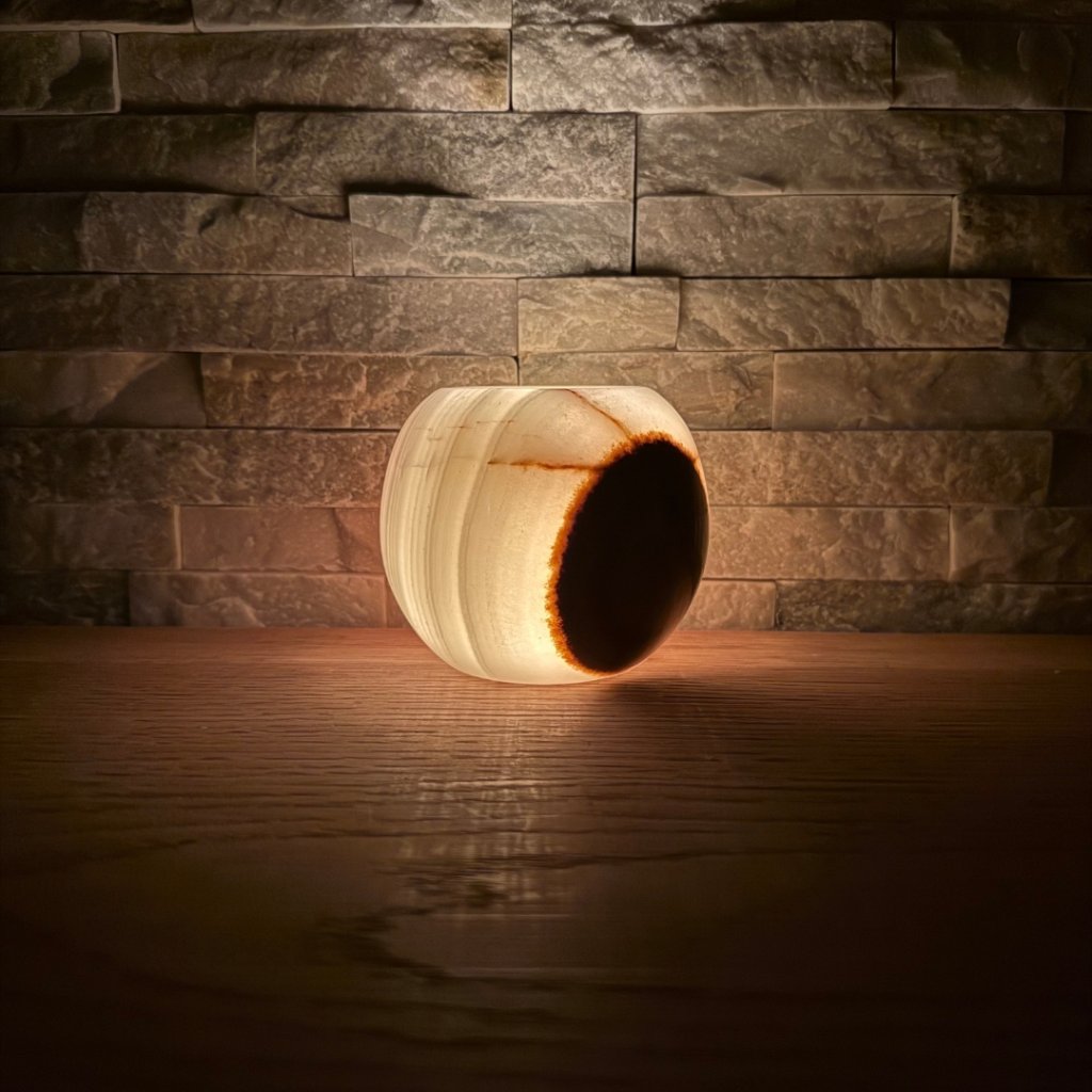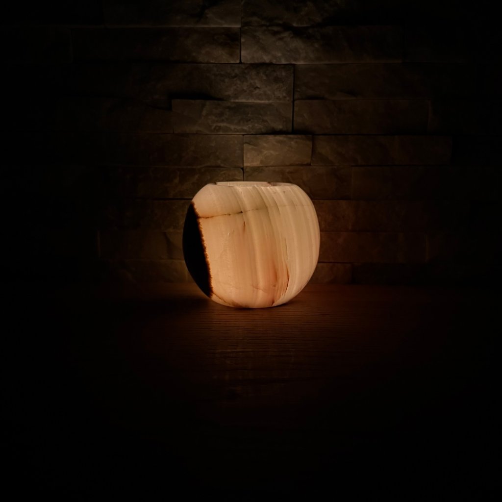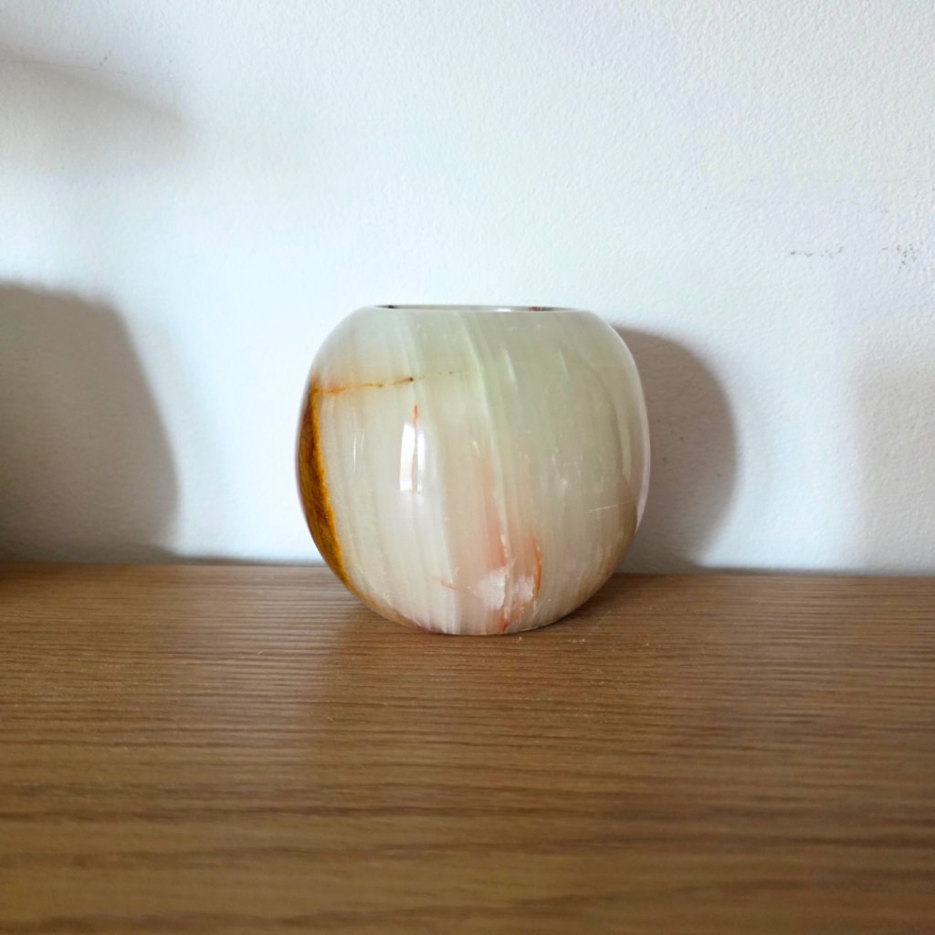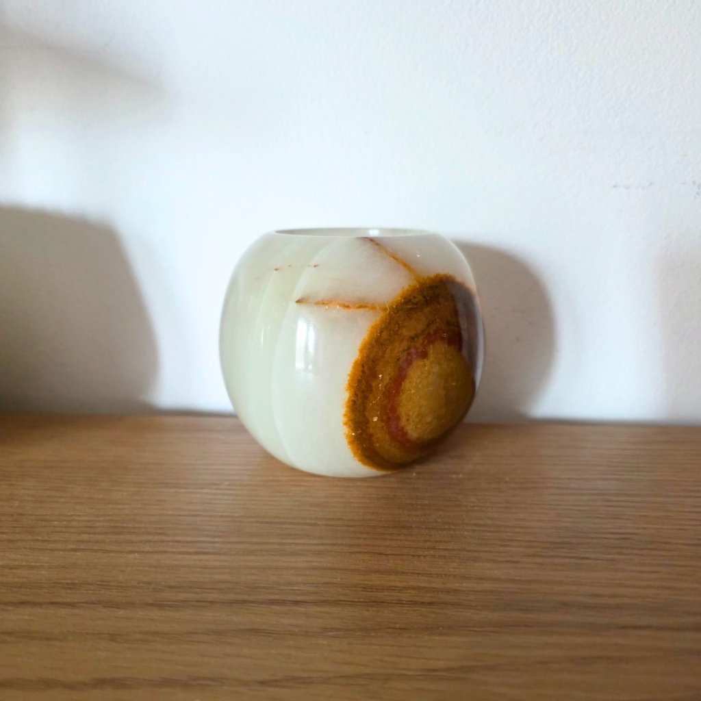 Svícen je vyroben z přírodního aragonitu, známého také jako pákistánský onyx. Tento kámen vyniká pevností, jemným leskem a přirozenou kresbou, která vznikala po tisíce let. Kupujete přesně ten svícen, který vidíte na fotografiích, žádný náhodný výběr, ale konkrétní originální kus.