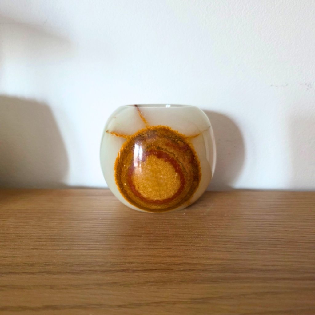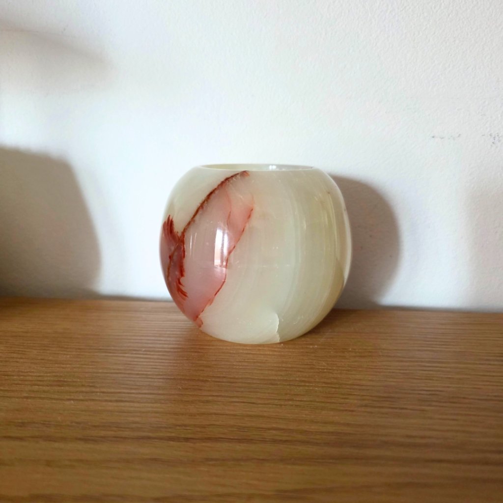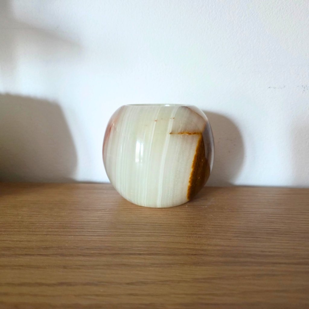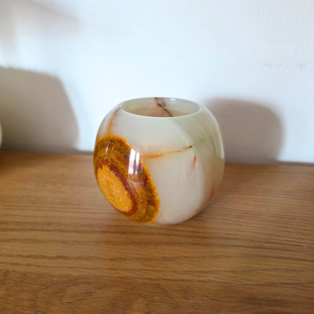 Svícen je vyroben z přírodního aragonitu, známého také jako pákistánský onyx. Tento kámen vyniká pevností, jemným leskem a přirozenou kresbou, která vznikala po tisíce let. Kupujete přesně ten svícen, který vidíte na fotografiích, žádný náhodný výběr, ale konkrétní originální kus.