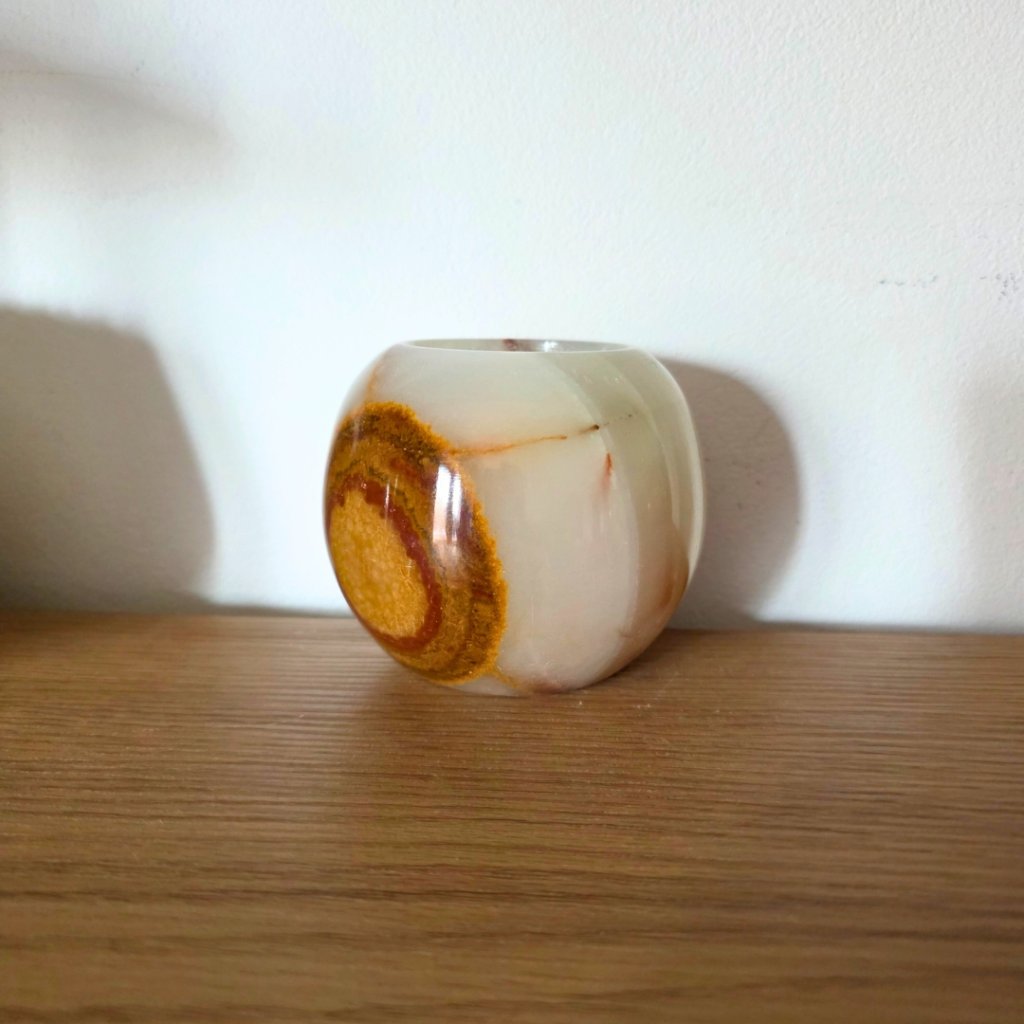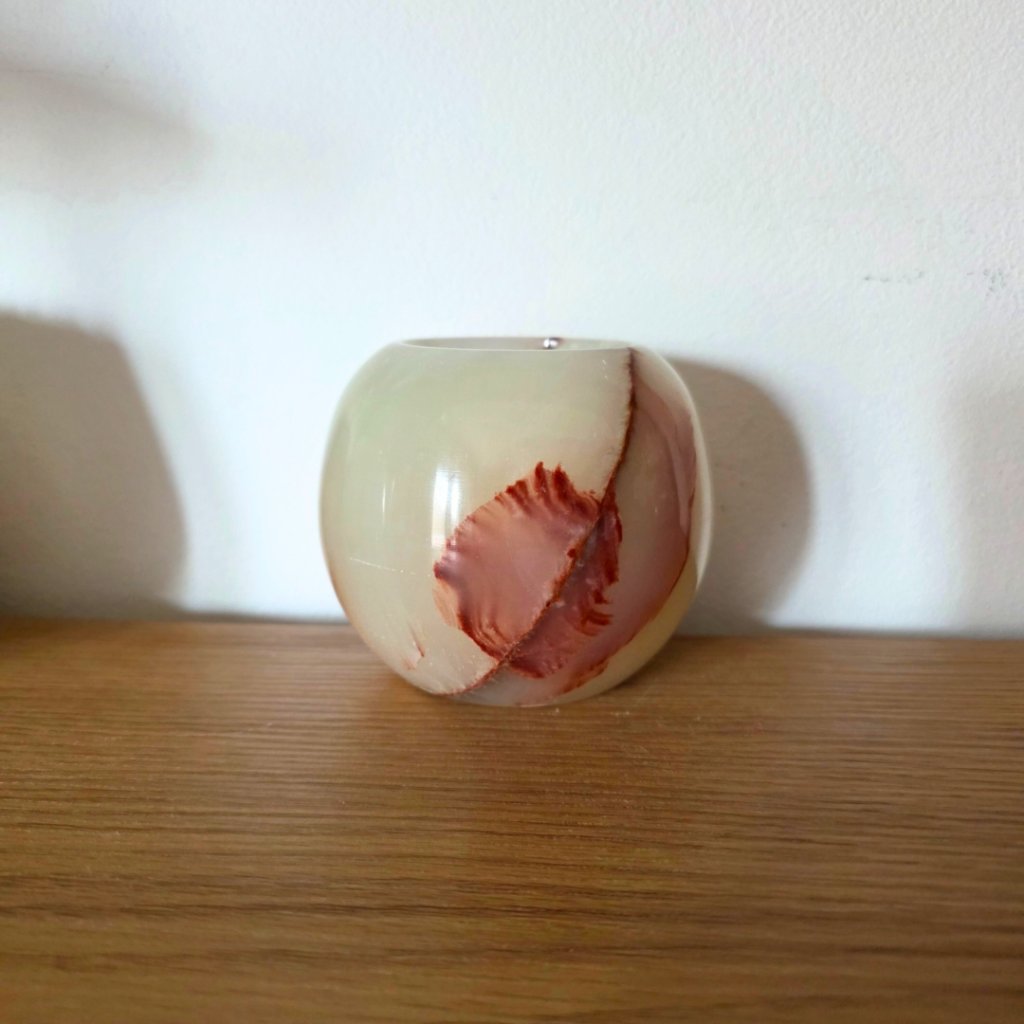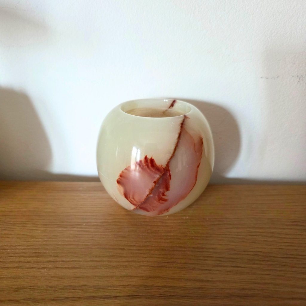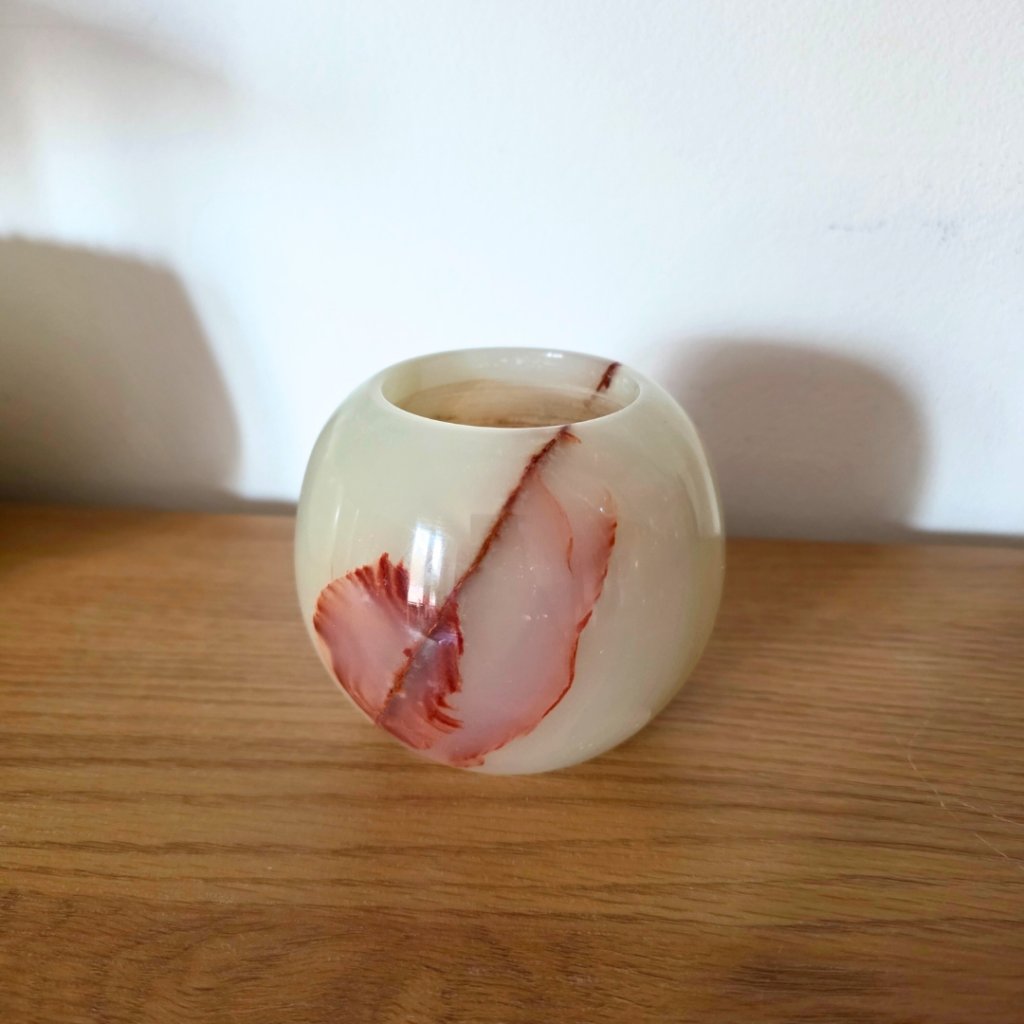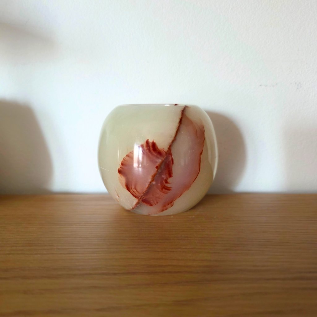 Svícen je vyroben z přírodního aragonitu, známého také jako pákistánský onyx. Tento kámen vyniká pevností, jemným leskem a přirozenou kresbou, která vznikala po tisíce let. Kupujete přesně ten svícen, který vidíte na fotografiích, žádný náhodný výběr, ale konkrétní originální kus.