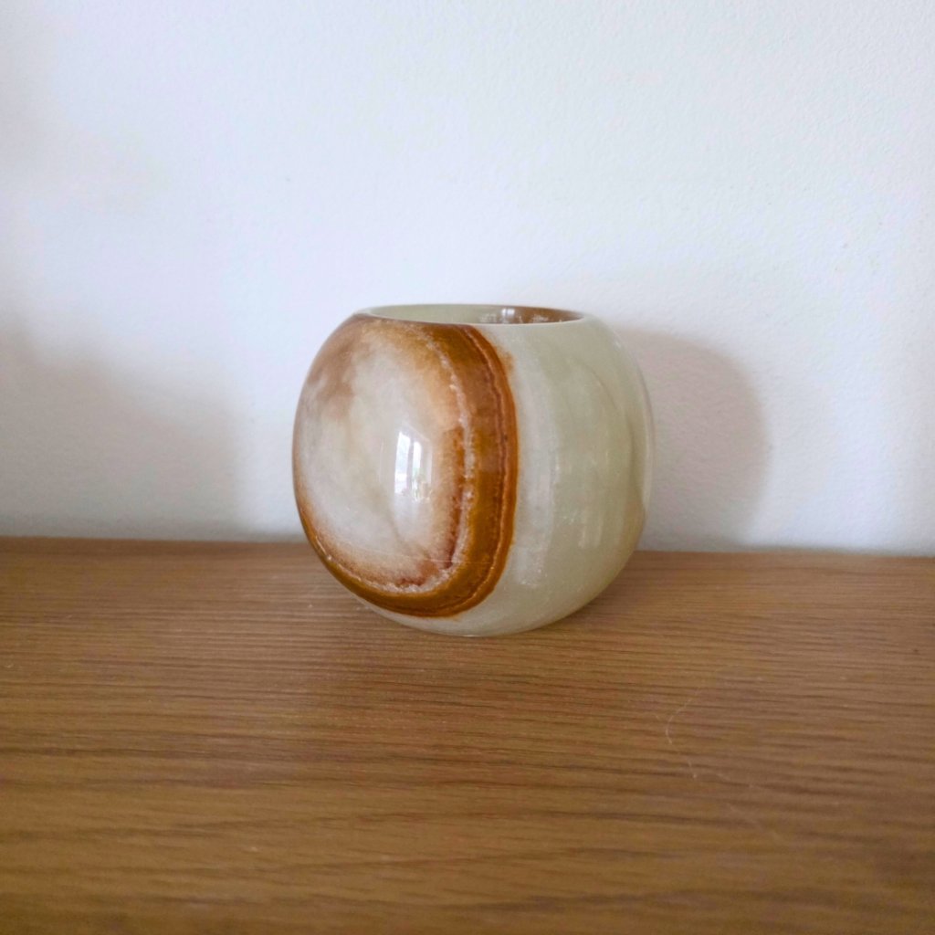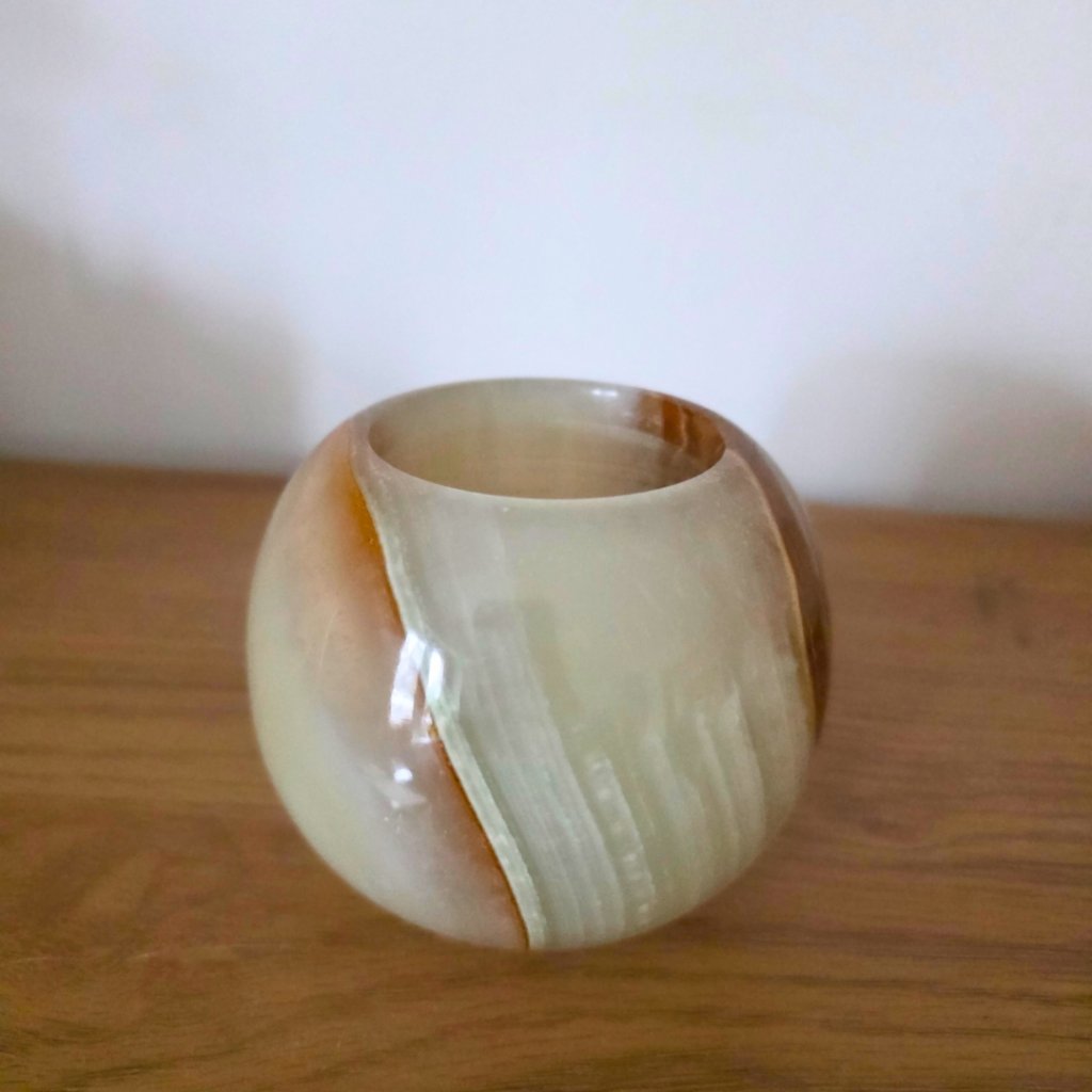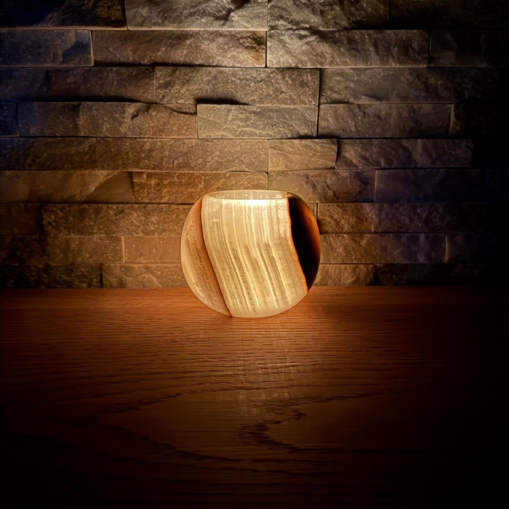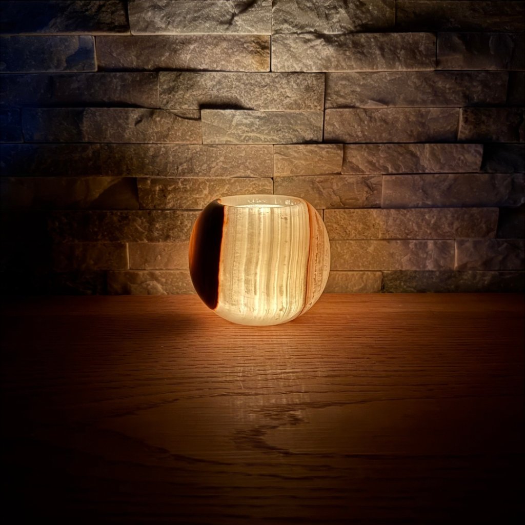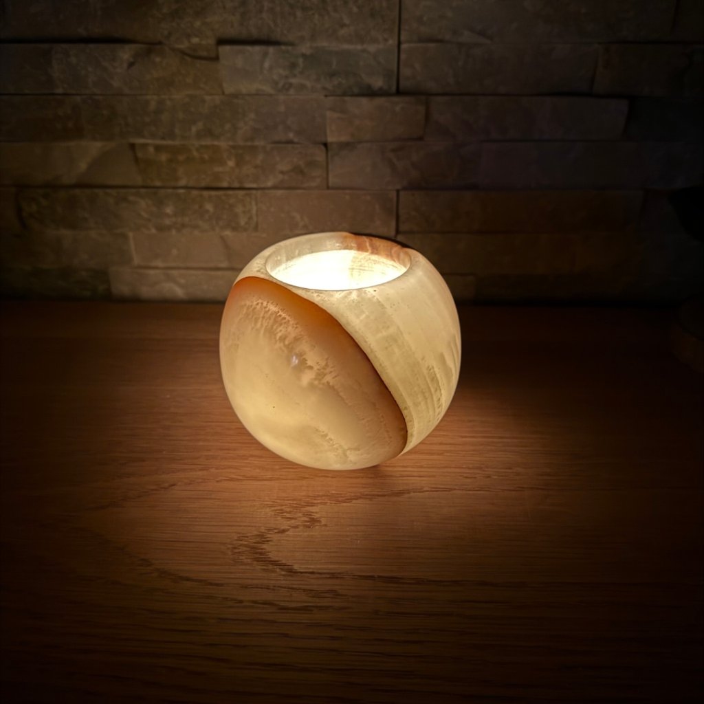 Svícen je vyroben z přírodního aragonitu, známého také jako pákistánský onyx. Tento kámen vyniká pevností, jemným leskem a přirozenou kresbou, která vznikala po tisíce let. Kupujete přesně ten svícen, který vidíte na fotografiích, žádný náhodný výběr, ale konkrétní originální kus.