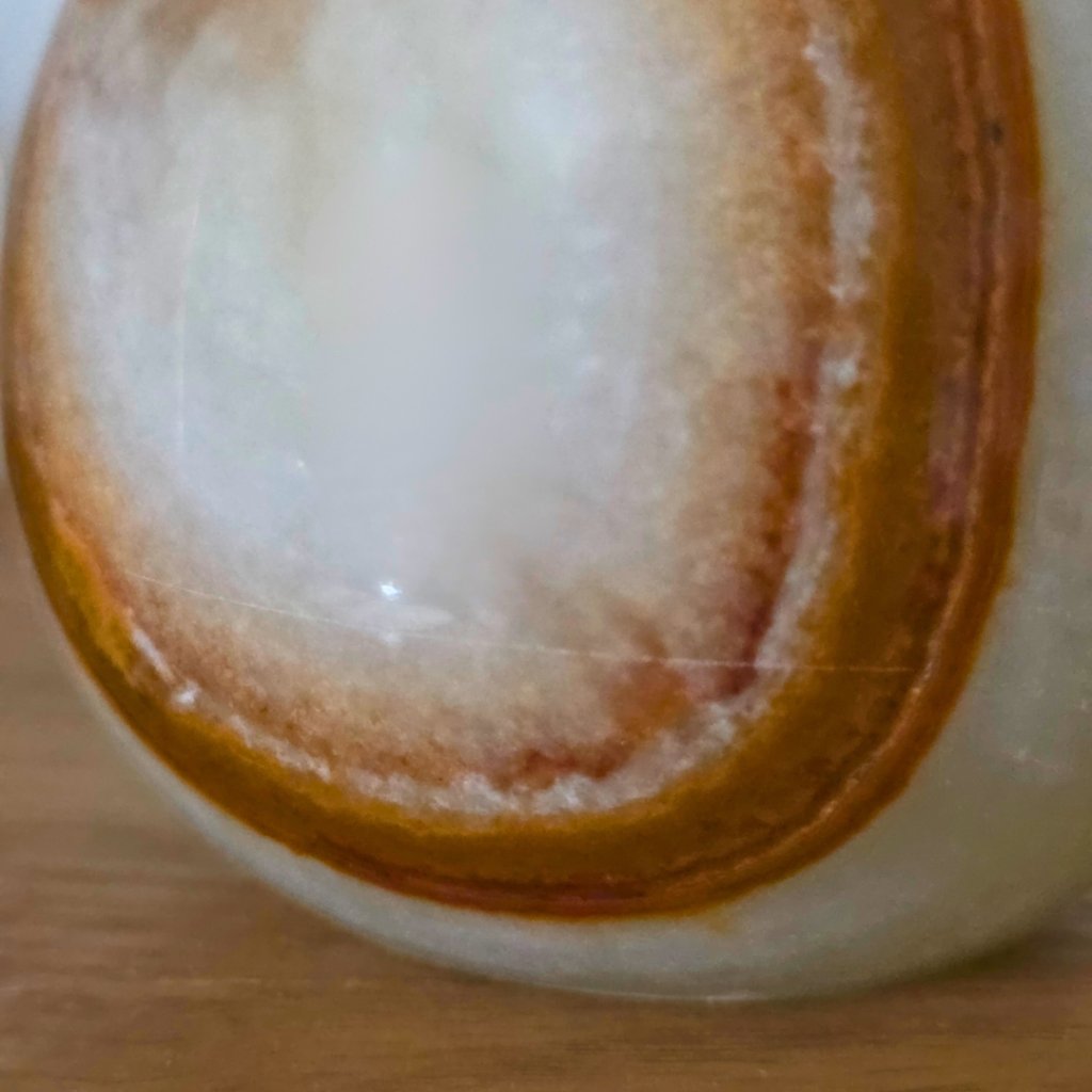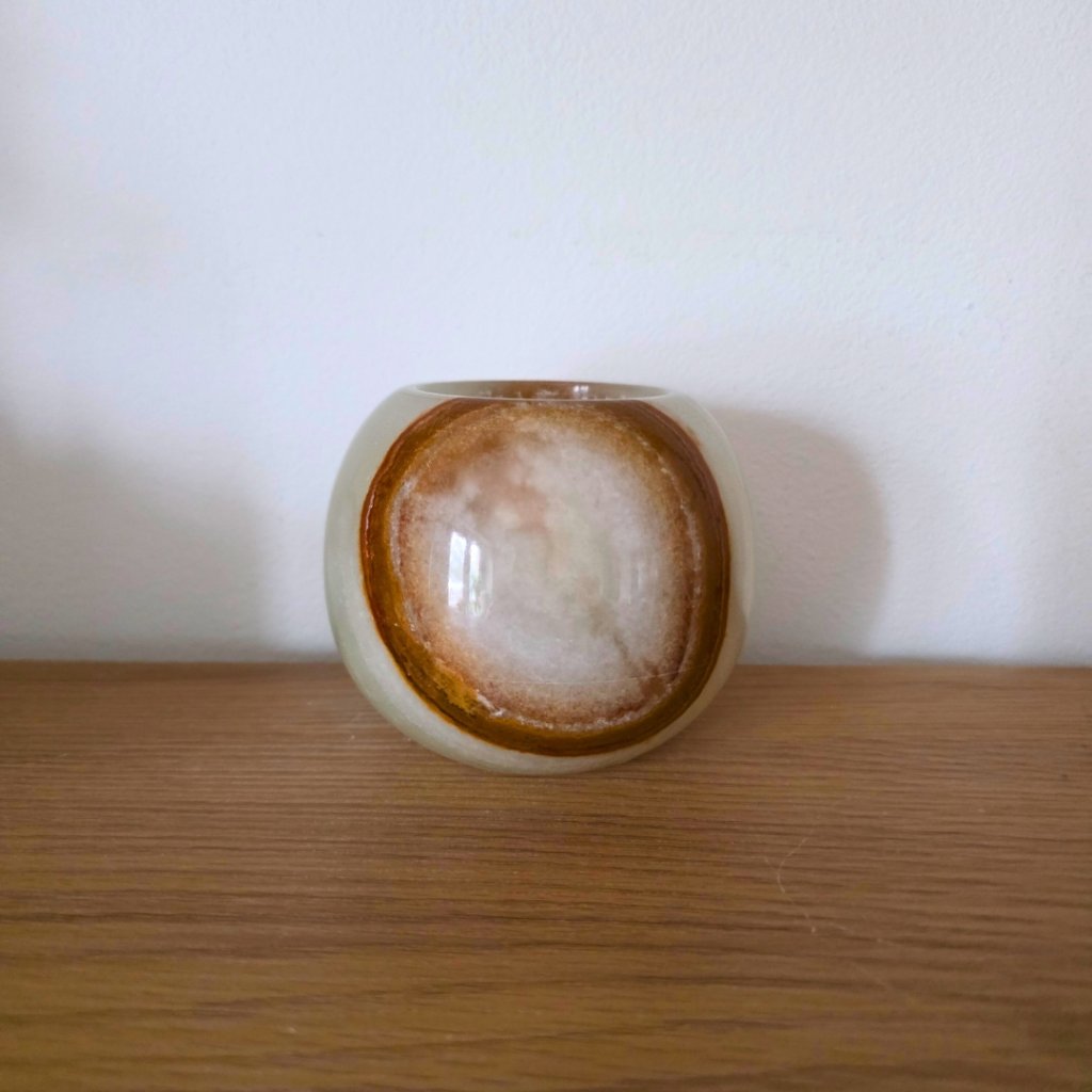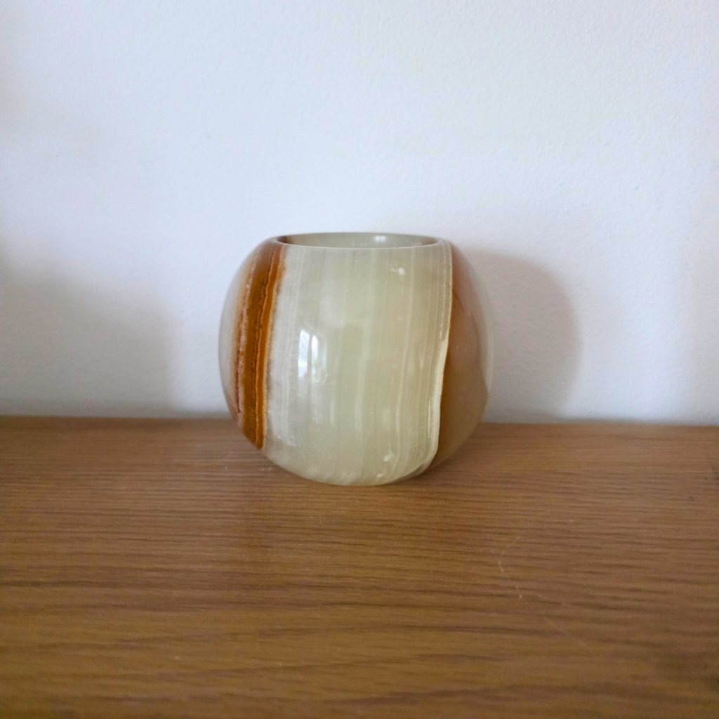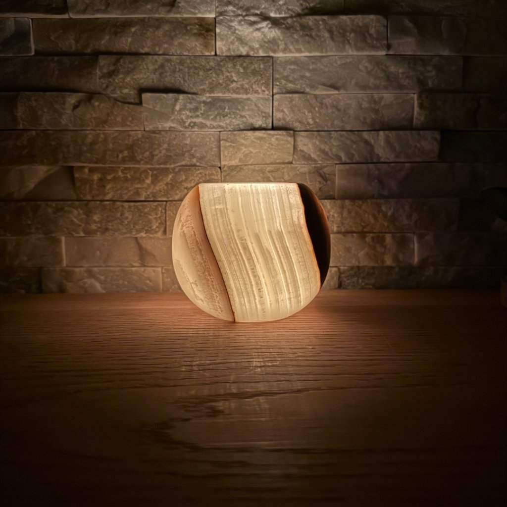 Svícen je vyroben z přírodního aragonitu, známého také jako pákistánský onyx. Tento kámen vyniká pevností, jemným leskem a přirozenou kresbou, která vznikala po tisíce let. Kupujete přesně ten svícen, který vidíte na fotografiích, žádný náhodný výběr, ale konkrétní originální kus.