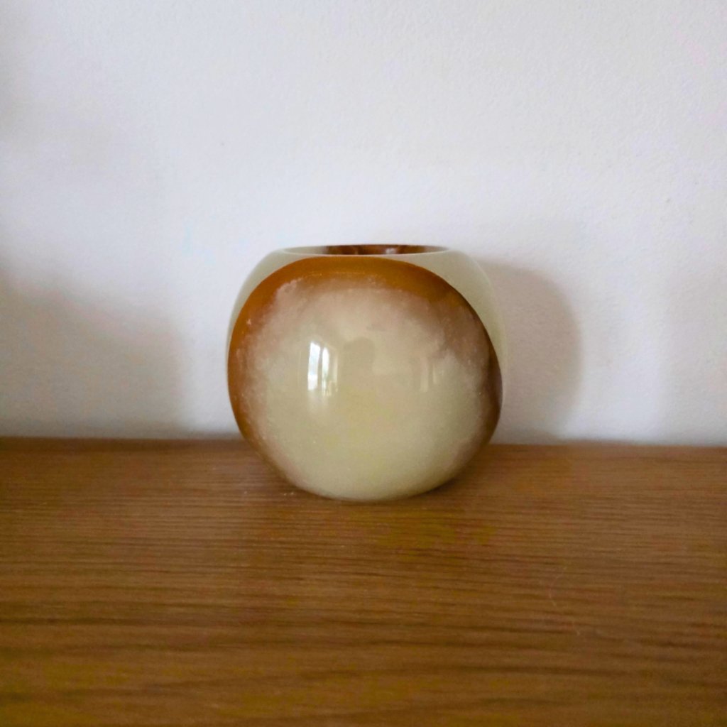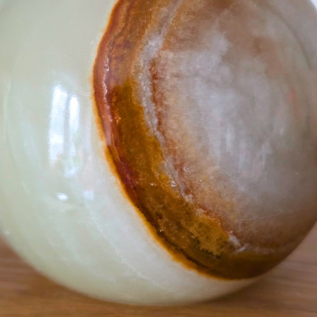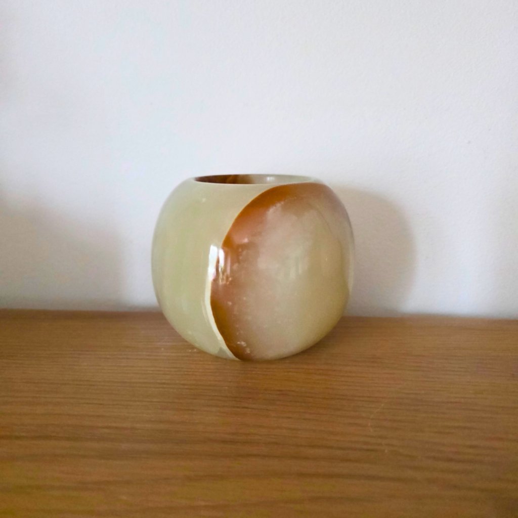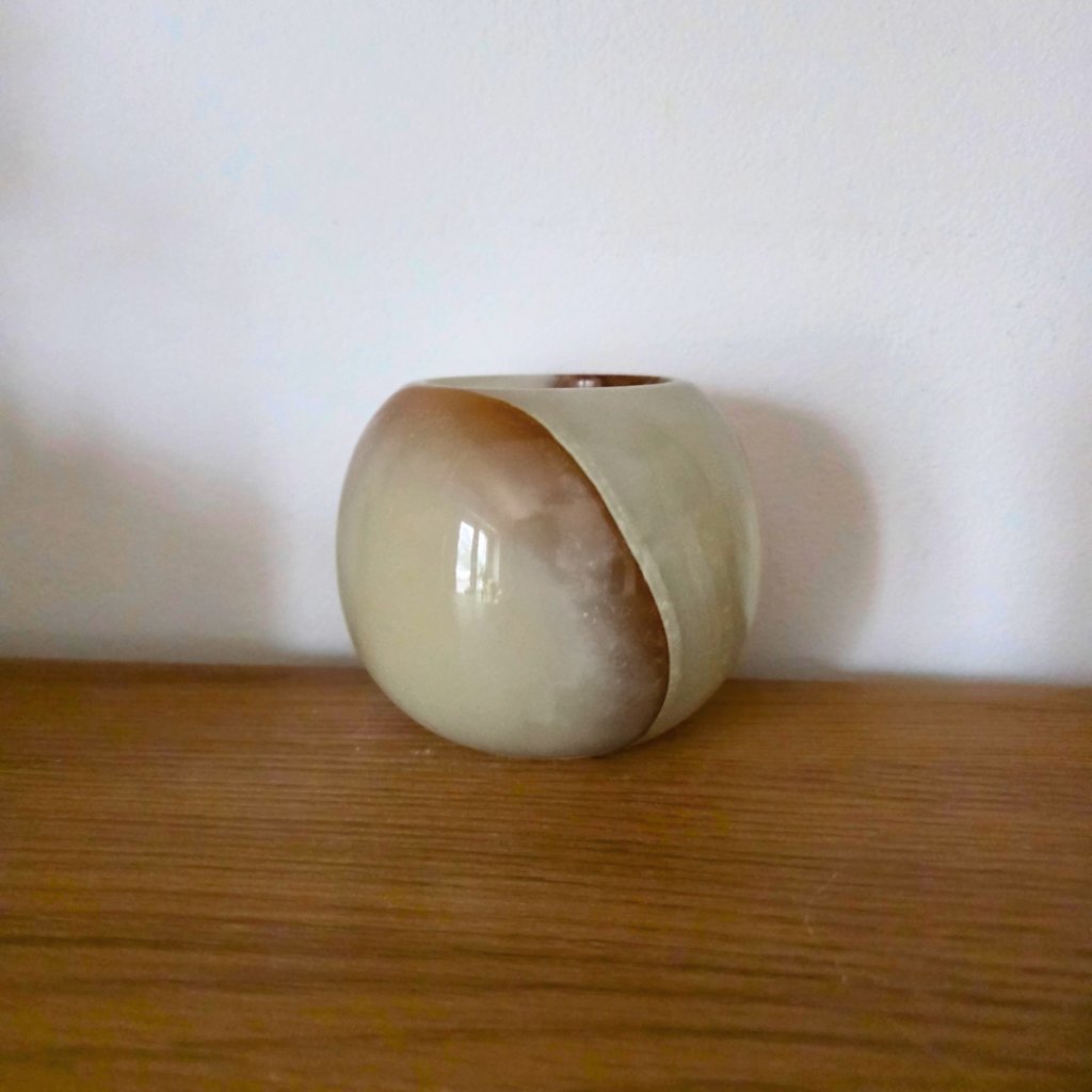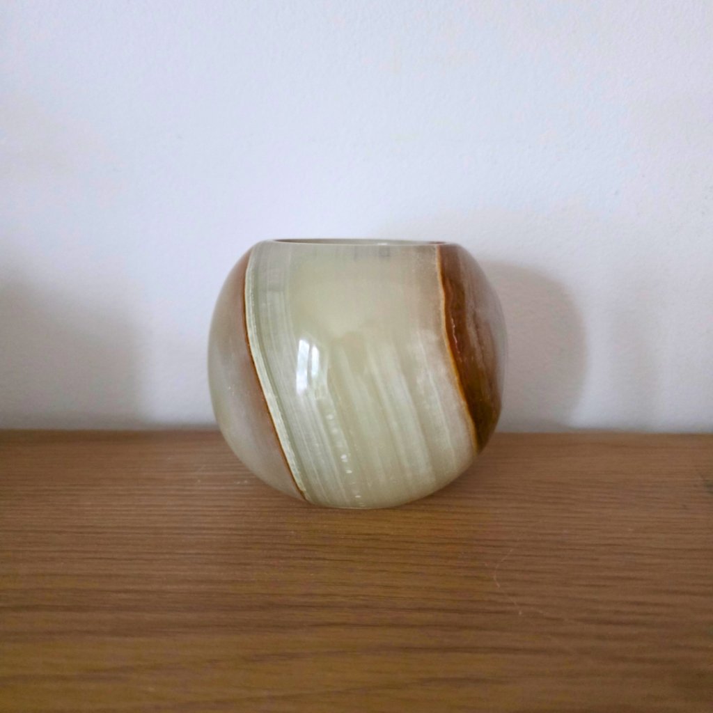 Svícen je vyroben z přírodního aragonitu, známého také jako pákistánský onyx. Tento kámen vyniká pevností, jemným leskem a přirozenou kresbou, která vznikala po tisíce let. Kupujete přesně ten svícen, který vidíte na fotografiích, žádný náhodný výběr, ale konkrétní originální kus.