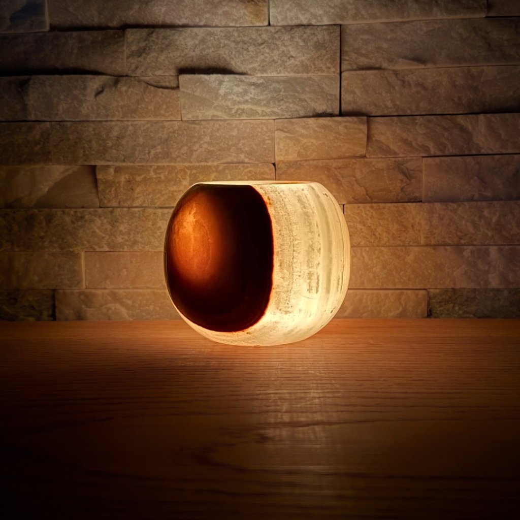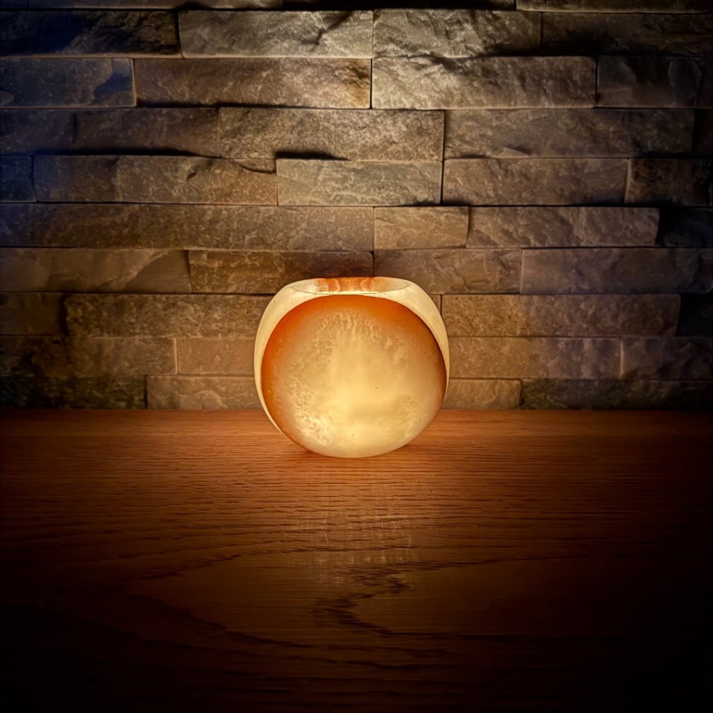 Každý svícen z aragonitu je jedinečný svým vzhledem. Tento konkrétní kus má přesně takovou strukturu, žilkování a barevnost, jakou vidíte na fotkách. Doporučujeme si fotogalerii projít opravdu pečlivě, abyste věděli, jaký svícen si domů vybíráte. Po zapálení čajové svíčky začne světlo jemně prosvítat kamenem a zvýrazní jeho přirozenou kresbu.