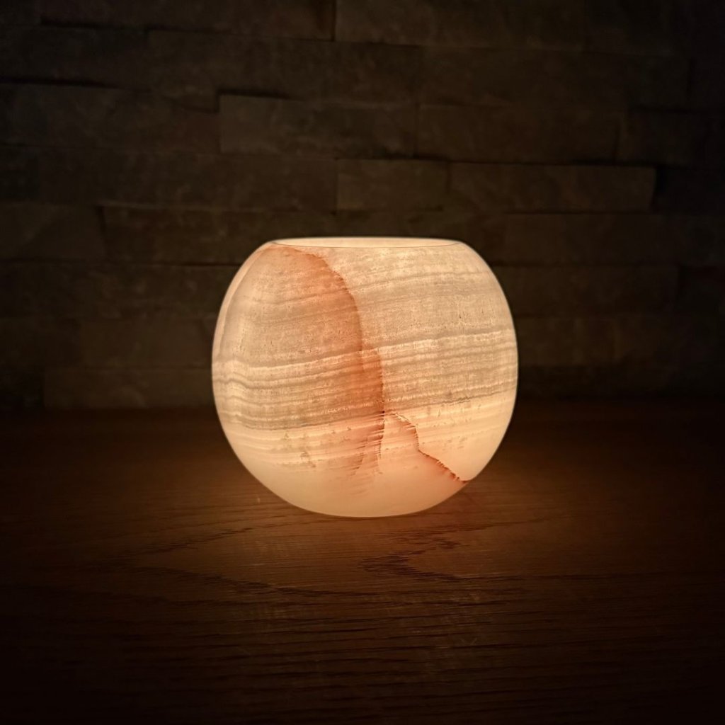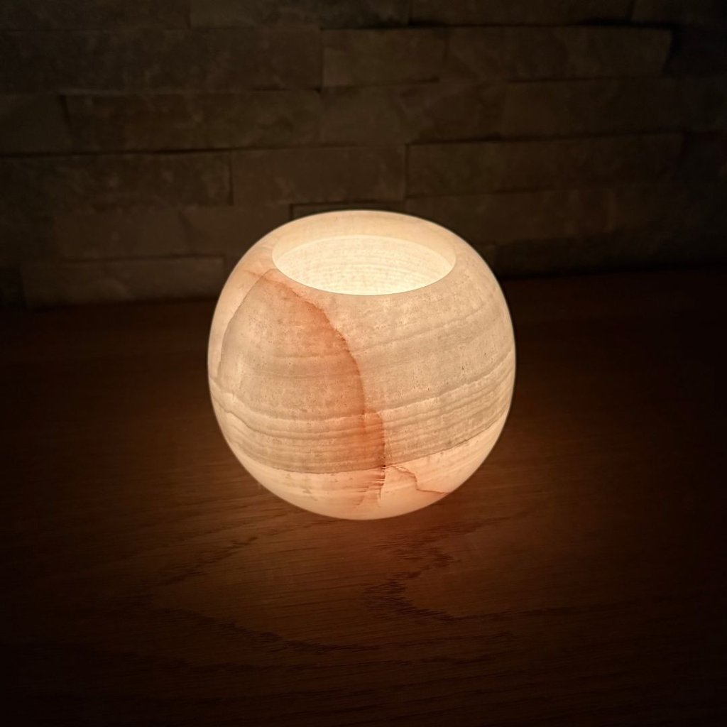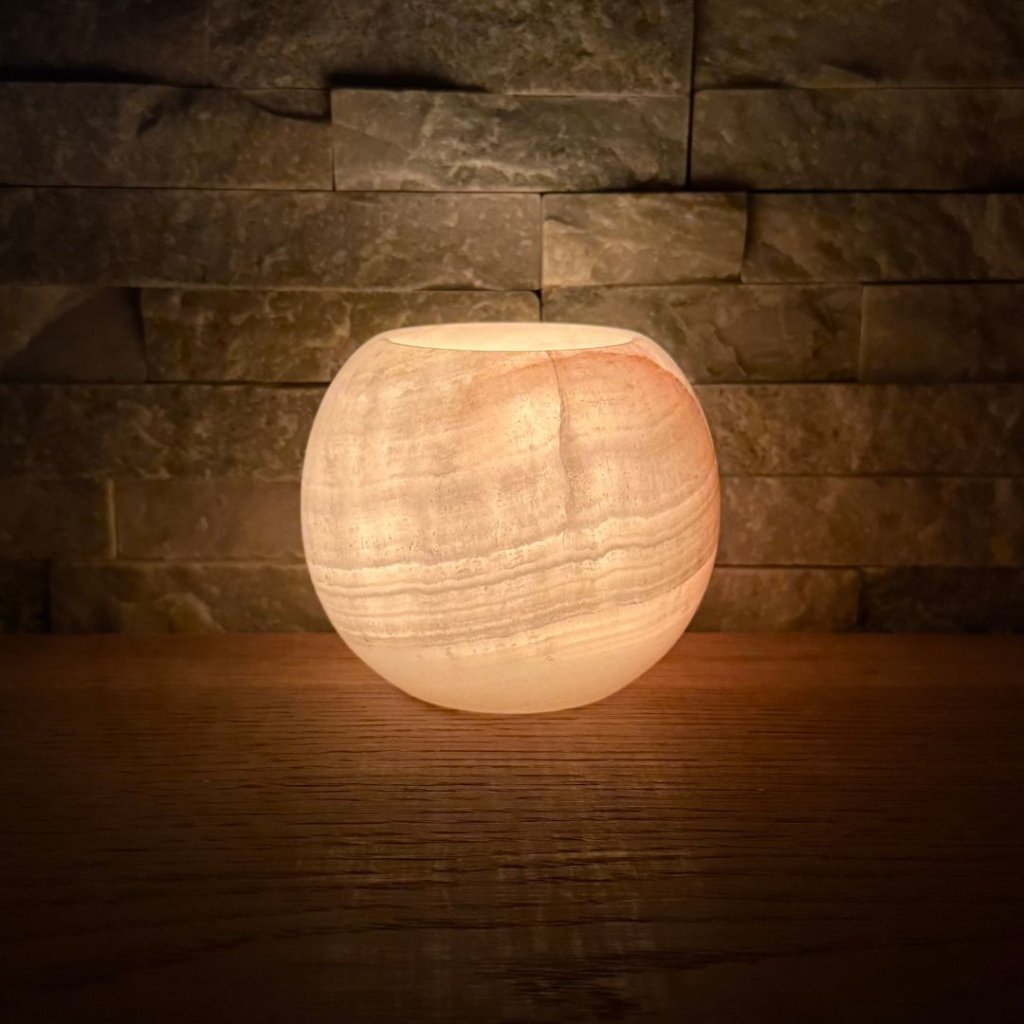 Svícen je vyroben z přírodního aragonitu, známého také jako pákistánský onyx. Tento kámen vyniká pevností, jemným leskem a přirozenou kresbou, která vznikala po tisíce let. Kupujete přesně ten svícen, který vidíte na fotografiích, žádný náhodný výběr, ale konkrétní originální kus.