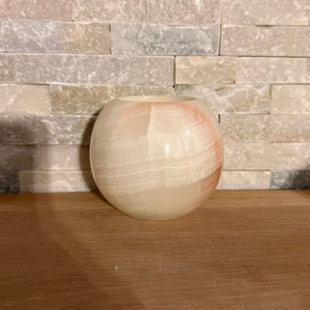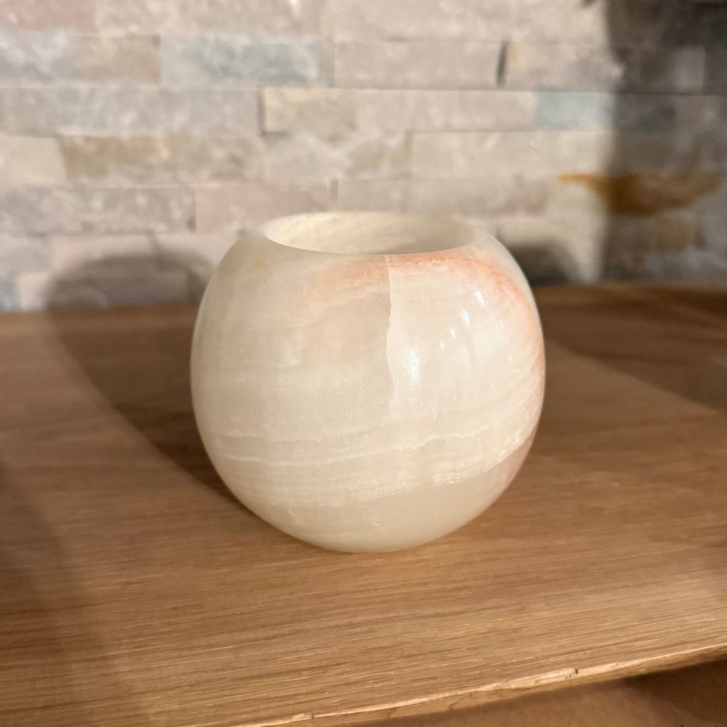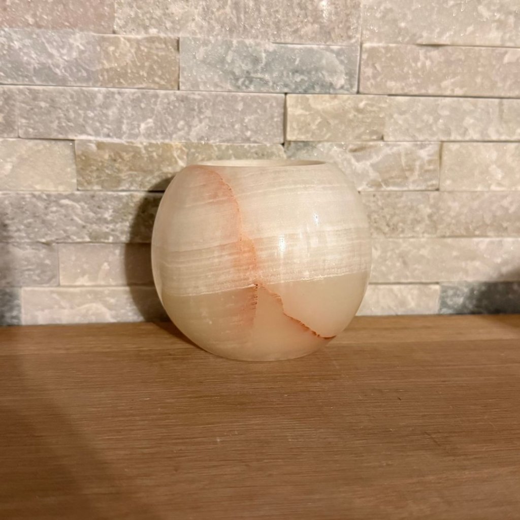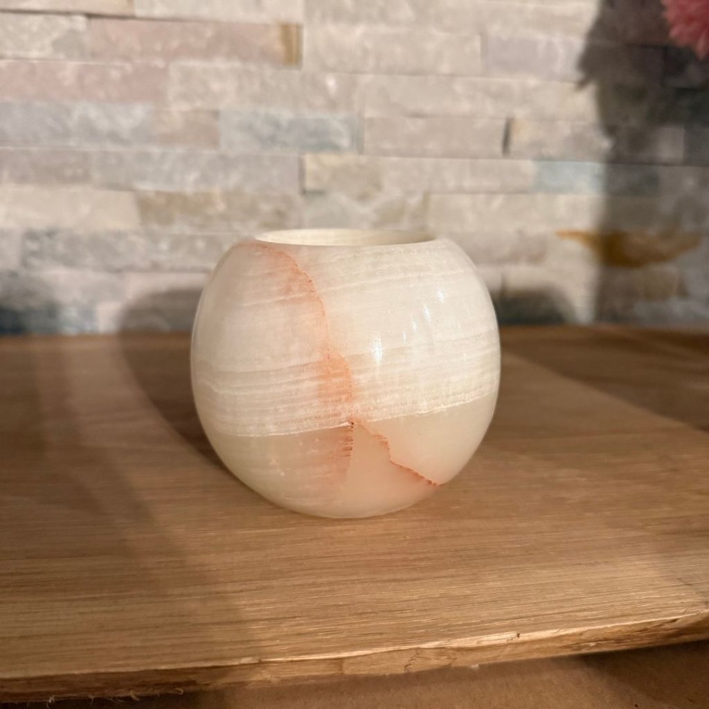 Svícen je vyroben z přírodního aragonitu, známého také jako pákistánský onyx. Tento kámen vyniká pevností, jemným leskem a přirozenou kresbou, která vznikala po tisíce let. Kupujete přesně ten svícen, který vidíte na fotografiích, žádný náhodný výběr, ale konkrétní originální kus.