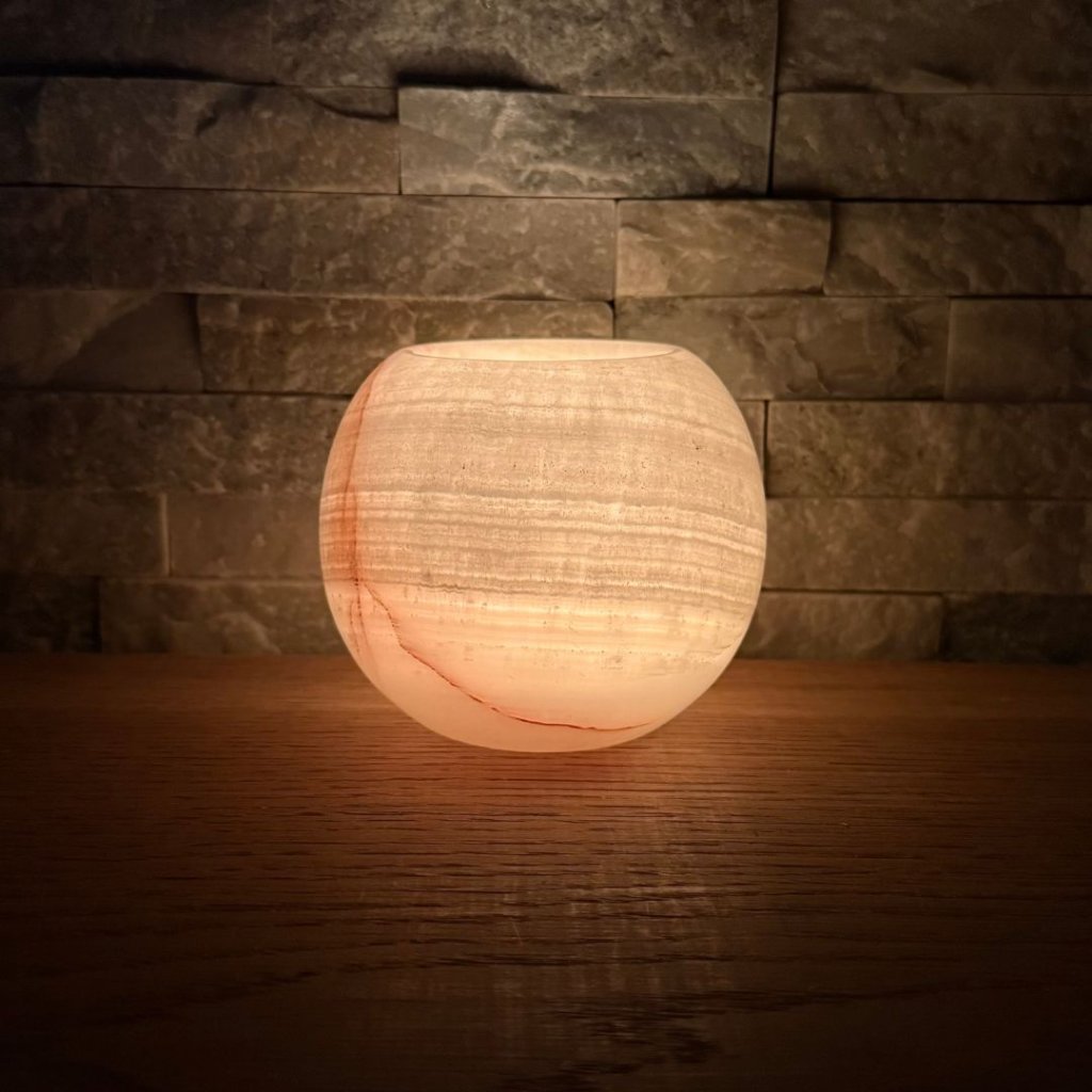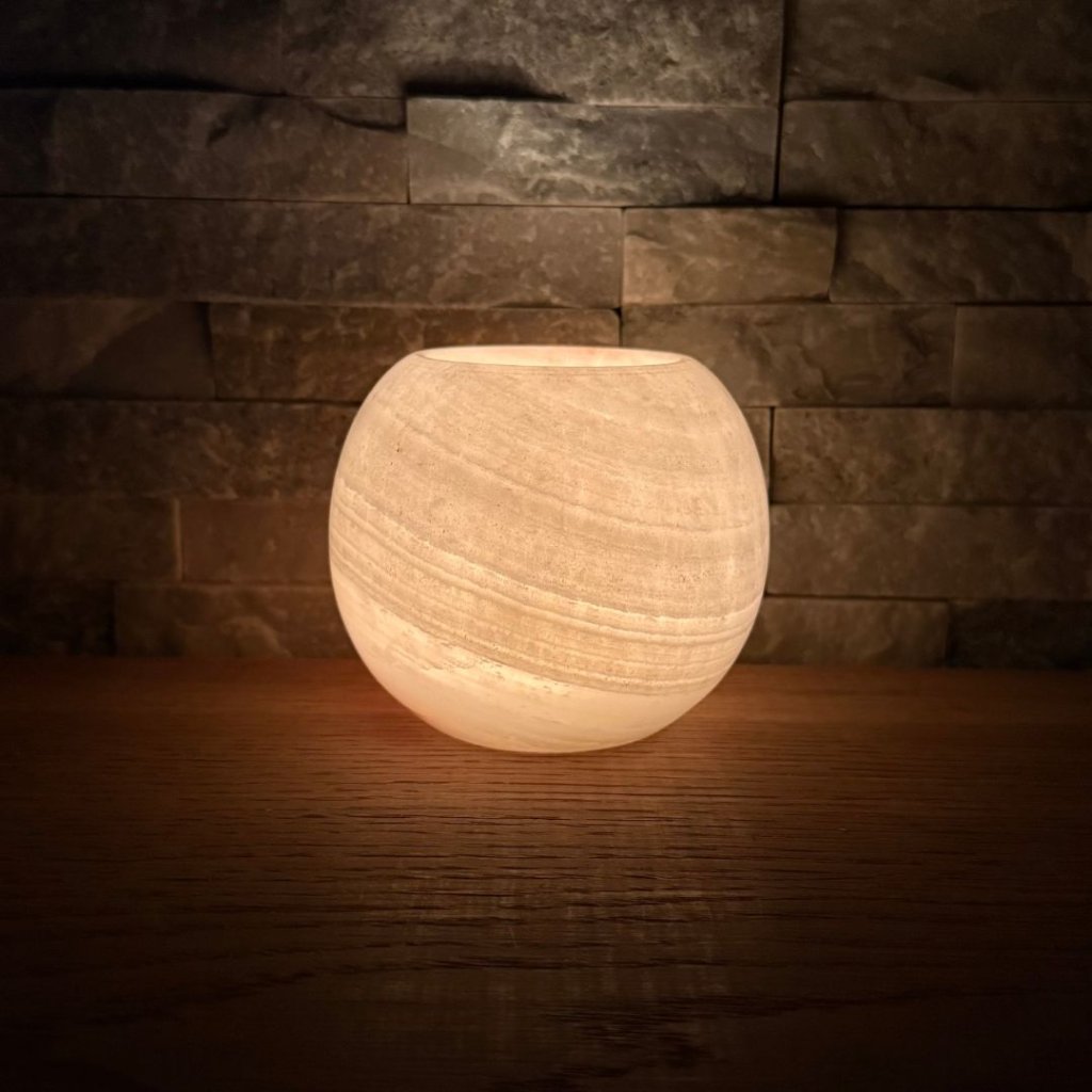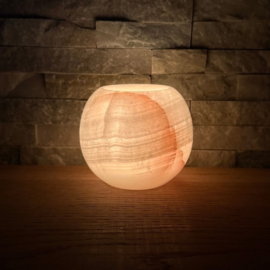 Každý svícen z aragonitu je jedinečný svým vzhledem. Tento konkrétní kus má přesně takovou strukturu, žilkování a barevnost, jakou vidíte na fotkách. Doporučujeme si fotogalerii projít opravdu pečlivě, abyste věděli, jaký svícen si domů vybíráte. Po zapálení čajové svíčky začne světlo jemně prosvítat kamenem a zvýrazní jeho přirozenou kresbu.