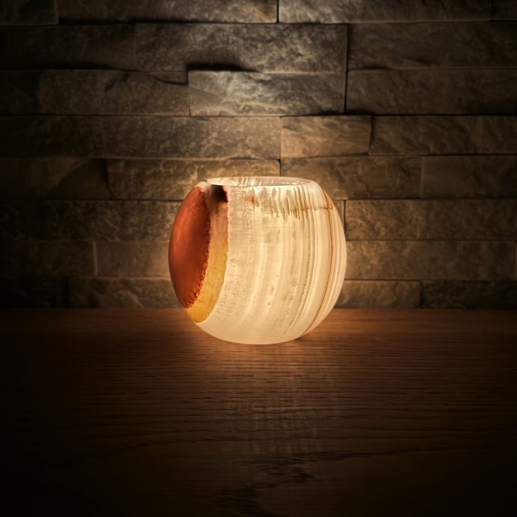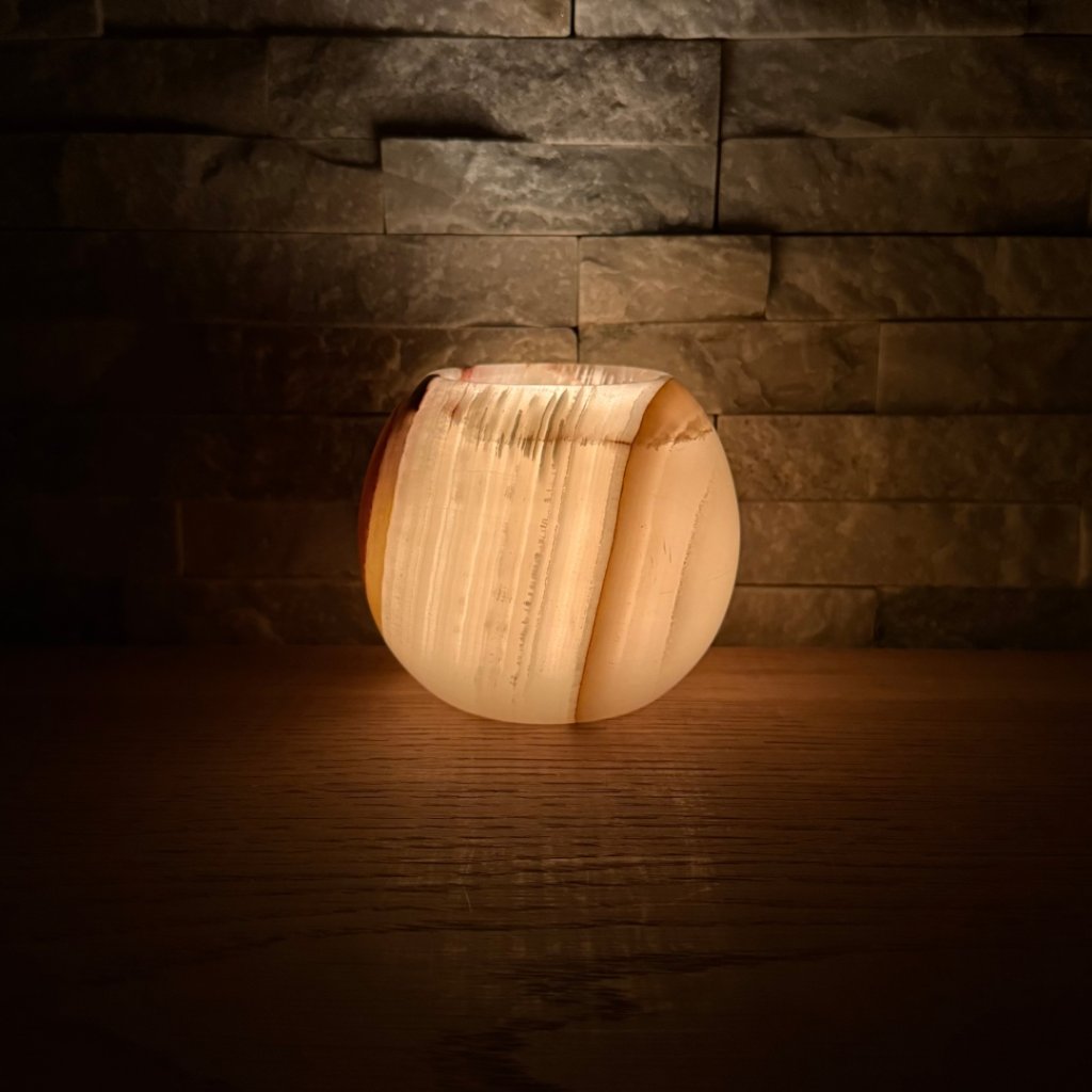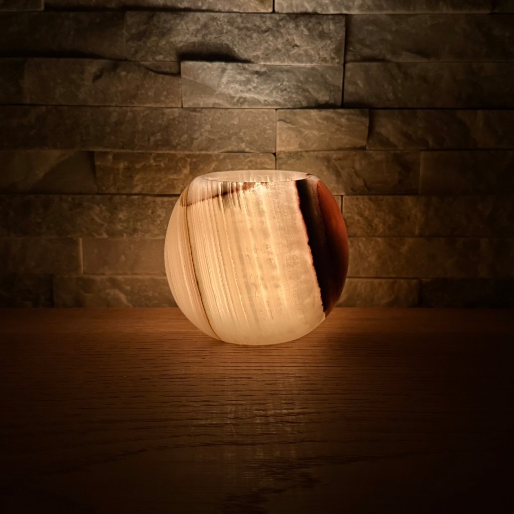 Svícen je vyroben z přírodního aragonitu, známého také jako pákistánský onyx. Tento kámen vyniká pevností, jemným leskem a přirozenou kresbou, která vznikala po tisíce let. Kupujete přesně ten svícen, který vidíte na fotografiích, žádný náhodný výběr, ale konkrétní originální kus.