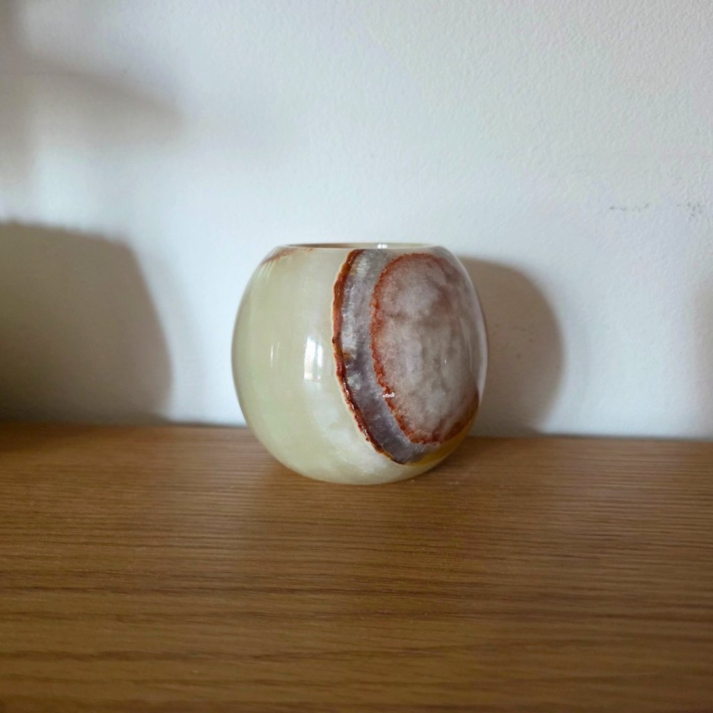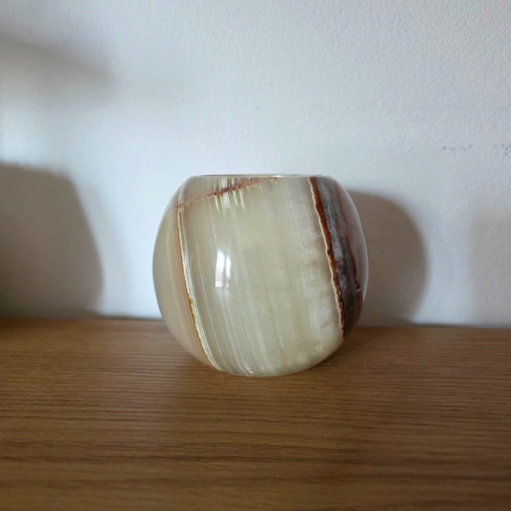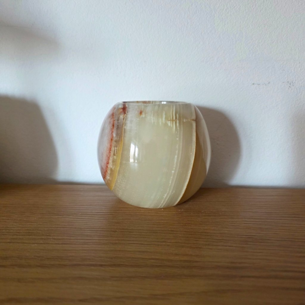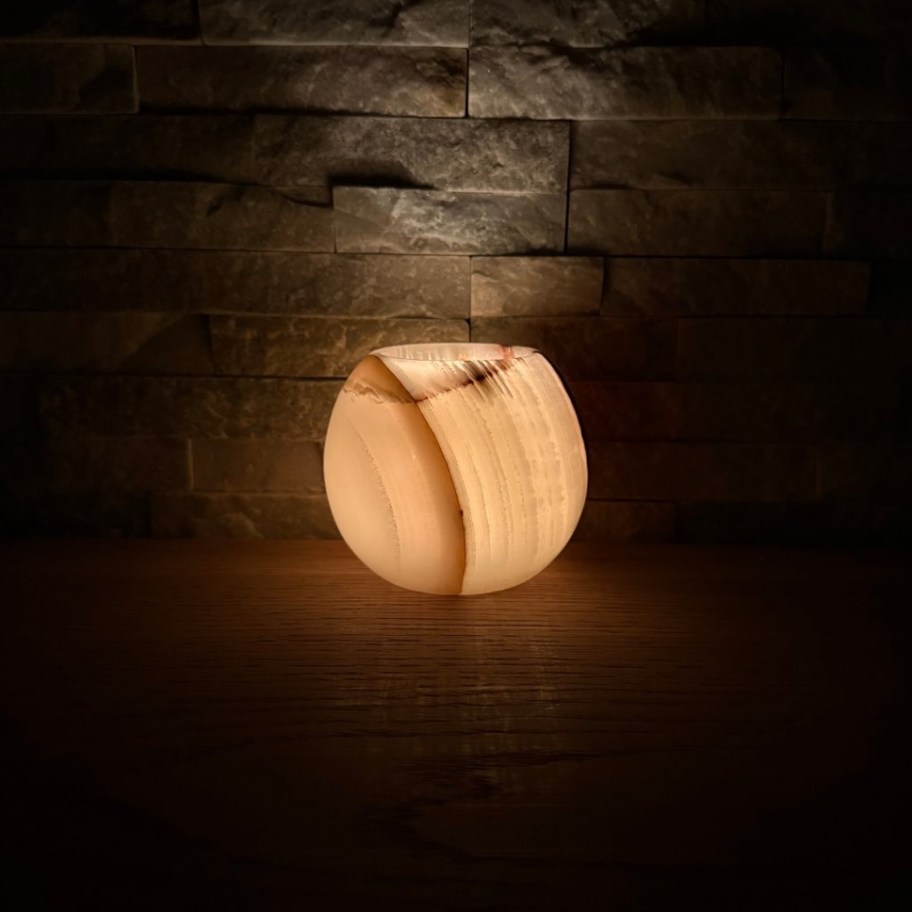 Svícen je vyroben z přírodního aragonitu, známého také jako pákistánský onyx. Tento kámen vyniká pevností, jemným leskem a přirozenou kresbou, která vznikala po tisíce let. Kupujete přesně ten svícen, který vidíte na fotografiích, žádný náhodný výběr, ale konkrétní originální kus.
