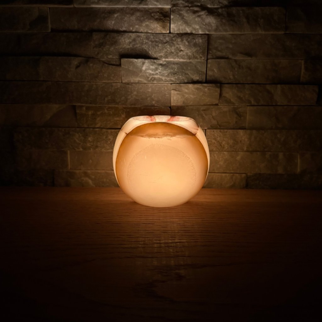 Každý svícen z aragonitu je jedinečný svým vzhledem. Tento konkrétní kus má přesně takovou strukturu, žilkování a barevnost, jakou vidíte na fotkách. Doporučujeme si fotogalerii projít opravdu pečlivě, abyste věděli, jaký svícen si domů vybíráte. Po zapálení čajové svíčky začne světlo jemně prosvítat kamenem a zvýrazní jeho přirozenou kresbu.