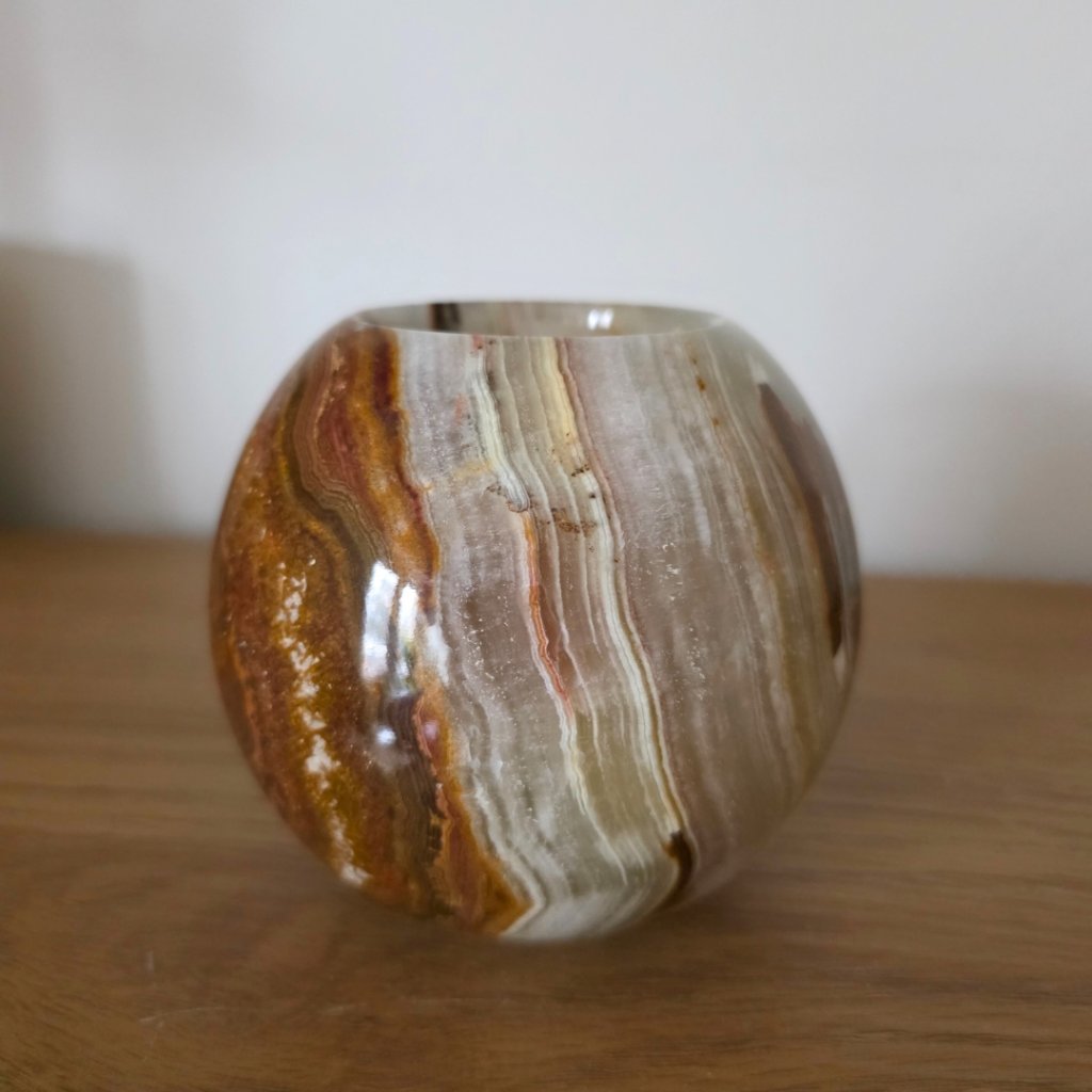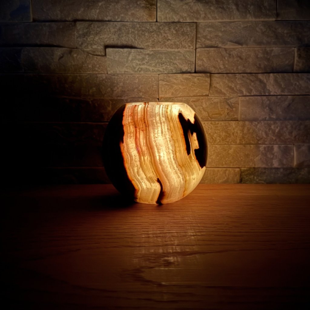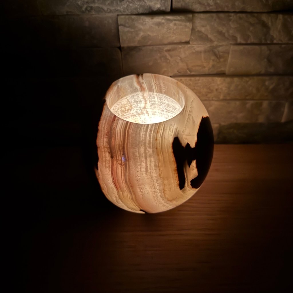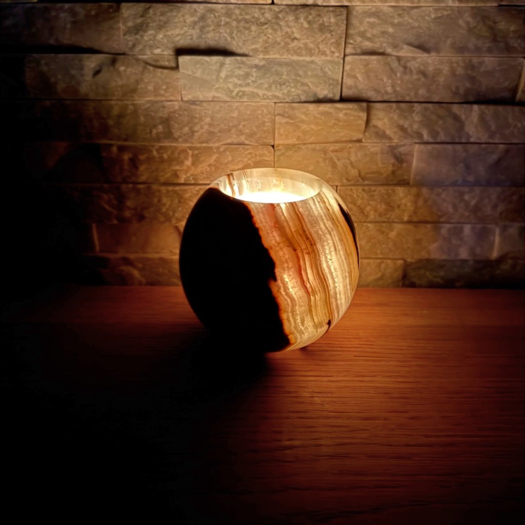 Svícen je vyroben z přírodního aragonitu, známého také jako pákistánský onyx. Tento kámen vyniká pevností, jemným leskem a přirozenou kresbou, která vznikala po tisíce let. Kupujete přesně ten svícen, který vidíte na fotografiích, žádný náhodný výběr, ale konkrétní originální kus.
