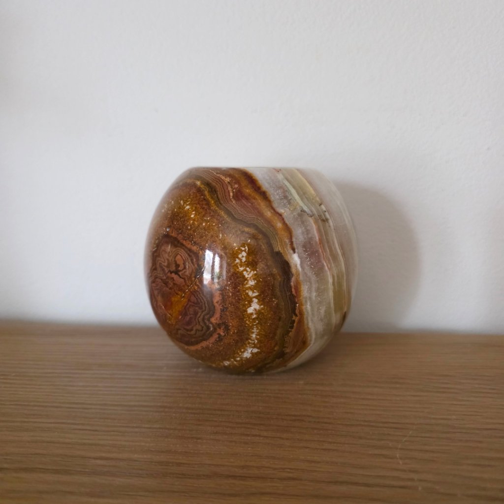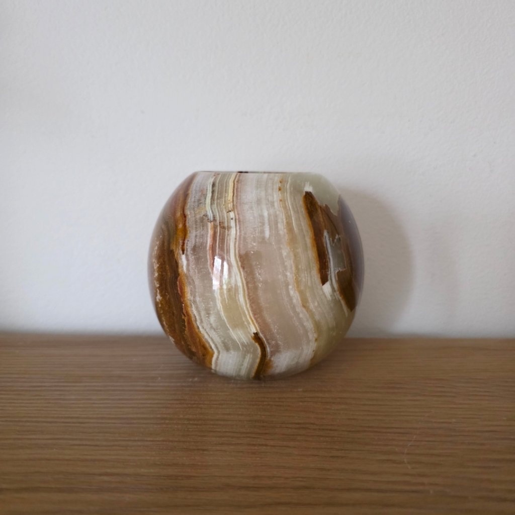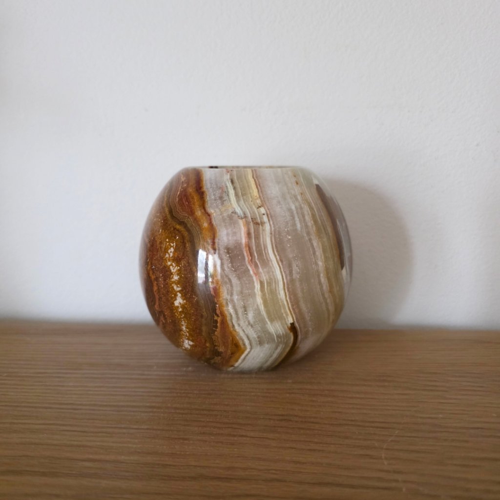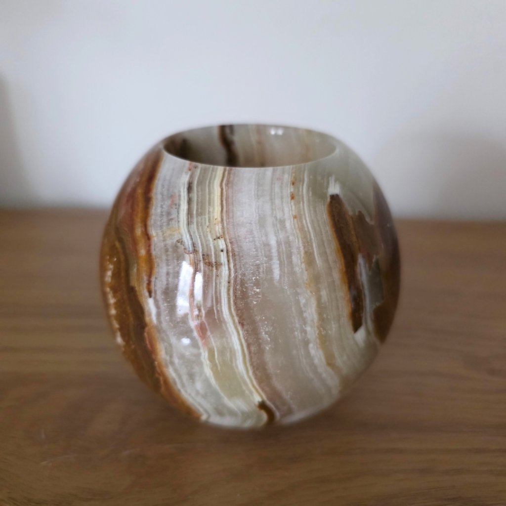 Svícen je vyroben z přírodního aragonitu, známého také jako pákistánský onyx. Tento kámen vyniká pevností, jemným leskem a přirozenou kresbou, která vznikala po tisíce let. Kupujete přesně ten svícen, který vidíte na fotografiích, žádný náhodný výběr, ale konkrétní originální kus.