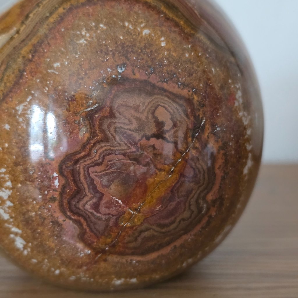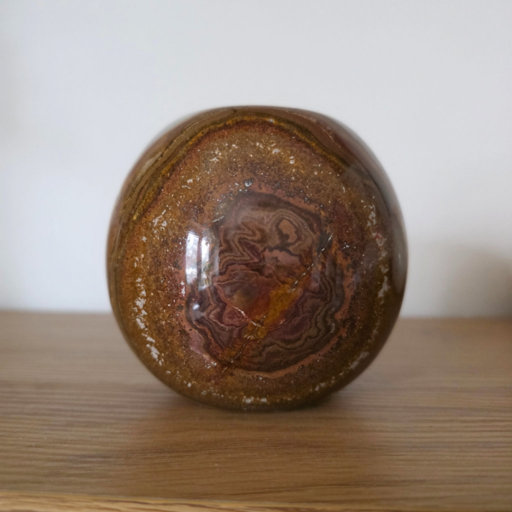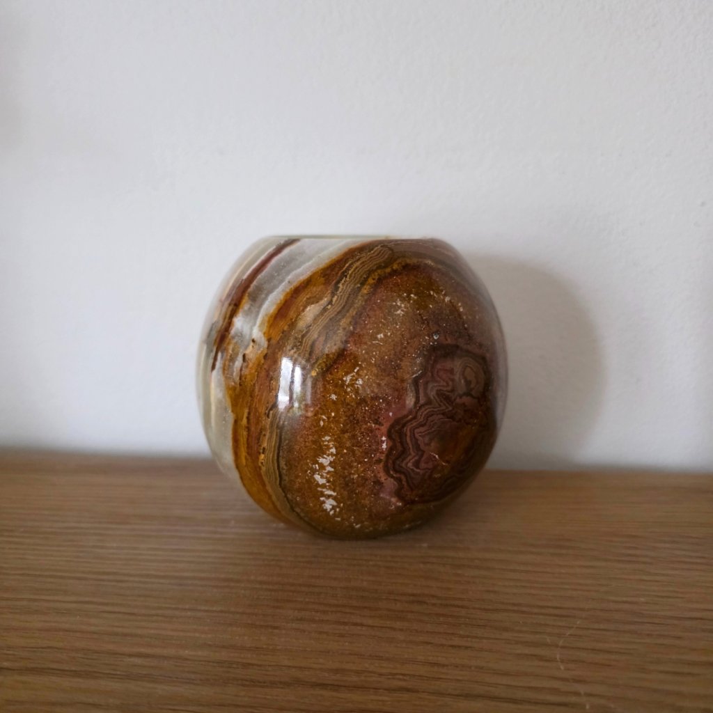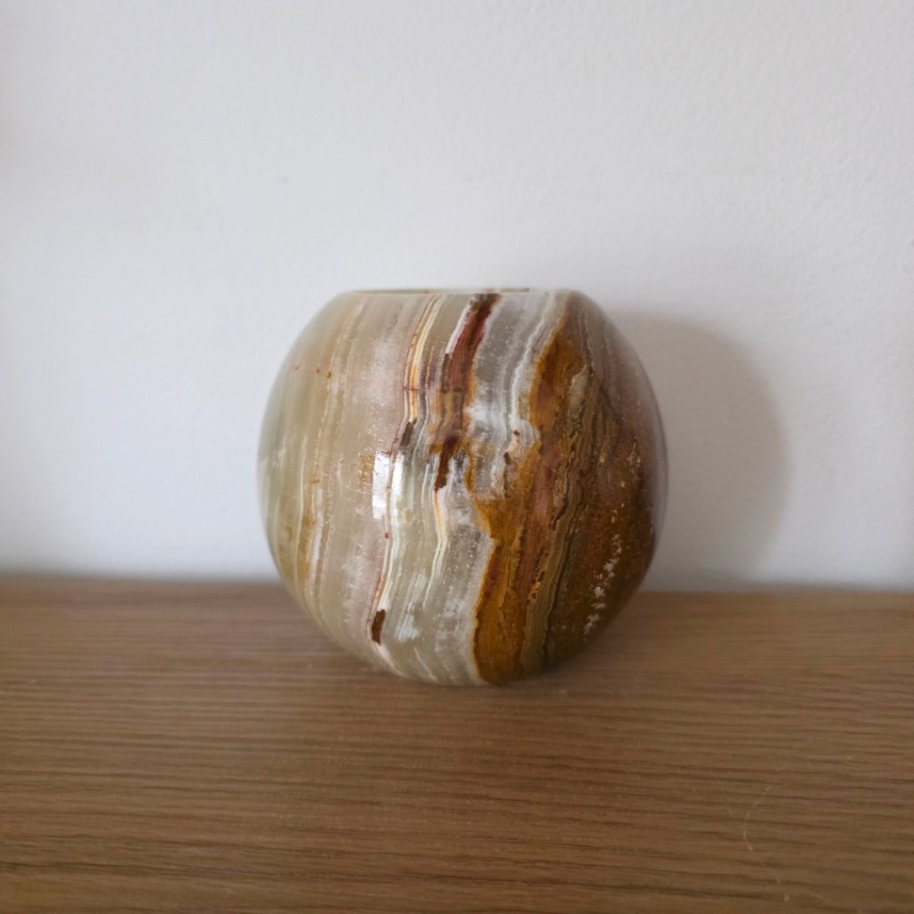Svícen je vyroben z přírodního aragonitu, známého také jako pákistánský onyx. Tento kámen vyniká pevností, jemným leskem a přirozenou kresbou, která vznikala po tisíce let. Kupujete přesně ten svícen, který vidíte na fotografiích, žádný náhodný výběr, ale konkrétní originální kus.