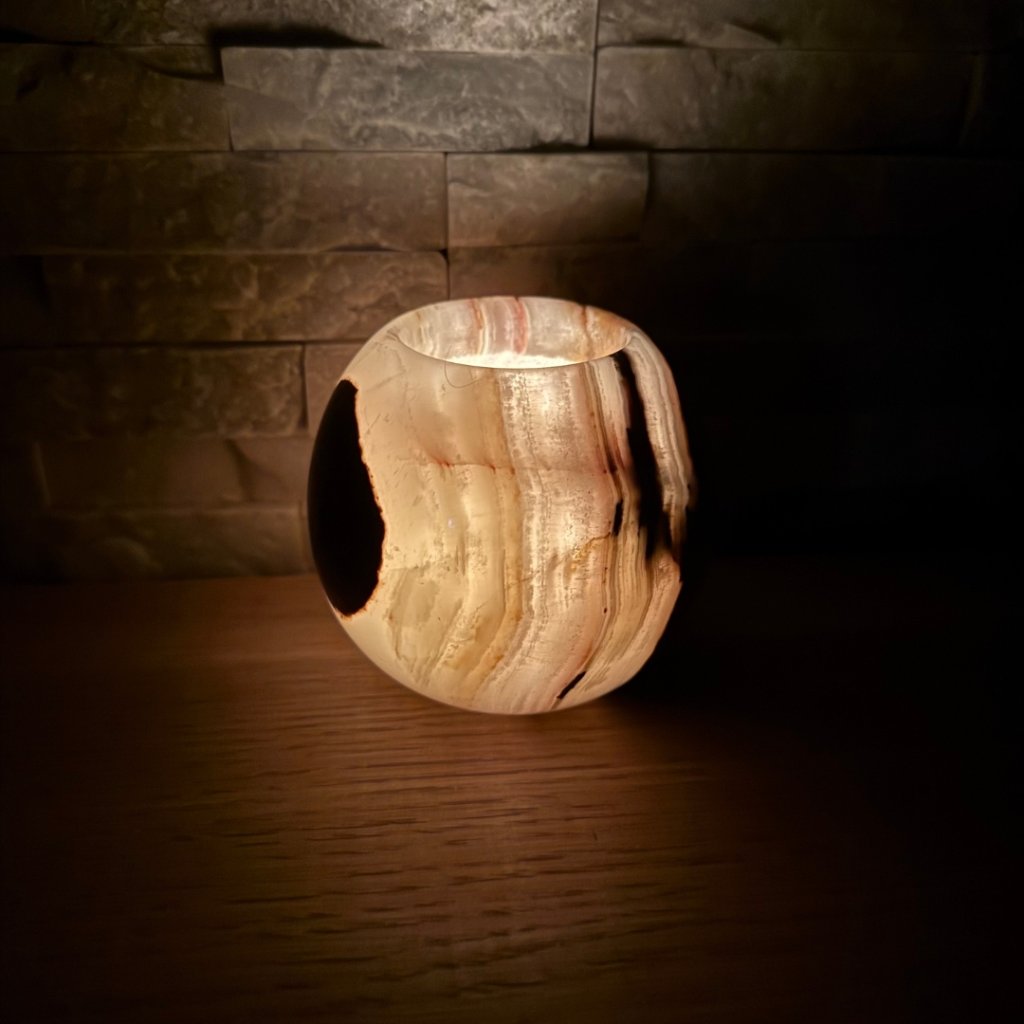 Každý svícen z aragonitu je jedinečný svým vzhledem. Tento konkrétní kus má přesně takovou strukturu, žilkování a barevnost, jakou vidíte na fotkách. Doporučujeme si fotogalerii projít opravdu pečlivě, abyste věděli, jaký svícen si domů vybíráte. Po zapálení čajové svíčky začne světlo jemně prosvítat kamenem a zvýrazní jeho přirozenou kresbu.