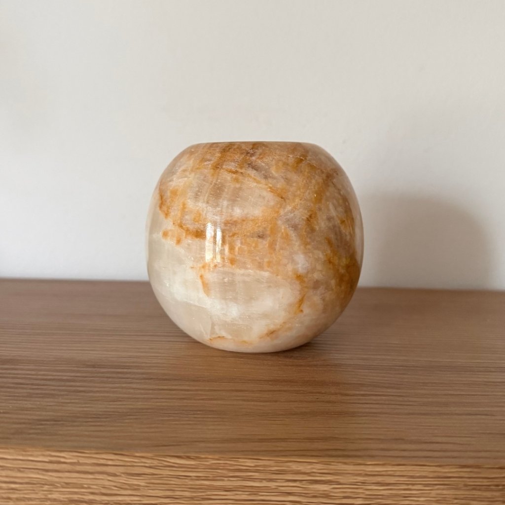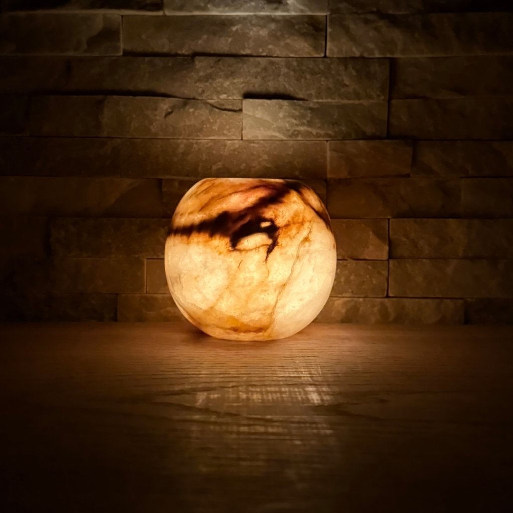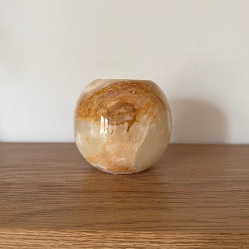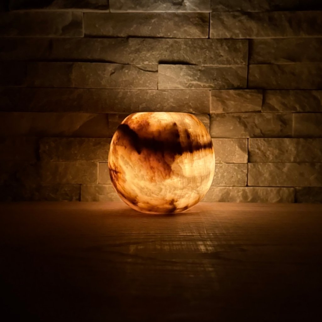 Svícen je vyroben z přírodního aragonitu, známého také jako pákistánský onyx. Tento kámen vyniká pevností, jemným leskem a přirozenou kresbou, která vznikala po tisíce let. Kupujete přesně ten svícen, který vidíte na fotografiích, žádný náhodný výběr, ale konkrétní originální kus.
