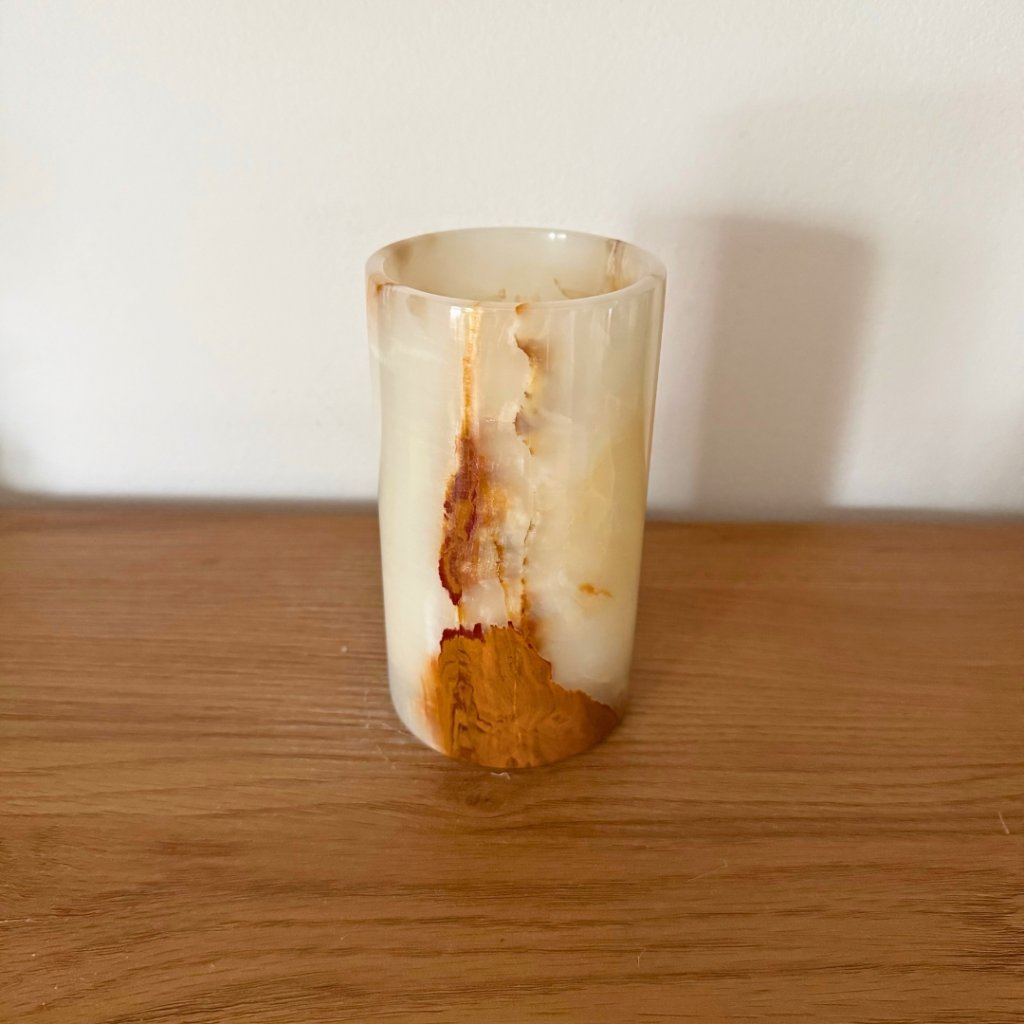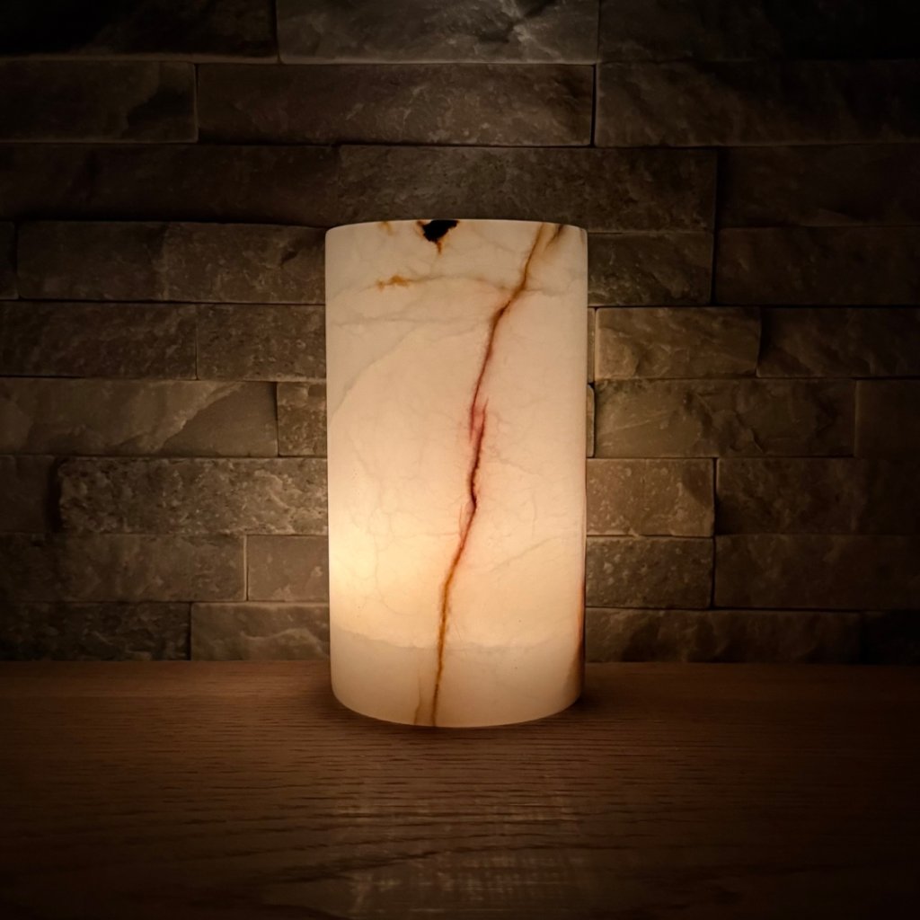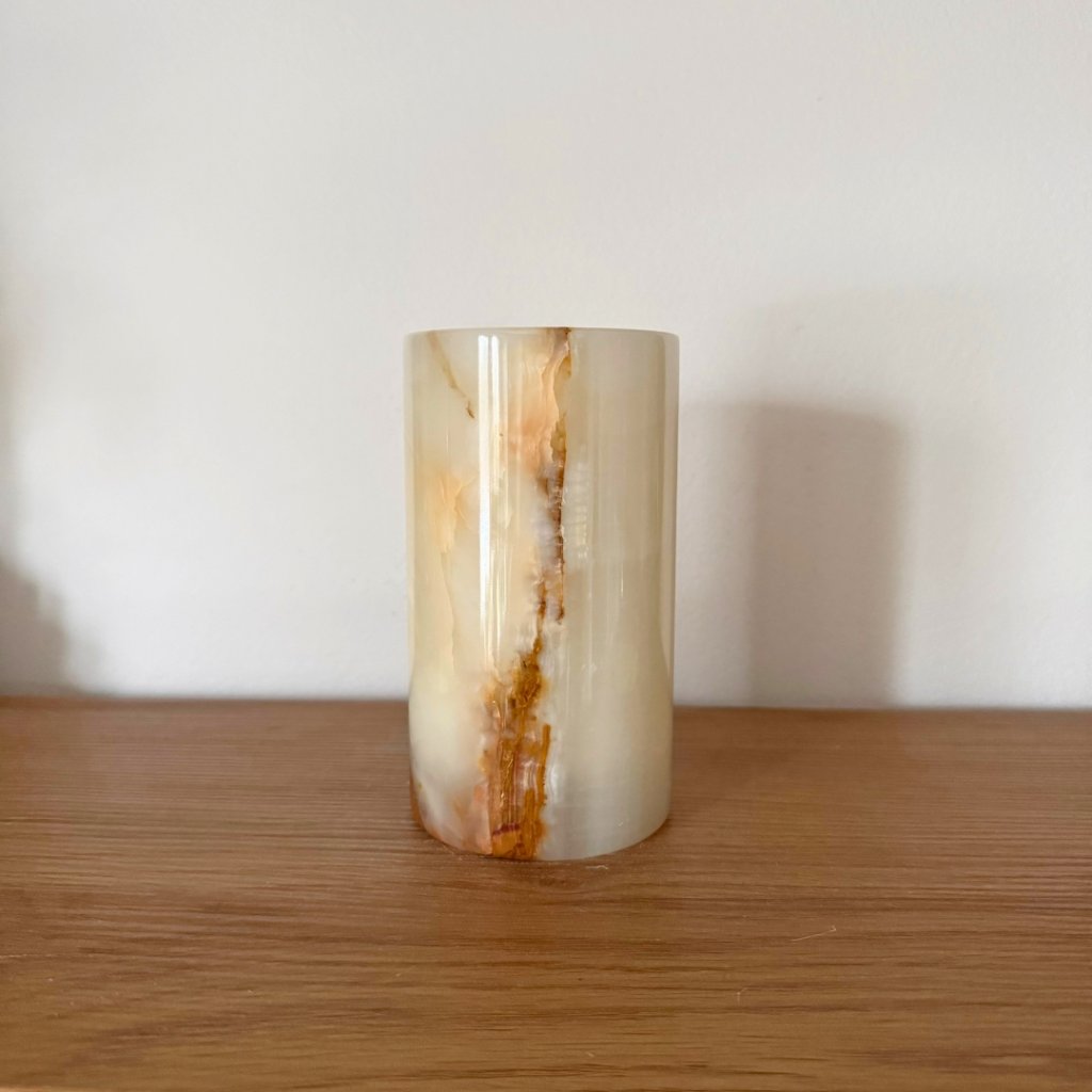 Svícen je vyroben z přírodního aragonitu, známého také jako pákistánský onyx. Tento kámen vyniká pevností, jemným leskem a přirozenou kresbou, která vznikala po tisíce let. Kupujete přesně ten svícen, který vidíte na fotografiích, žádný náhodný výběr, ale konkrétní originální kus.