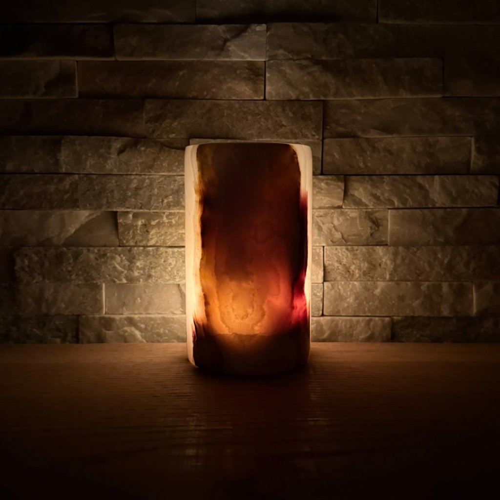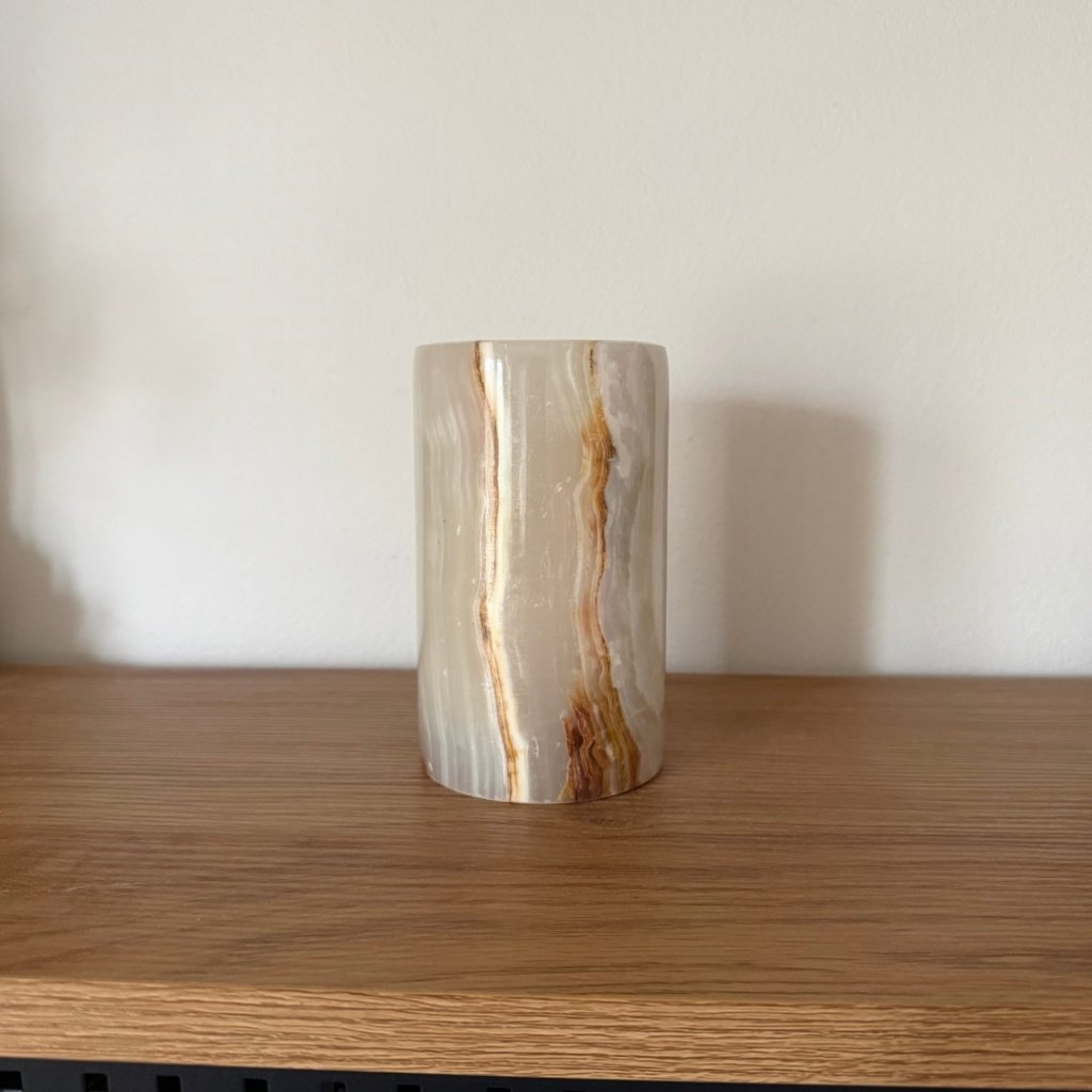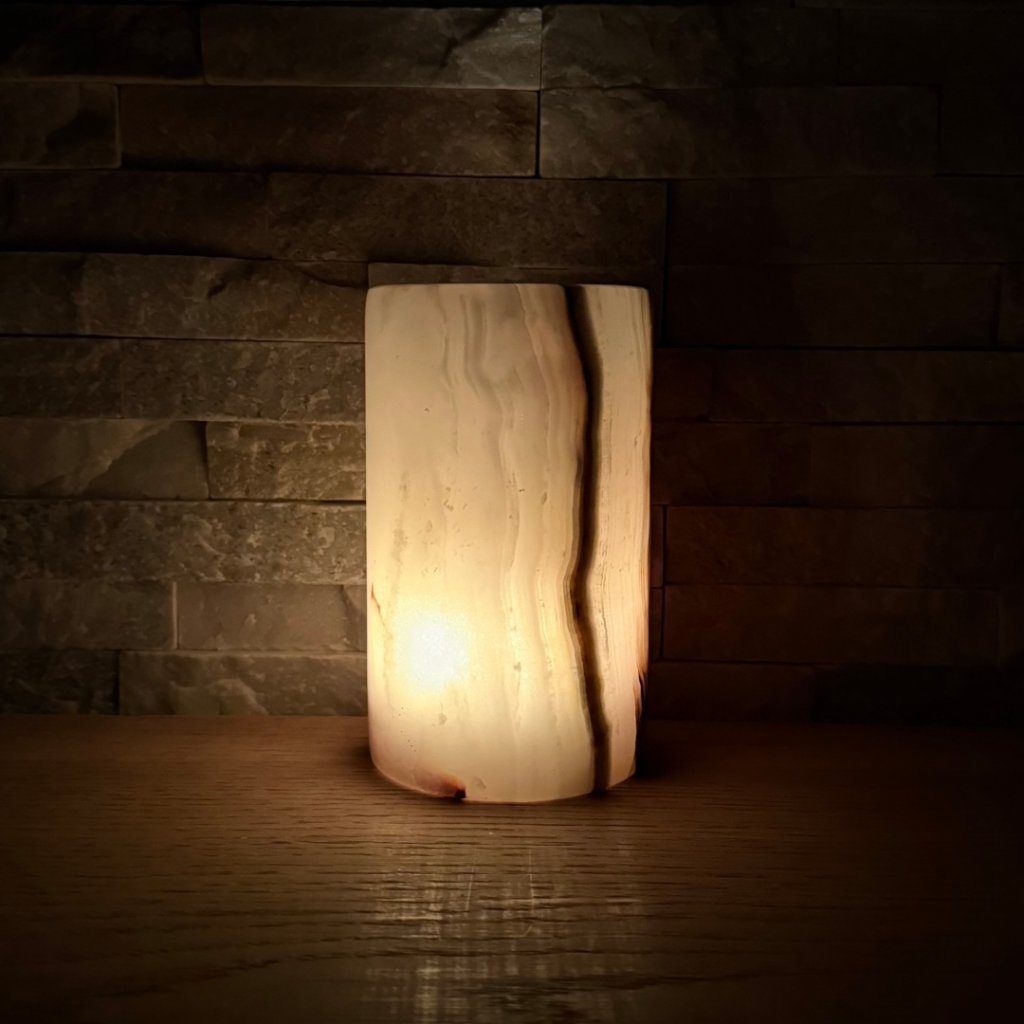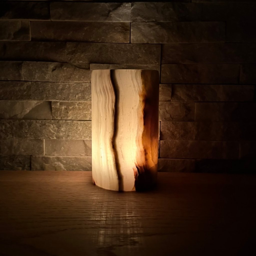 Svícen je vyroben z přírodního aragonitu, známého také jako pákistánský onyx. Tento kámen vyniká pevností, jemným leskem a přirozenou kresbou, která vznikala po tisíce let. Kupujete přesně ten svícen, který vidíte na fotografiích, žádný náhodný výběr, ale konkrétní originální kus.